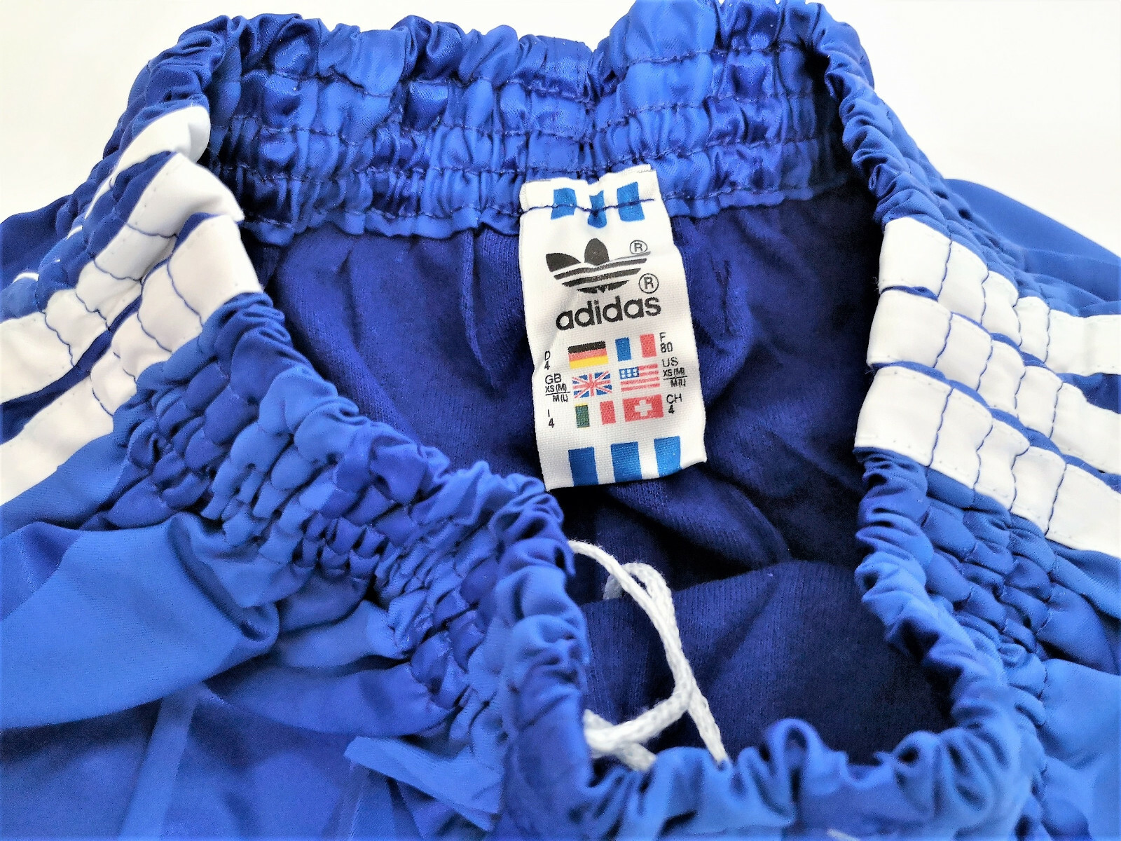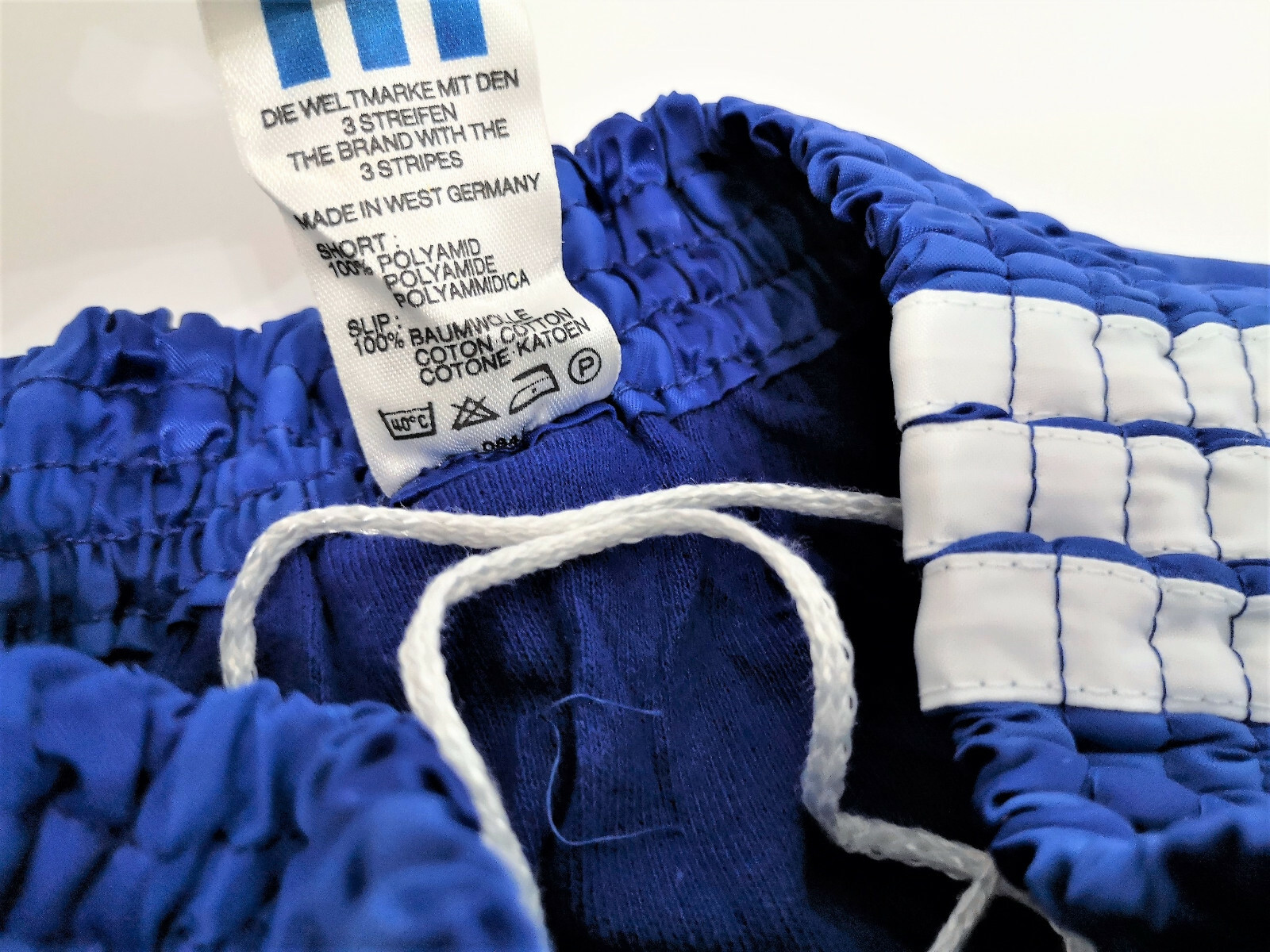 ______________________________________ Marke: adidasGröße: 90 (D6)Farbe: weiß / Streifen blauZustand: neu ______________________________________ Beschreibung:Die Short ist neu und ungetragen.Dieses Modell ist ohne Innenslip und wurde auch so produziert.Alter Lagerbestand mit leichten Lagerspuren.Altes Ventex Modell aus den 1980er Jahren.Die Größe ist mit einer französischen 90 angegeben, was einer D6 (M/L) entspricht. ______________________________________ Die ca. Maße sind wie folgt:Ungedehnte Breite: 27cmGedehnte Breite: 39cm(Maßangabe gedehnt, nicht vollständig ausgedehnt sondern immer noch etwas Luft). ______________________________________ Material:100% Polyamid