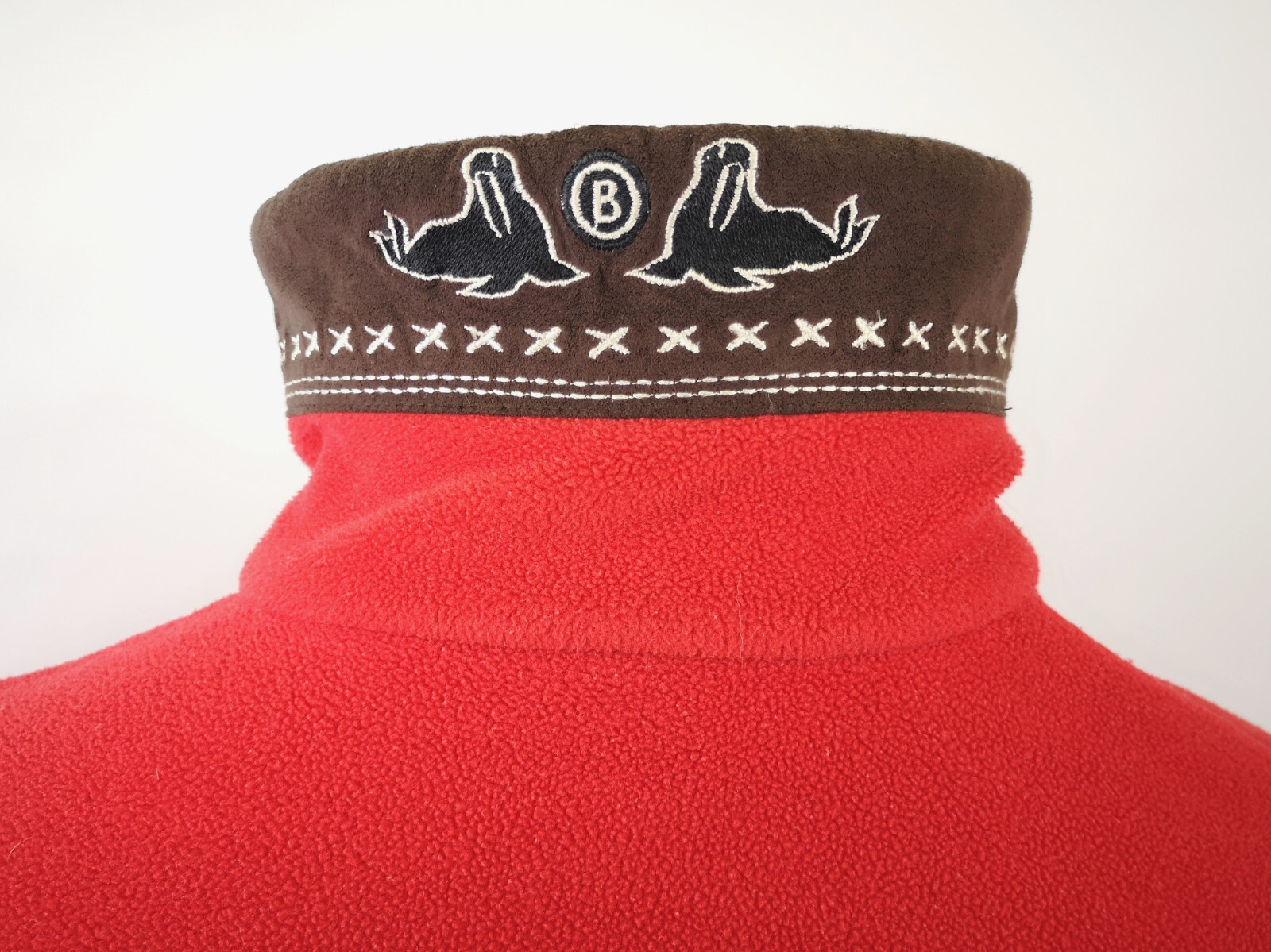 Kragen mit Wildlederbesatz und rückseitig zwei Robben gestickt.
