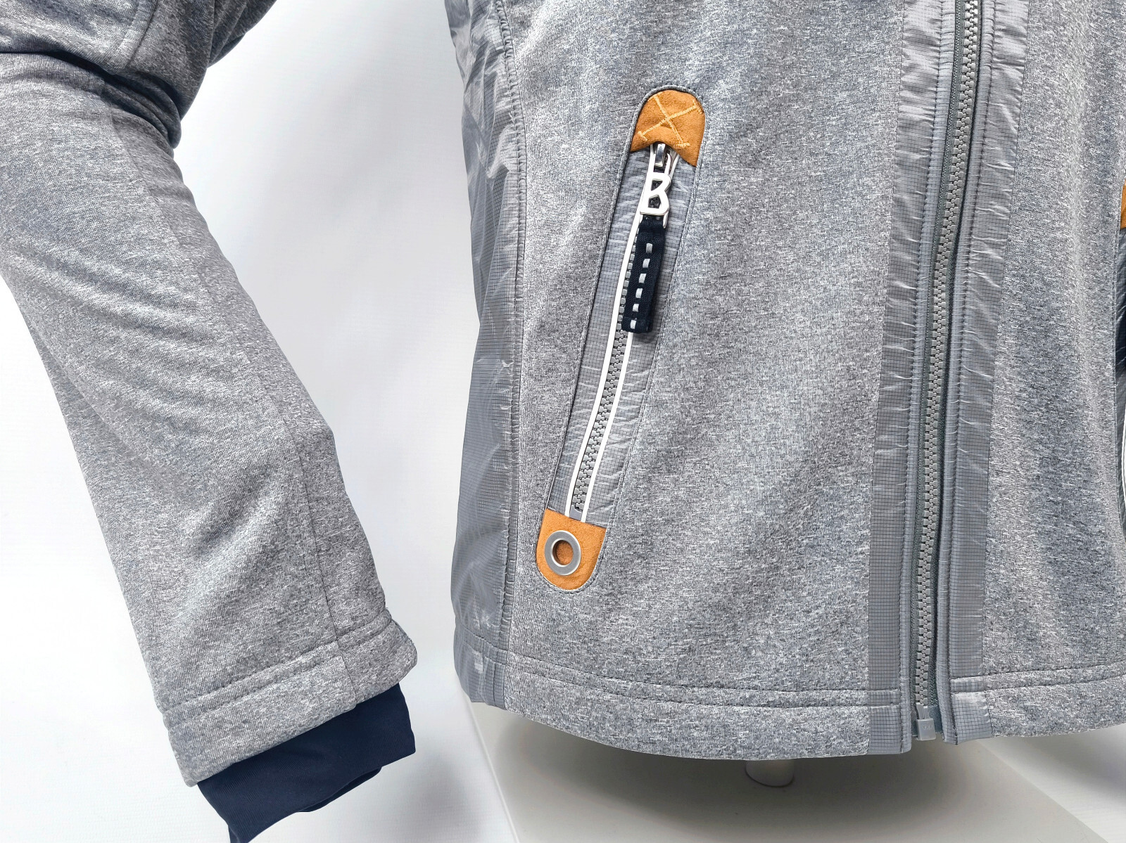 Bogner Herren Softshelljacke mit hellbraunen Applikationen an den Außentaschen.