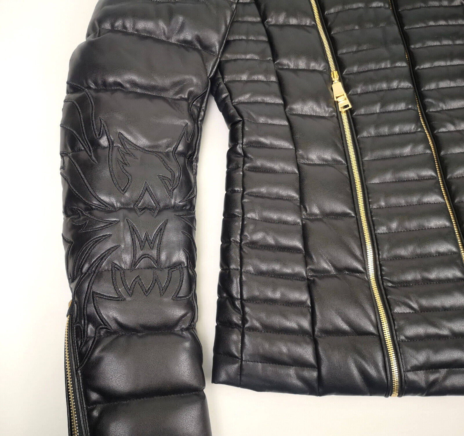Schwarze Stickereien an beiden Ärmeln.
