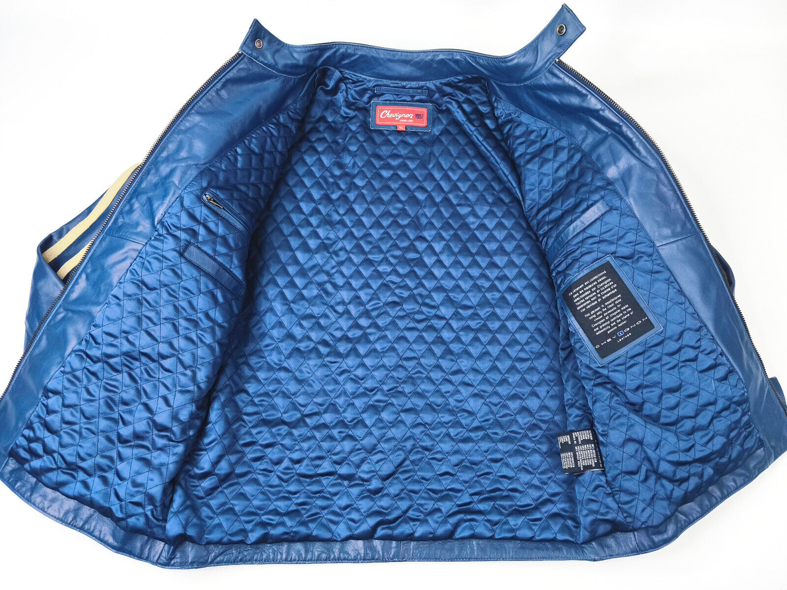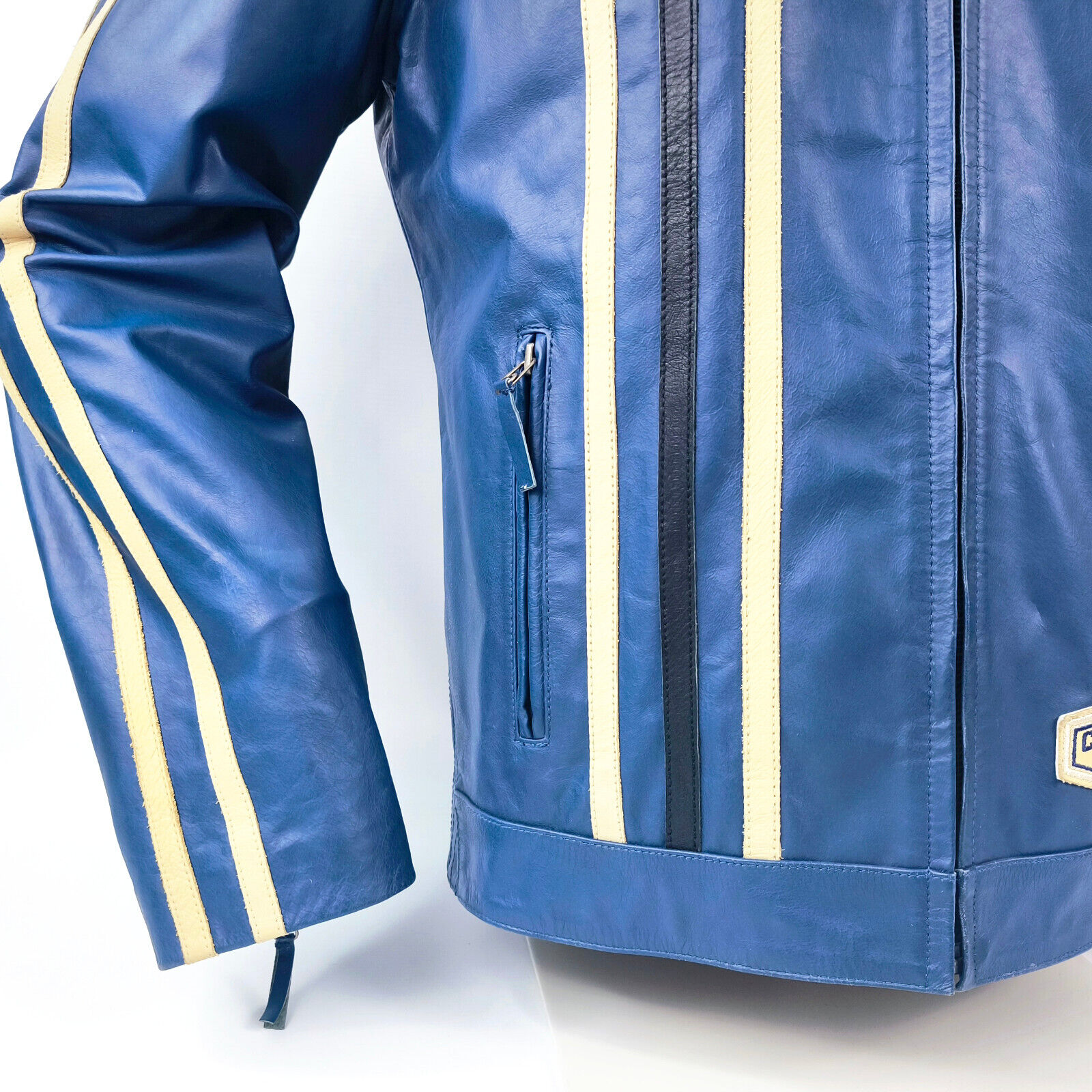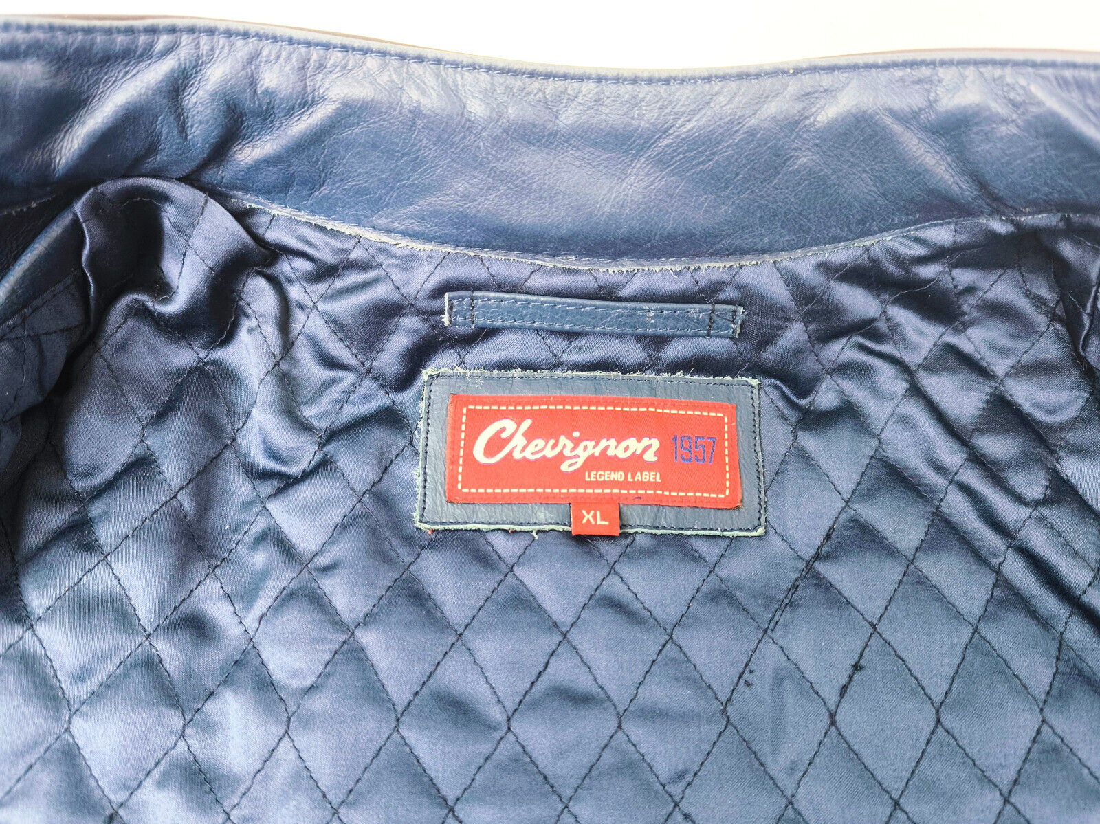 ________________________________________Marke: ChevignonFarbe: dunkelblauGröße: M Zustand: getragen_______________________________________Beschreibung:Die Jacke wurde getragen und befindet sich in einem sehr schönen Zustand. Es sind nur wenige und dann kleine Trage- und Gebrauchsspuren zu erkennen.Außen mit wenigen und kleinen Trage- und Gebrauchsspuren und super gut erhalten.Innenfutter im sehr guten Zustand.Ebenfalls die Bündchen, ganz leichte Trage- und Gebrauchsspuren und super gut erhalten.Reißverschluß funktioniert tadellos. Zwei Außen- und eine Innentasche.Lammfell / Lammleder im Kragenbereich.Lederabsetzung in schwarz an den Schultern und den Außentaschen mit wunderschöner leichter Patina.Typisch der Schnitte der damaligen Zeit, ist die Jacke im Brustbereich breit und vom Rücken her recht kurz geschnitten.Die Größe ist keine Größe zu finden. Im Vergleich mit anderen Chevignon Jacken von uns, fällt sie wie eine Größe M.Bitte die Maße prüfen für eine perfekte Passform._____________________________________Die ca. Maße sind wie folgt:Brustbreite von Achsel zu Achsel: 63cmÄrmellänge ab Höhe Schulter: 68cmRückenlänge inkl. Kragen und Bund: 67cm_______________________________________Material:Außen+Futter / Kragen / Schultern: 100% Nylon - 100% Baumwolle / 100% Lammleder / 100% Leder (Rind)_______________________________________Pflegeanleitung:professionelle Textilreinigung