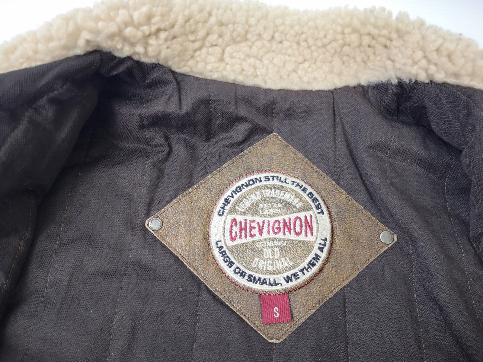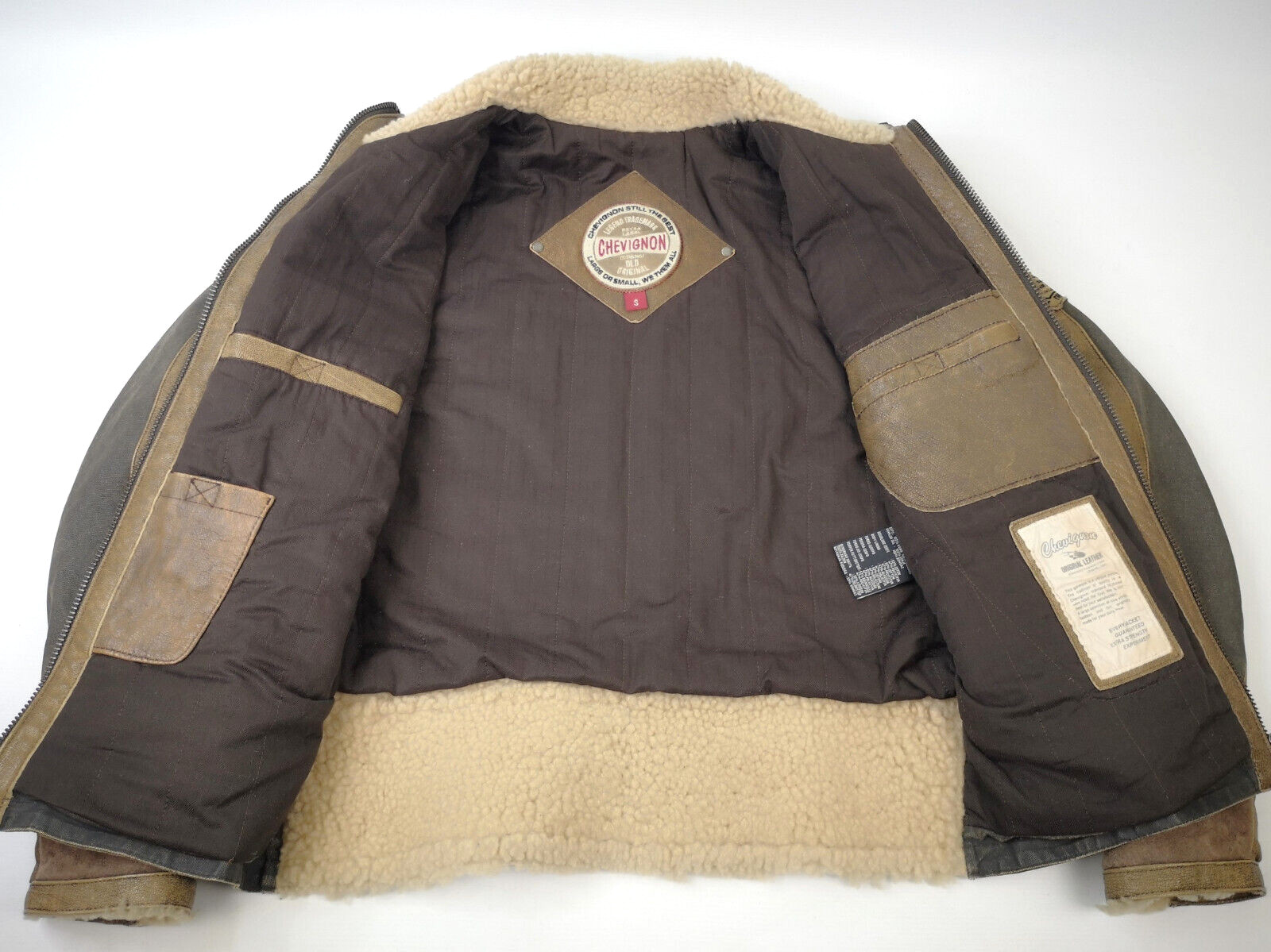 ________________________________________Marke: ChevignonGröße: L (M)Farbe: braun / braun meliert Zustand: sehr gut________________________________________Beschreibung:Die Jacke befindet sich in einem sehr guten Zustand.Es sind nur wenige und dann sehr kleine Tragespuren zu erkennen.Außenbereich Wolle innen sehr gut erhalten.Lederärmel in braun mit sehr kleinen Tragespuren und auch hier, sehr schön im Zustand.Innenfutter sehr guter Zustand.Bündchen mit leichten Tragespuren und ebenfalls, super gut erhalten.Der Hauptreißverschluß, die darüberliegende Druckknopfleiste und die Druckköpfe an den Taschen funktionieren tadellos.In der Jacke ist die Größe L angegeben. Im Vergleich mit anderen Chevignon Jacken von uns, fällt sie kleiner und fällt ganz klar aus wie eine Größe M.Die Jacke fällt recht schmal.Bitte die Maße prüfen für eine perfekte Passform.________________________________________Die ca. Maße sind wie folgt:Brustbreite von Achsel zu Achsel: 54cmÄrmellänge ab Höhe Schulter: 71cmRückenlänge inkl. Kragen und Bund: 68cm________________________________________Material lt. Innenlabel:Oberstoff Ärmel / Innenbereich: 100% Leder / 70% Wolle + 30% andere Materialien_______________________________________Pflegeanleitung:professionelle Textilreinigung