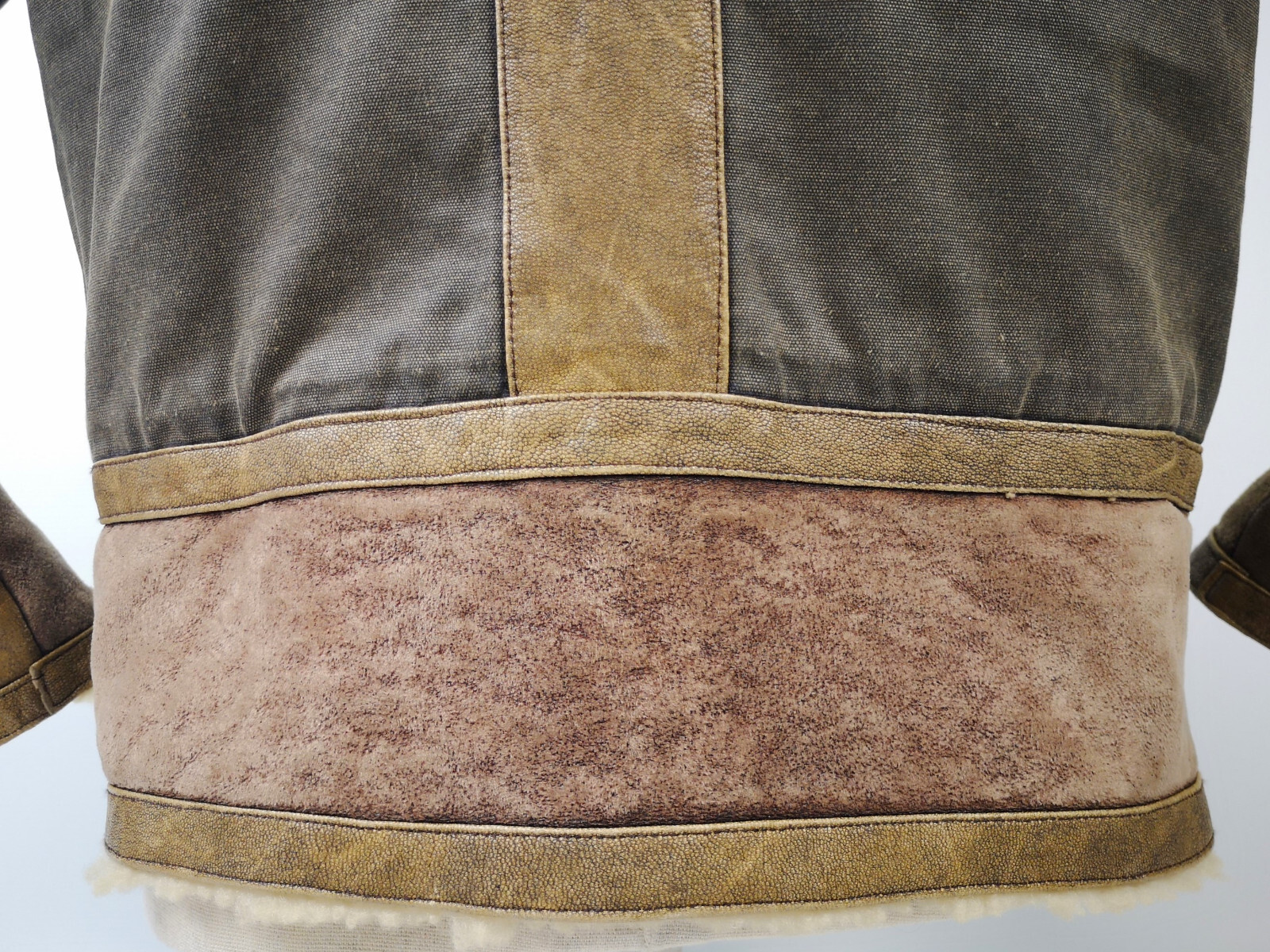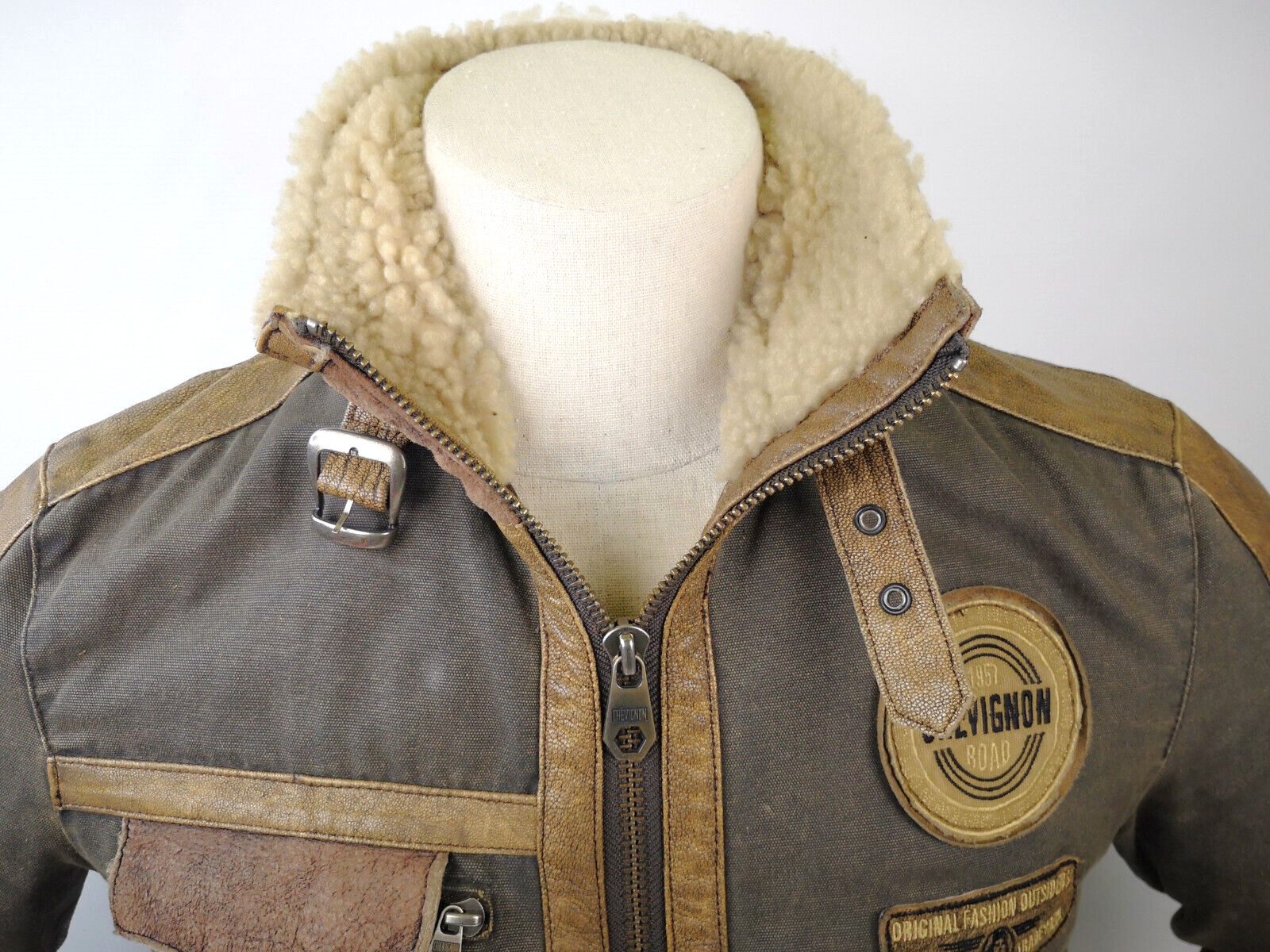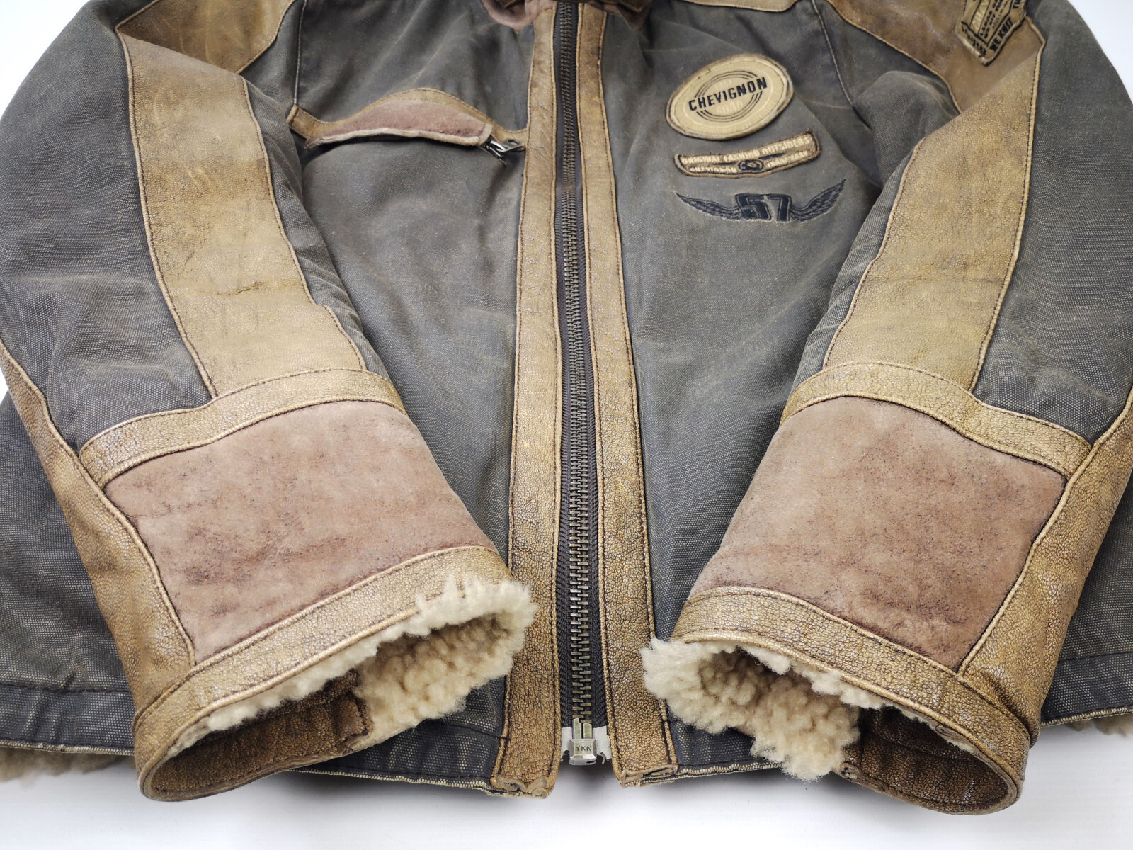 ________________________________________Marke: ChevignonModell: BoumeGröße: XXL (XL)Farbe: naturfaben Zustand: ausgezeichnet_______________________________________Beschreibung:Die Jacke befindet sich in einem ausgezeichneten Zustand. Es sind nur minimalste und nahezu nicht sichtbare Tragespuren zu erkennen.Außen sowie Innen !Reißverschlüsse und Druckknöpfe an den Taschen funktionieren tadellos.Lammfell Einsätze im Brustbereich, an den Ärmelenden und dem unteren Rücken.Braune Ledereinsätze im vorderen Bereich.Eine sehr schöne Materialkombination aus Lammfell, echtem Leder und Baumwolle.Tadelloser Zustand einer tollen Jacke !In der Jacke ist die Größe XXL angegeben. Im Vergleich mit anderen Chevignon Jacken von uns fällt sie etwas kleiner und tendiert ganz leicht zu einer Größe XL. Bitte die Maße beachten für eine perfekte Passform. _______________________________________Die ca. Maße sind wie folgt:Brustbreite von Achsel zu Achsel: 69cmÄrmellänge ab Höhe Schulter: 74cmRückenlänge inkl. Kragen und Bund: 78cm_______________________________________Material lt. Etikett:Oberstoff: 100% Leder (Lamm / Rind) / BaumwolleFutter+Füllung: 100% Polyester_______________________________________Pflegeanleitung:professionelle Textilreinigung