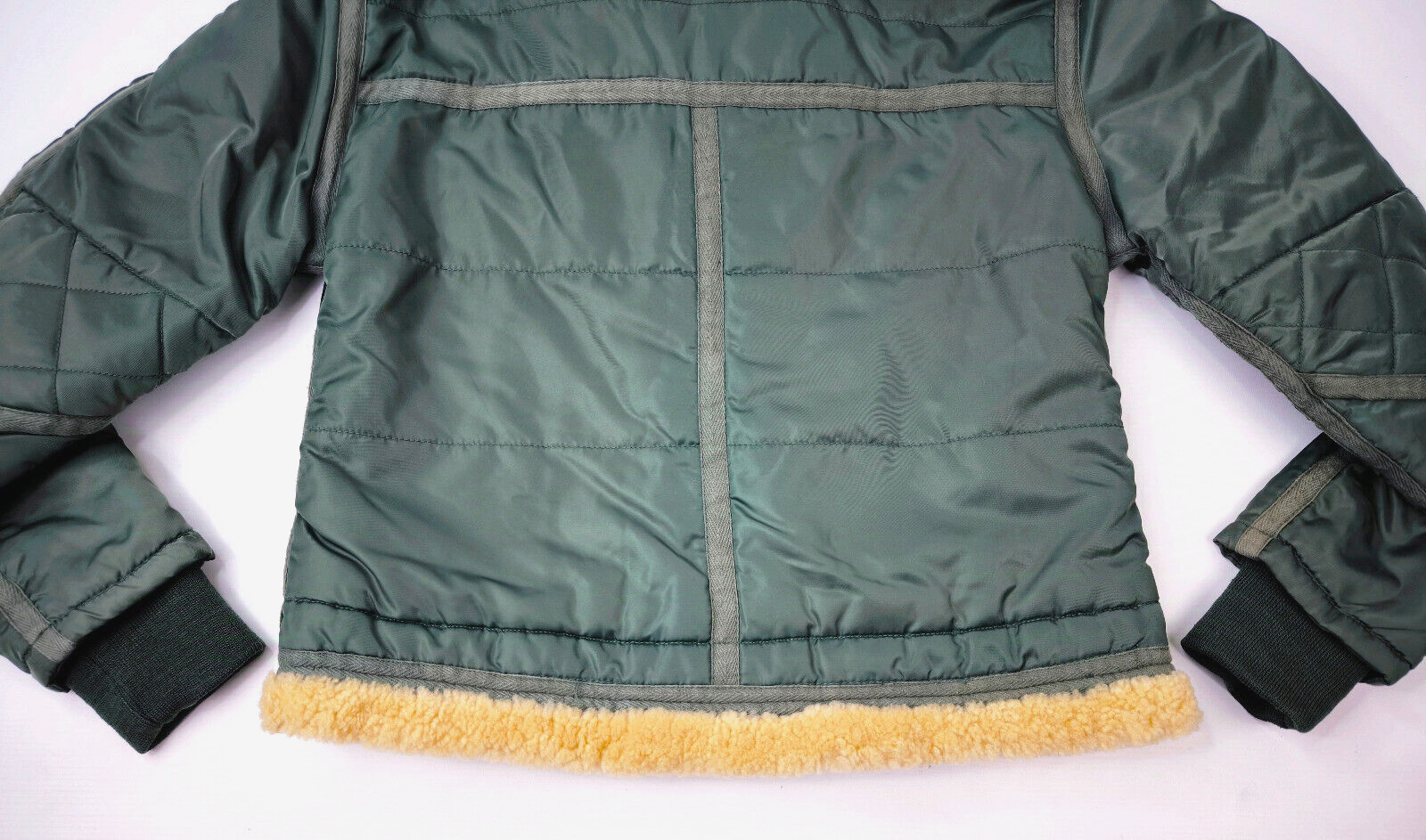 ________________________________________Marke: ChevignonGröße: LFarbe: schwarz / grün Zustand: hervorragend_______________________________________Beschreibung:Die Jacke befindet sich in einem hervorragenden Zustand.Es sind nur minimalste und sehr kleine Tragespuren zu erkennen.Leder außen mit ganz wenig Patina und sehr sehr gut erhalten.Innenfutter ebenfalls, sehr sehr gut im Zustand.Bündchen ohne wenn und aber, fantastisch erhalten.Druckknöpfe funktionieren tadellos.Eine wahnsinnig schöne Chevignon Wildleder Jacke der 1990er Jahre in einem wahnsinnig schönen Zustand !Bitte die Maße prüfen für eine perfekte Passform._______________________________________Die ca. Maße sind wie folgt:Brustbreite von Achsel zu Achsel: 64cmÄrmellänge ab Höhe Schulter: 73cmRückenlänge inkl. Kragen und Bund: 71cm_______________________________________Material lt. Etikett:Außen / Innen:100% Wildleder / 100% NylonFüllung: 100% Polyester_______________________________________Pflegeanleitung: professionelle Textilreinigung