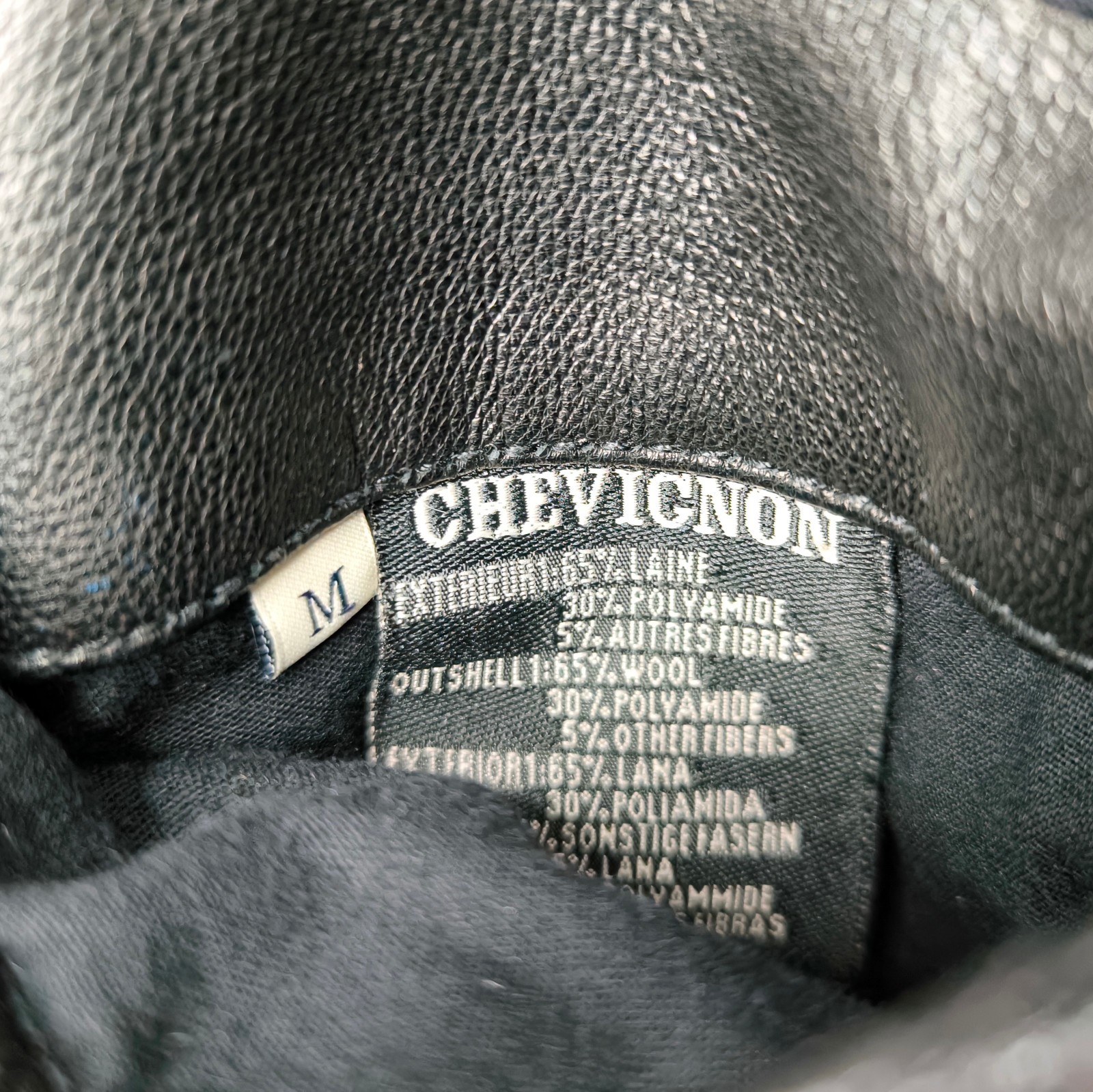 ________________________________________Marke: ChevignonFarbe: dunkelblauGröße: M Zustand: getragen_______________________________________Beschreibung:Die Jacke wurde getragen und befindet sich in einem sehr schönen Zustand. Es sind nur wenige und dann kleine Trage- und Gebrauchsspuren zu erkennen.Außen mit wenigen und kleinen Trage- und Gebrauchsspuren und super gut erhalten.Innenfutter im sehr guten Zustand.Ebenfalls die Bündchen, ganz leichte Trage- und Gebrauchsspuren und super gut erhalten.Reißverschluß funktioniert tadellos. Zwei Außen- und eine Innentasche.Lammfell / Lammleder im Kragenbereich.Lederabsetzung in schwarz an den Schultern und den Außentaschen mit wunderschöner leichter Patina.Typisch der Schnitte der damaligen Zeit, ist die Jacke im Brustbereich breit und vom Rücken her recht kurz geschnitten.Die Größe ist keine Größe zu finden. Im Vergleich mit anderen Chevignon Jacken von uns, fällt sie wie eine Größe M.Bitte die Maße prüfen für eine perfekte Passform._____________________________________Die ca. Maße sind wie folgt:Brustbreite von Achsel zu Achsel: 63cmÄrmellänge ab Höhe Schulter: 68cmRückenlänge inkl. Kragen und Bund: 67cm_______________________________________Material:Außen+Futter / Kragen / Schultern: 100% Nylon - 100% Baumwolle / 100% Lammleder / 100% Leder (Rind)_______________________________________Pflegeanleitung:professionelle Textilreinigung