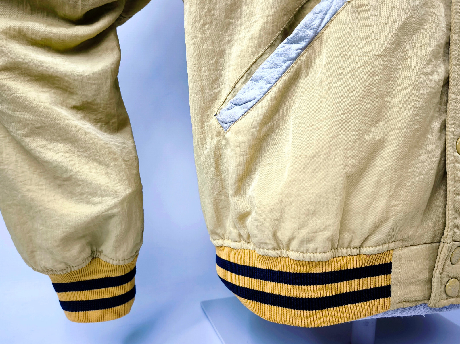 ________________________________________Marke: ChevignonGröße: MFarbe: gelb / naturZustand: sehr gut______________________________________Beschreibung:Die Jacke befindet sich in einem sehr guten Zustand !Innerer Bereich aus Wolle sehr sehr gut erhalten, ebenfalls das Innenfutter.Lederärmel aus Antikleder mit leichten Gebrauchsspuren, wunderschöner Patina und auch hier sehr schön im Zustand.Druckknöpfe schließen tadellos.Bündchen super schön im Zustand mit minimalsten und kaum sichtbaren Tragespuren.Das Modell fällt recht schmal.Bitte die Maße prüfen für eine perfekte Passform.______________________________________Die ca. Maße sind wie folgt:Brustbreite von Achsel zu Achsel: 54cmÄrmellänge ab Höhe Schulter: 68cmRückenlänge inkl. Kragen und Bund: 70cm______________________________________Material:Oberstoff:Innen: 100% WolleAußen: 100% Leder (antik)Innenfutter:100% Baumwolle______________________________________Pflegeanleitung:professionelle Textilreinigung