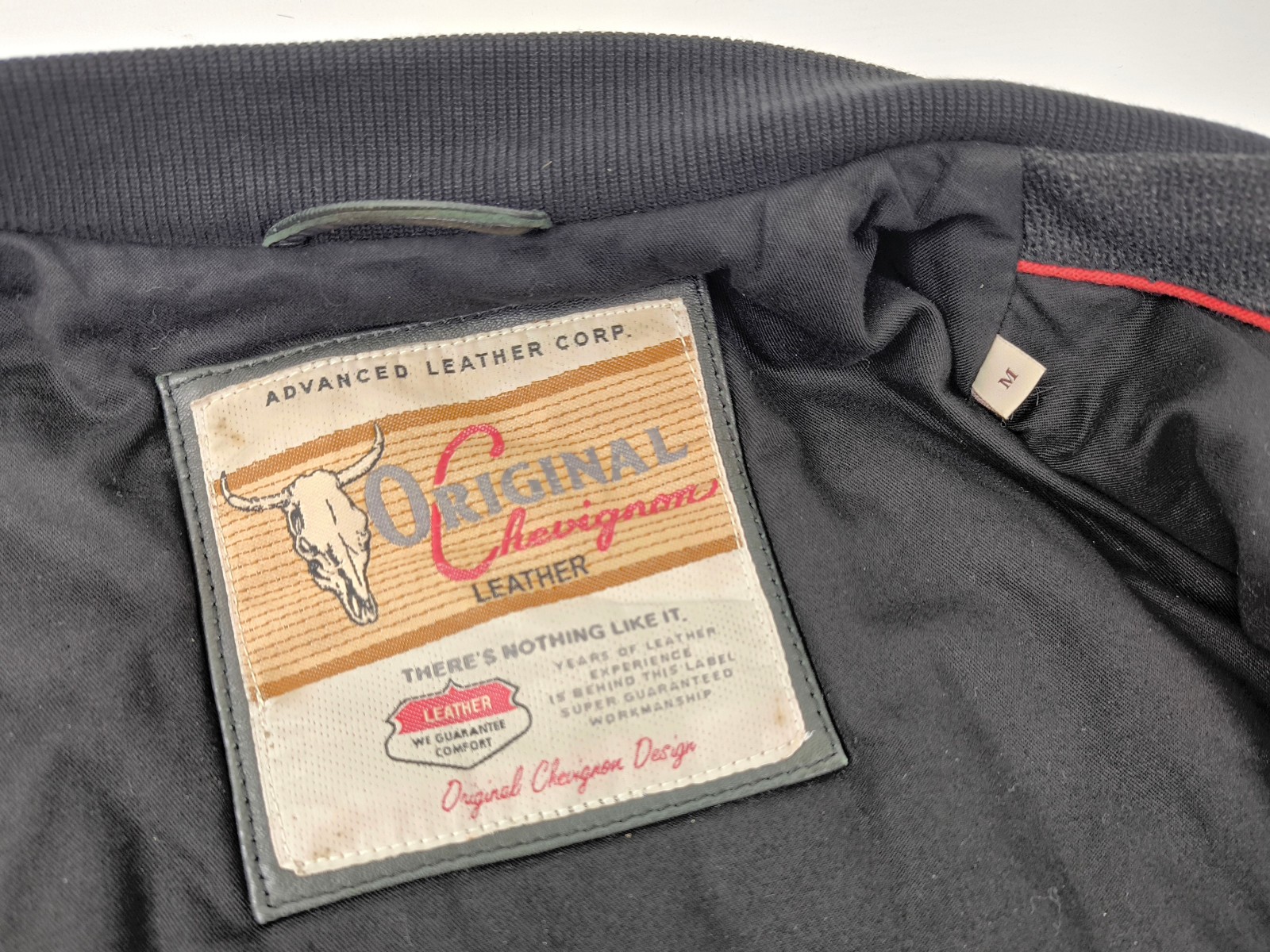 ________________________________________Marke: ChevignonFarbe: dunkelblauGröße: M Zustand: getragen_______________________________________Beschreibung:Die Jacke wurde getragen und befindet sich in einem sehr schönen Zustand. Es sind nur wenige und dann kleine Trage- und Gebrauchsspuren zu erkennen.Außen mit wenigen und kleinen Trage- und Gebrauchsspuren und super gut erhalten.Innenfutter im sehr guten Zustand.Ebenfalls die Bündchen, ganz leichte Trage- und Gebrauchsspuren und super gut erhalten.Reißverschluß funktioniert tadellos. Zwei Außen- und eine Innentasche.Lammfell / Lammleder im Kragenbereich.Lederabsetzung in schwarz an den Schultern und den Außentaschen mit wunderschöner leichter Patina.Typisch der Schnitte der damaligen Zeit, ist die Jacke im Brustbereich breit und vom Rücken her recht kurz geschnitten.Die Größe ist keine Größe zu finden. Im Vergleich mit anderen Chevignon Jacken von uns, fällt sie wie eine Größe M.Bitte die Maße prüfen für eine perfekte Passform._____________________________________Die ca. Maße sind wie folgt:Brustbreite von Achsel zu Achsel: 63cmÄrmellänge ab Höhe Schulter: 68cmRückenlänge inkl. Kragen und Bund: 67cm_______________________________________Material:Außen+Futter / Kragen / Schultern: 100% Nylon - 100% Baumwolle / 100% Lammleder / 100% Leder (Rind)_______________________________________Pflegeanleitung:professionelle Textilreinigung