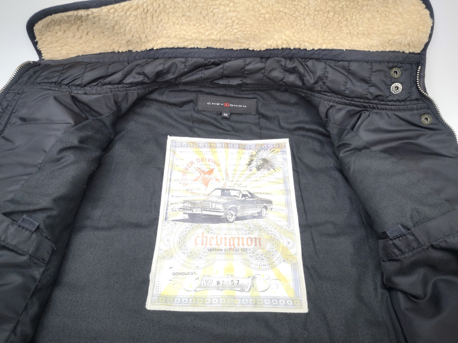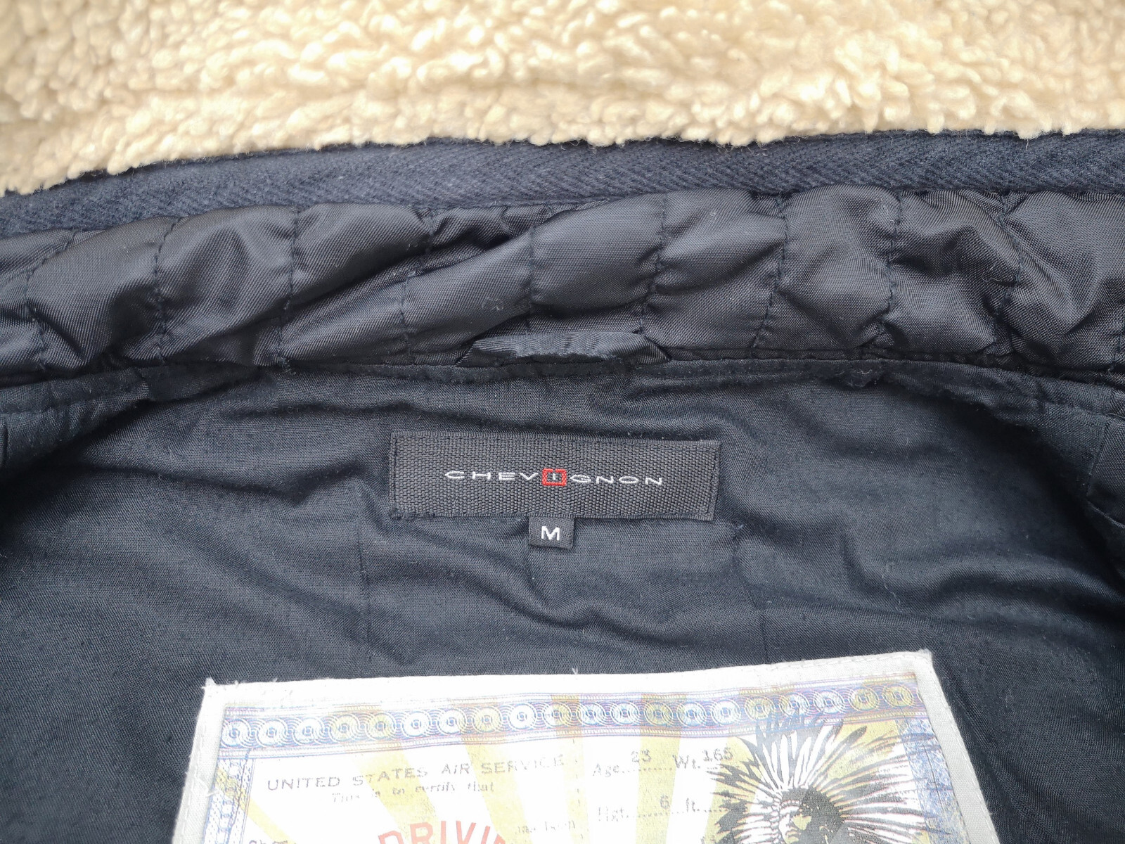 ________________________________________Marke: ChevignonFarbe: dunkelblauGröße: M Zustand: getragen_______________________________________Beschreibung:Die Jacke wurde getragen und befindet sich in einem sehr schönen Zustand. Es sind nur wenige und dann kleine Trage- und Gebrauchsspuren zu erkennen.Außen mit wenigen und kleinen Trage- und Gebrauchsspuren und super gut erhalten.Innenfutter im sehr guten Zustand.Ebenfalls die Bündchen, ganz leichte Trage- und Gebrauchsspuren und super gut erhalten.Reißverschluß funktioniert tadellos. Zwei Außen- und eine Innentasche.Lammfell / Lammleder im Kragenbereich.Lederabsetzung in schwarz an den Schultern und den Außentaschen mit wunderschöner leichter Patina.Typisch der Schnitte der damaligen Zeit, ist die Jacke im Brustbereich breit und vom Rücken her recht kurz geschnitten.Die Größe ist keine Größe zu finden. Im Vergleich mit anderen Chevignon Jacken von uns, fällt sie wie eine Größe M.Bitte die Maße prüfen für eine perfekte Passform._____________________________________Die ca. Maße sind wie folgt:Brustbreite von Achsel zu Achsel: 63cmÄrmellänge ab Höhe Schulter: 68cmRückenlänge inkl. Kragen und Bund: 67cm_______________________________________Material:Außen+Futter / Kragen / Schultern: 100% Nylon - 100% Baumwolle / 100% Lammleder / 100% Leder (Rind)_______________________________________Pflegeanleitung:professionelle Textilreinigung