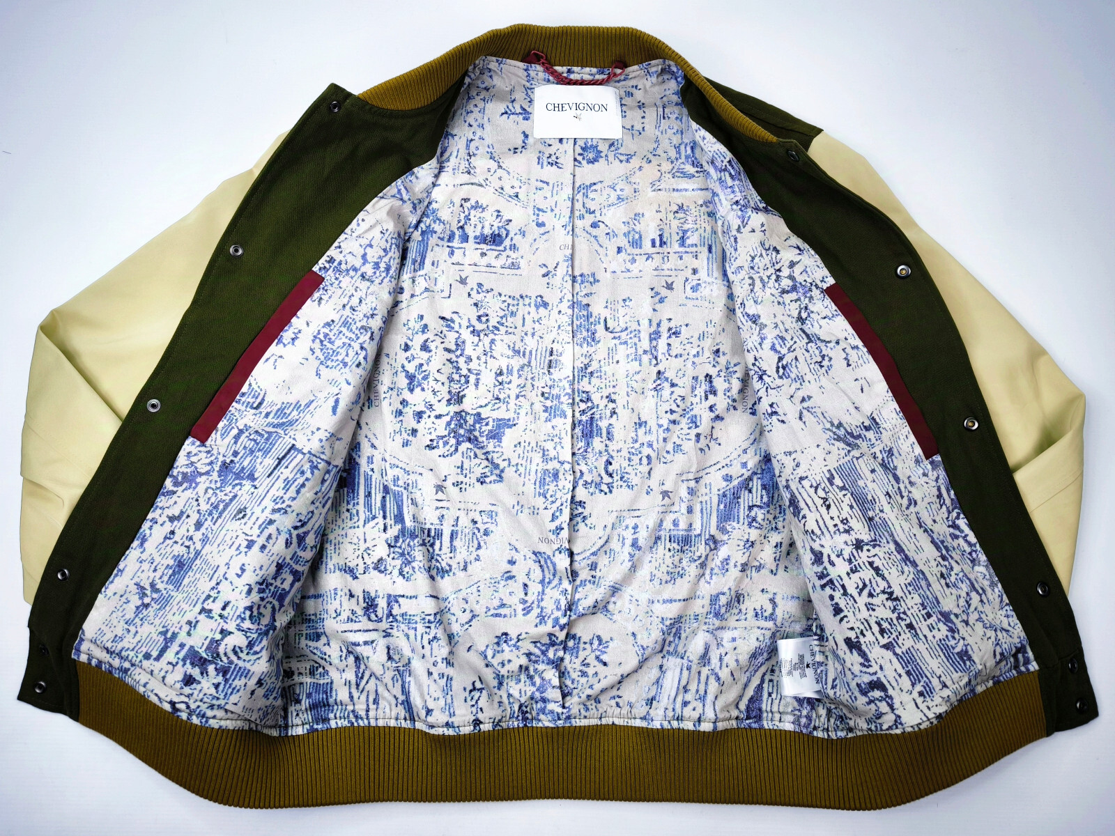 ________________________________________Marke: ChevignonFarbe: weinrot / cremeGröße: L (M) Zustand: sehr sehr gut_______________________________________Beschreibung:Die Jacke befindet sich in einem sehr sehr guten Zustand.Es sind nur minimalste und kaum sichtbare Tragespuren zu erkennen.Lederärmel im ausgezeichneten Zustand mit minimalster Patina !Innenfutter ebenfalls, sehr sehr gut erhalten !Außenbereich innen weinrot tadellos erhalten.Bündchen auch hier, sehr sehr gut im Zustand.Druckknöpfe funktionieren tadellos.Eine tolle Chevignon Jacke im College- / Baseball Stil und im super schönen Zustand !In der Jacke ist die Größe L angegeben.Im Vergleich mit anderen Chevignon Jacken von uns fällt sie kleiner und tendiert klar zur Größe M.Bitte die Maße prüfen für eine perfekte Passform._____________________________________Die ca. Maße sind wie folgt:Brustbreite von Achsel zu Achsel: 58cmÄrmellänge ab Höhe Schulter: 69cmRückenlänge inkl. Kragen und Bund: 68cm_______________________________________Material lt. Innenetikett:Außen:100% Leder ( Ärmel)80% Polyester / 15% Wolle / 5% Polyacryl (weinroter Bereich)_______________________________________Pflegeanleitung:professionelle Textilreinigung