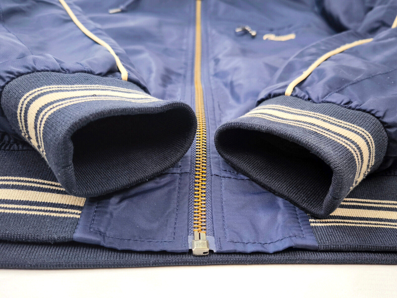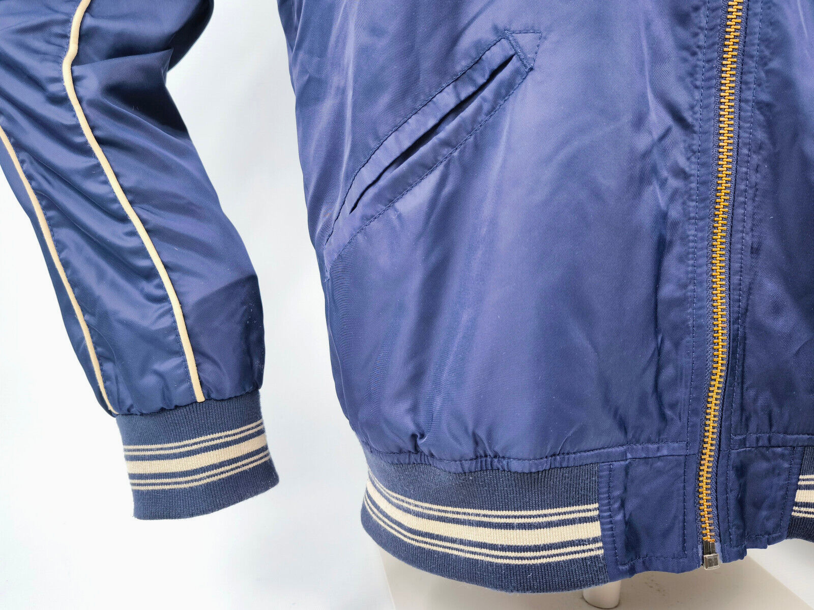 ________________________________________Marke: ChevignonFarbe: dunkelblauGröße: M (S) Zustand: getragen_______________________________________Beschreibung:Die Jacke wurden getragen und befindet sich in einem sehr schönen Zustand. Außen mit ganz leichten Trage- und Gebrauchsspuren und super gut erhalten.Innenfutter in einem sehr guten Zustand.Ebenfalls die Bündchen, sehr sehr gut erhalten !Reißverschluß und Druckknöpfe an den Taschen funktionieren tadellos. In der Jacke ist die Größe M angegeben. Im Vergleich mit anderen Chevignon Jacken von uns, fällt sie etwas kleiner und tendiert leicht zur Größe S.Typisch der Schnitte der damaligen Zeit ist sie im Brustbereich eher breit und dafür vom Rücken her kürzer geschnitten.Bitte die Maße prüfen für eine perfekte Passform._______________________________________Die ca. Maße sind wie folgt:Brustbreite von Achsel zu Achsel: 58cmÄrmellänge ab Höhe Schulter: 66cmRückenlänge inkl. Kragen und Bund: 63cm_______________________________________Material lt. Etikett:Außen / Innen: 100% Nylon_______________________________________Pflegeanleitung:Maschinenwäsche 30 Grad