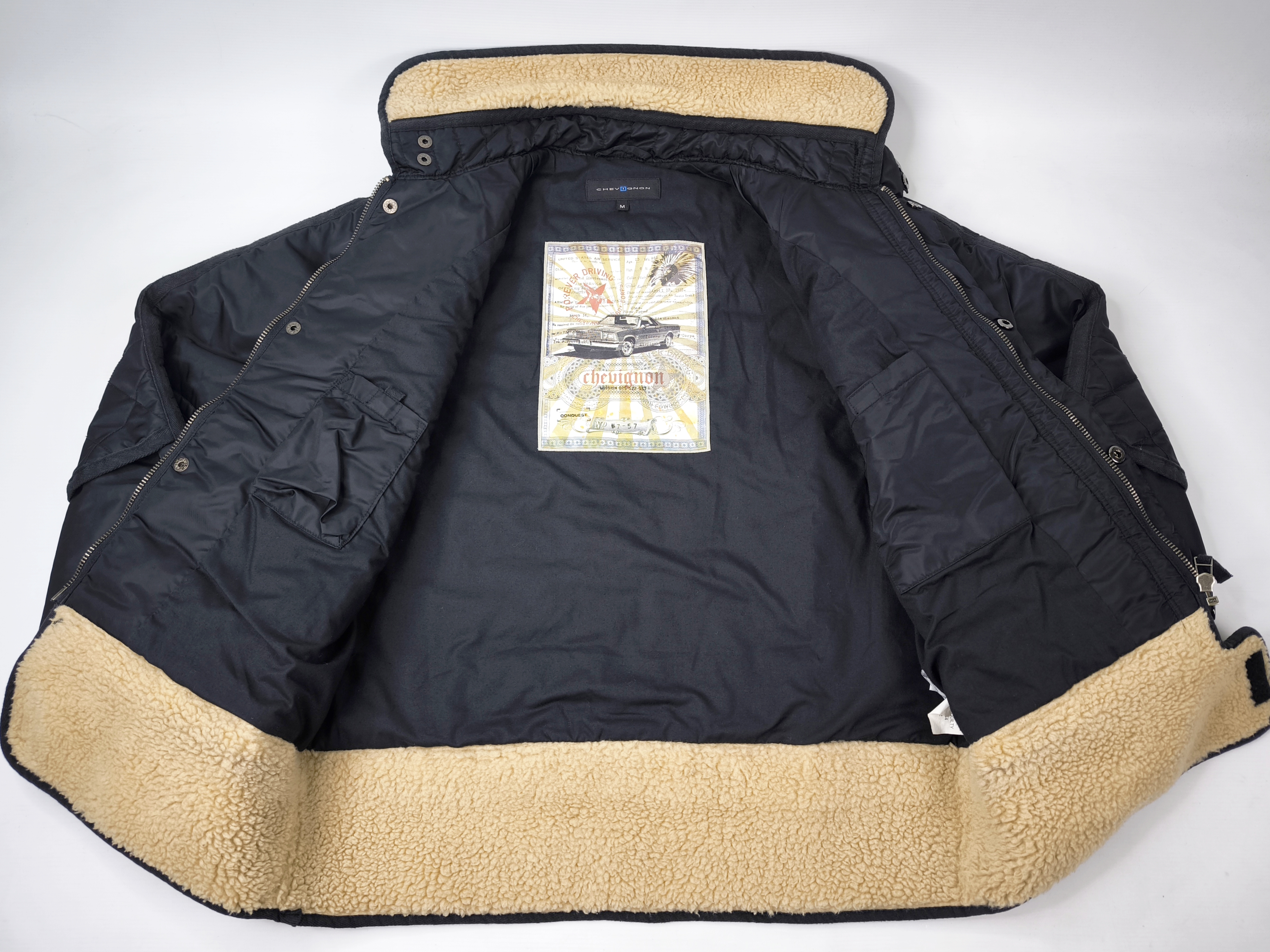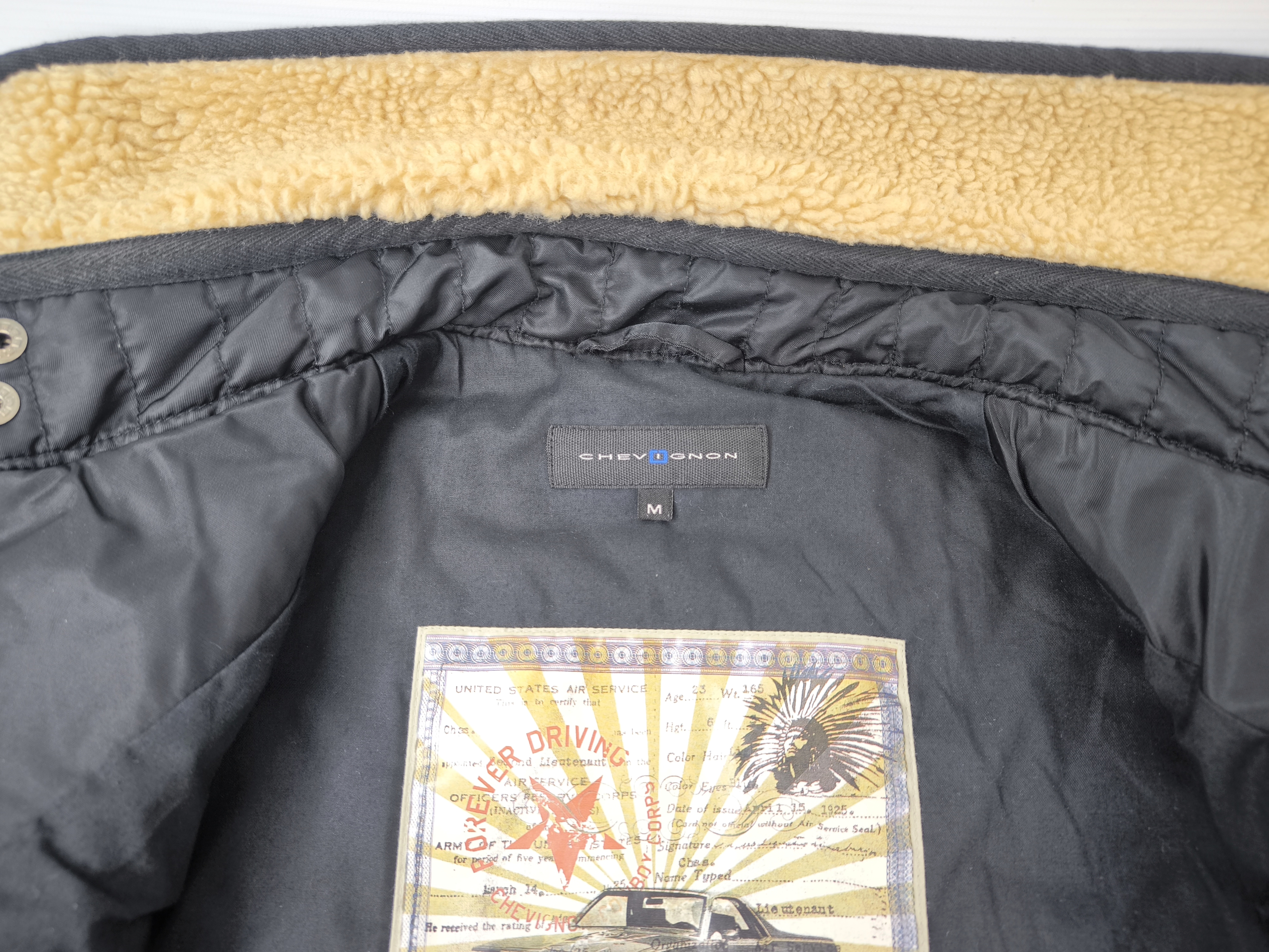 ________________________________________Marke: ChevignonFarbe: dunkelblauGröße: M Zustand: getragen_______________________________________Beschreibung:Die Jacke wurde getragen und befindet sich in einem sehr schönen Zustand. Es sind nur wenige und dann kleine Trage- und Gebrauchsspuren zu erkennen.Außen mit wenigen und kleinen Trage- und Gebrauchsspuren und super gut erhalten.Innenfutter im sehr guten Zustand.Ebenfalls die Bündchen, ganz leichte Trage- und Gebrauchsspuren und super gut erhalten.Reißverschluß funktioniert tadellos. Zwei Außen- und eine Innentasche.Lammfell / Lammleder im Kragenbereich.Lederabsetzung in schwarz an den Schultern und den Außentaschen mit wunderschöner leichter Patina.Typisch der Schnitte der damaligen Zeit, ist die Jacke im Brustbereich breit und vom Rücken her recht kurz geschnitten.Die Größe ist keine Größe zu finden. Im Vergleich mit anderen Chevignon Jacken von uns, fällt sie wie eine Größe M.Bitte die Maße prüfen für eine perfekte Passform._____________________________________Die ca. Maße sind wie folgt:Brustbreite von Achsel zu Achsel: 63cmÄrmellänge ab Höhe Schulter: 68cmRückenlänge inkl. Kragen und Bund: 67cm_______________________________________Material:Außen+Futter / Kragen / Schultern: 100% Nylon - 100% Baumwolle / 100% Lammleder / 100% Leder (Rind)_______________________________________Pflegeanleitung:professionelle Textilreinigung
