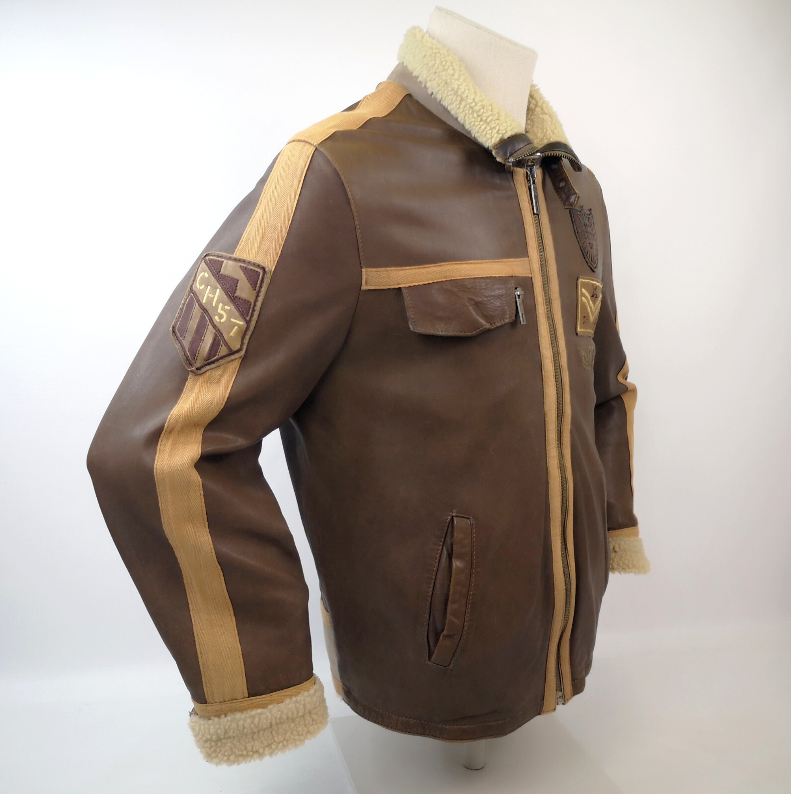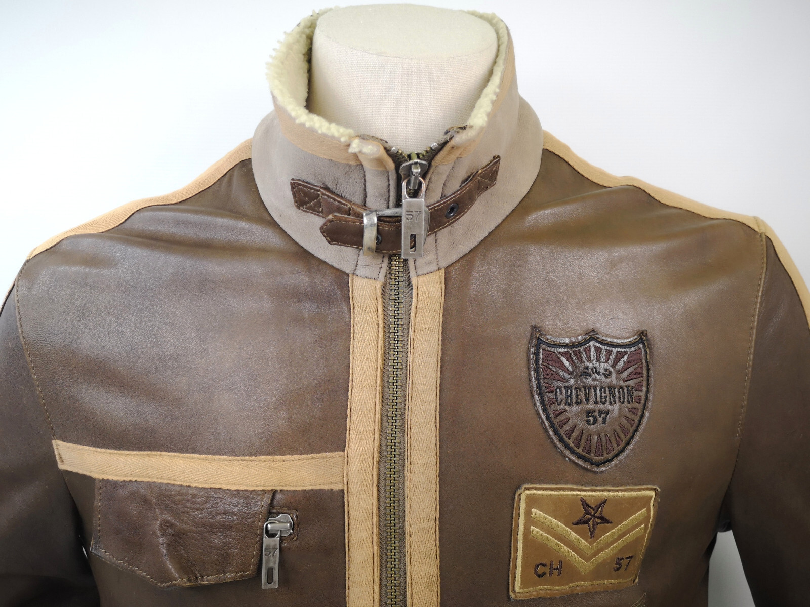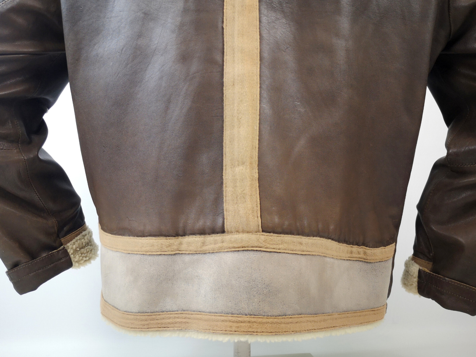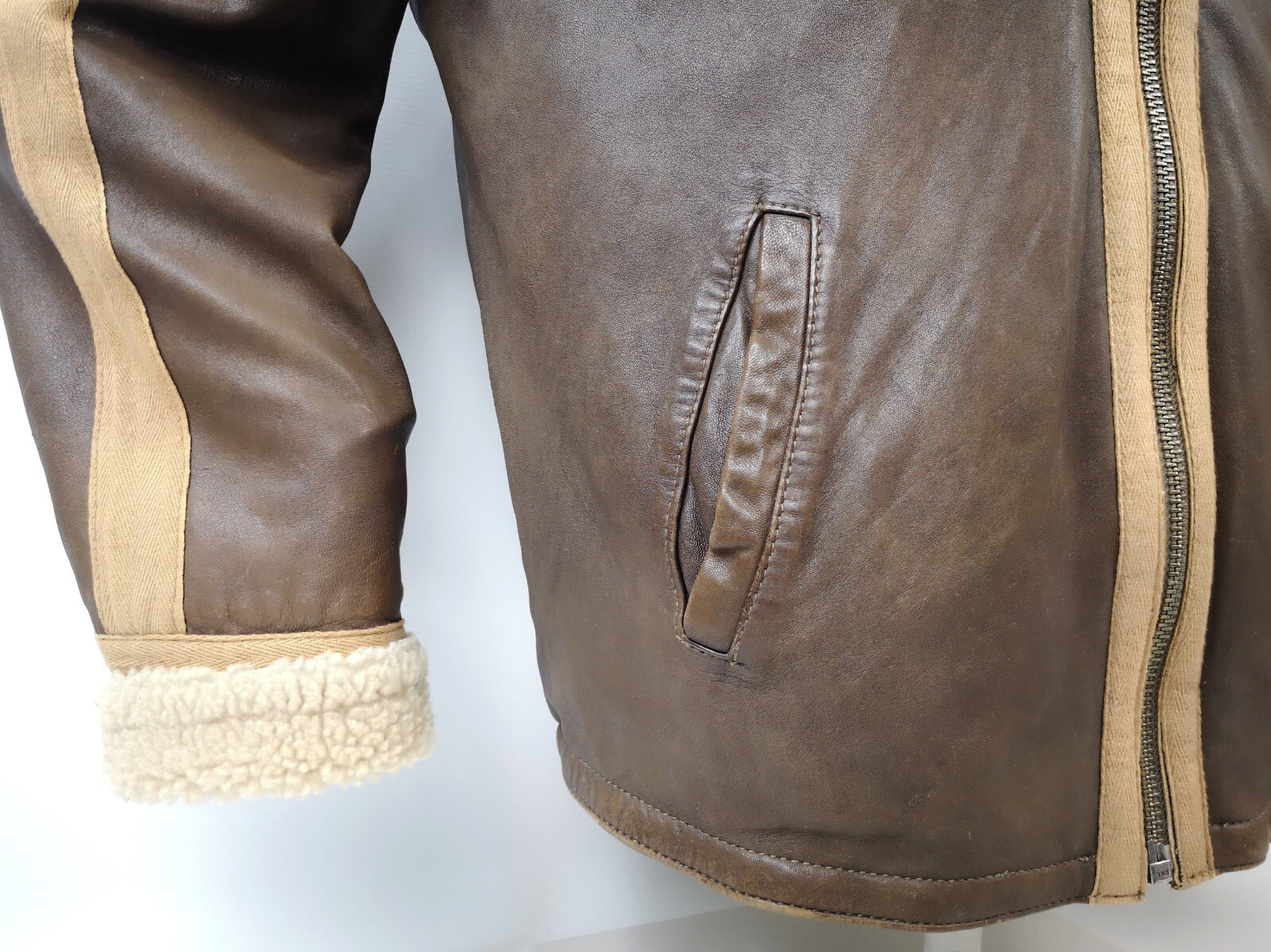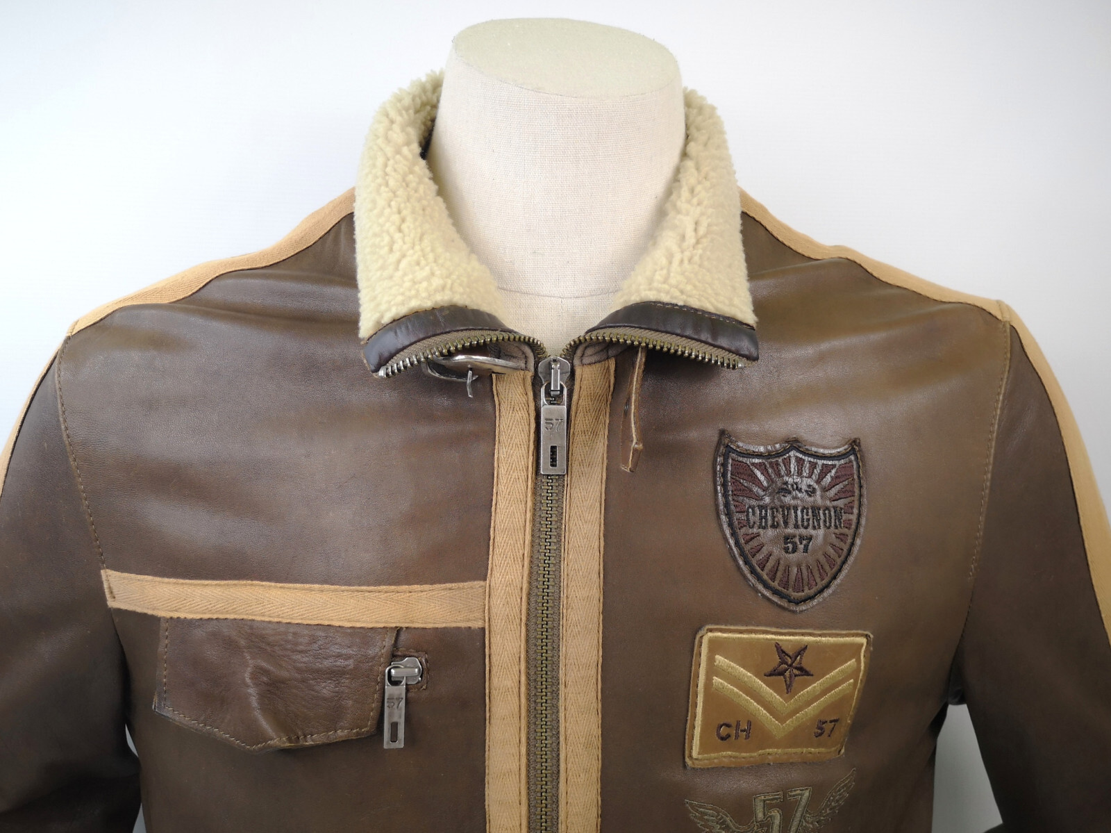 ________________________________________Marke: ChevignonModell: BoumeGröße: XXL (XL)Farbe: naturfaben Zustand: ausgezeichnet_______________________________________Beschreibung:Die Jacke befindet sich in einem ausgezeichneten Zustand. Es sind nur minimalste und nahezu nicht sichtbare Tragespuren zu erkennen.Außen sowie Innen !Reißverschlüsse und Druckknöpfe an den Taschen funktionieren tadellos.Lammfell Einsätze im Brustbereich, an den Ärmelenden und dem unteren Rücken.Braune Ledereinsätze im vorderen Bereich.Eine sehr schöne Materialkombination aus Lammfell, echtem Leder und Baumwolle.Tadelloser Zustand einer tollen Jacke !In der Jacke ist die Größe XXL angegeben. Im Vergleich mit anderen Chevignon Jacken von uns fällt sie etwas kleiner und tendiert ganz leicht zu einer Größe XL. Bitte die Maße beachten für eine perfekte Passform. _______________________________________Die ca. Maße sind wie folgt:Brustbreite von Achsel zu Achsel: 69cmÄrmellänge ab Höhe Schulter: 74cmRückenlänge inkl. Kragen und Bund: 78cm_______________________________________Material lt. Etikett:Oberstoff: 100% Leder (Lamm / Rind) / BaumwolleFutter+Füllung: 100% Polyester_______________________________________Pflegeanleitung:professionelle Textilreinigung