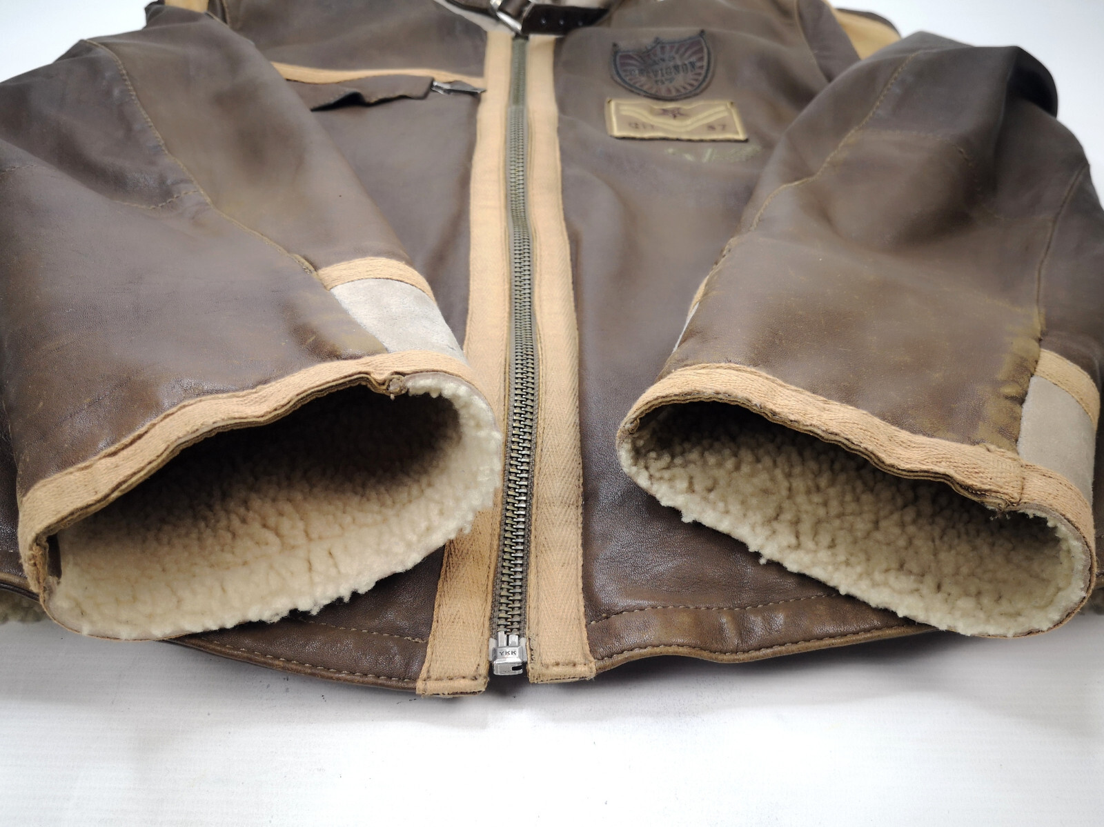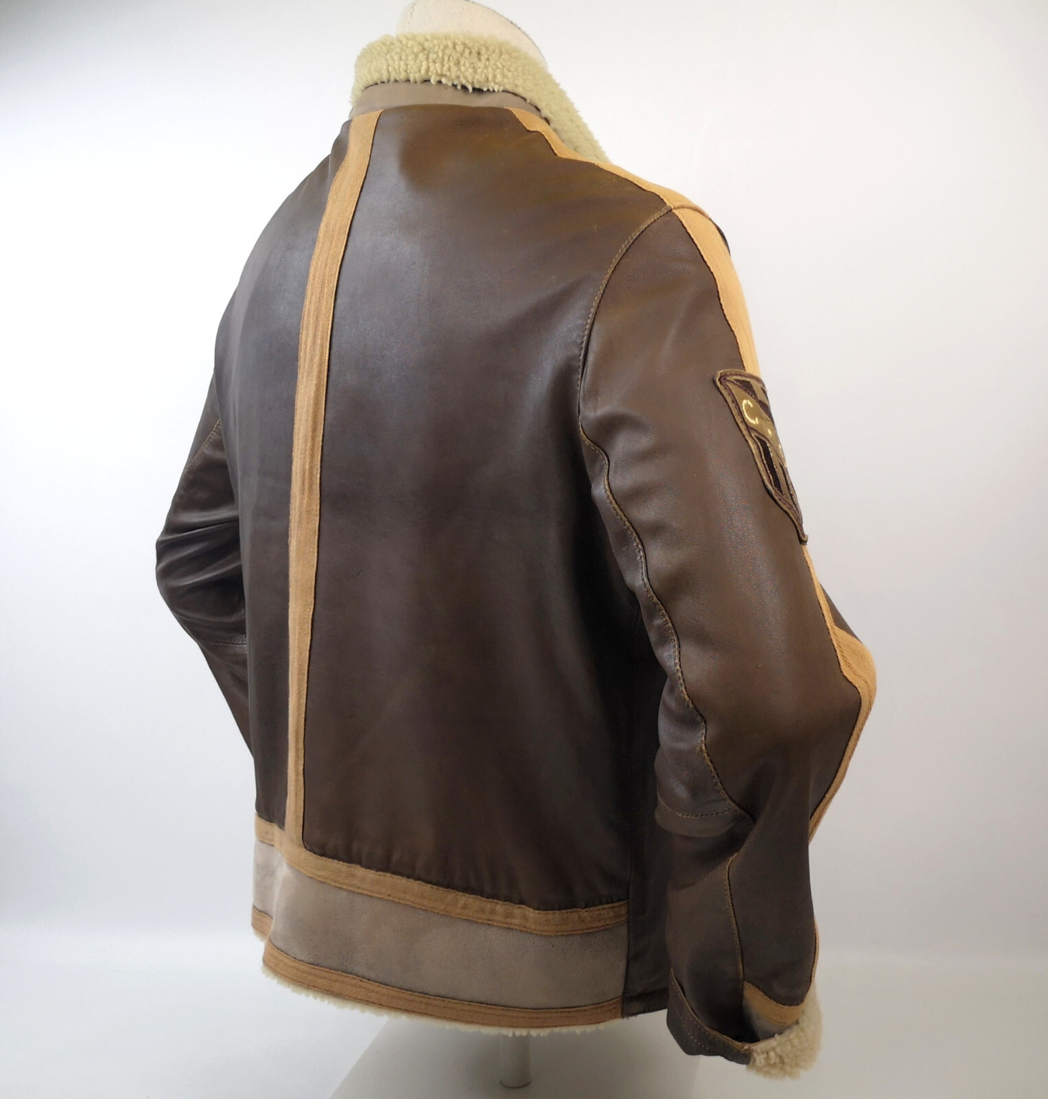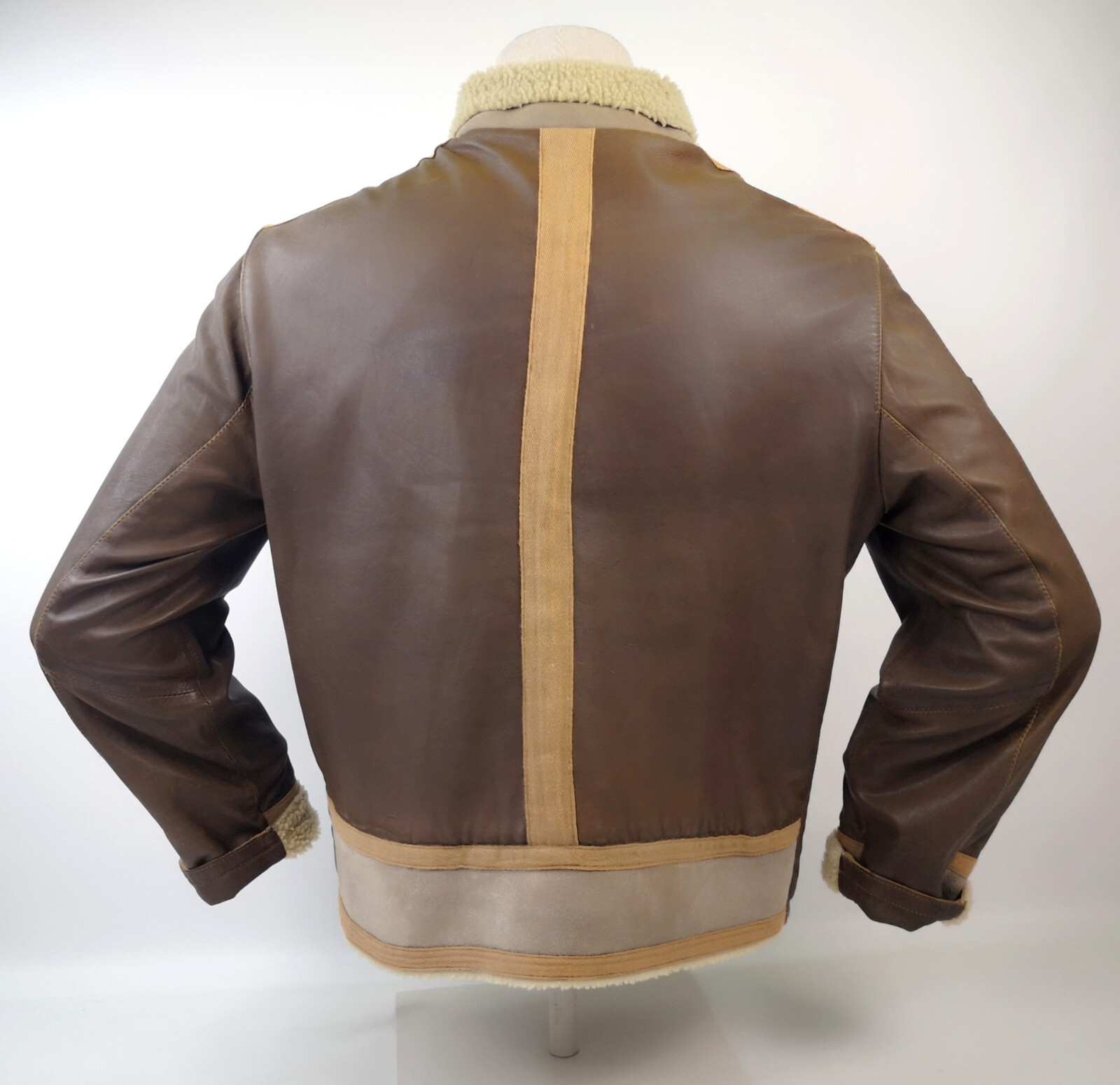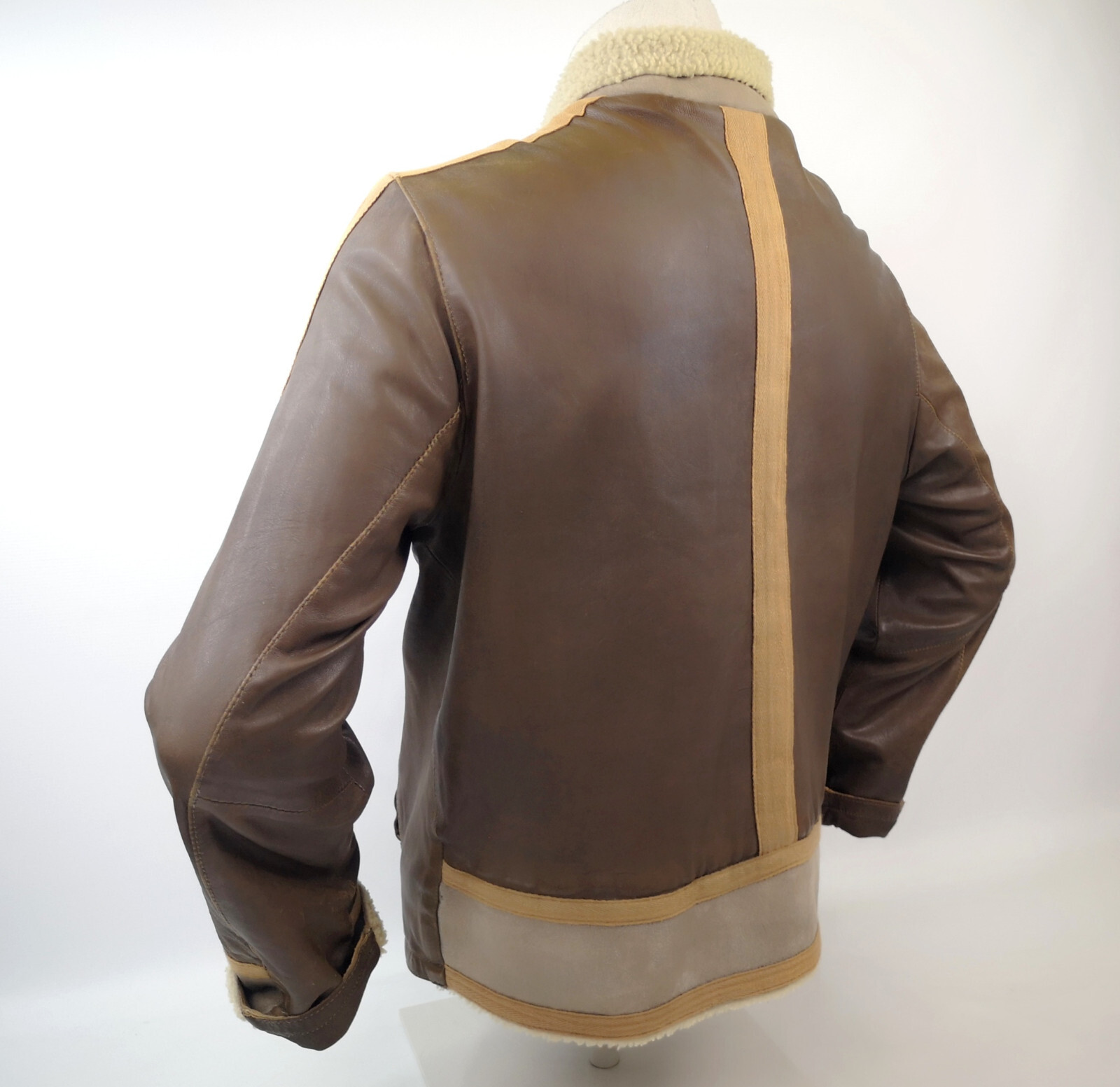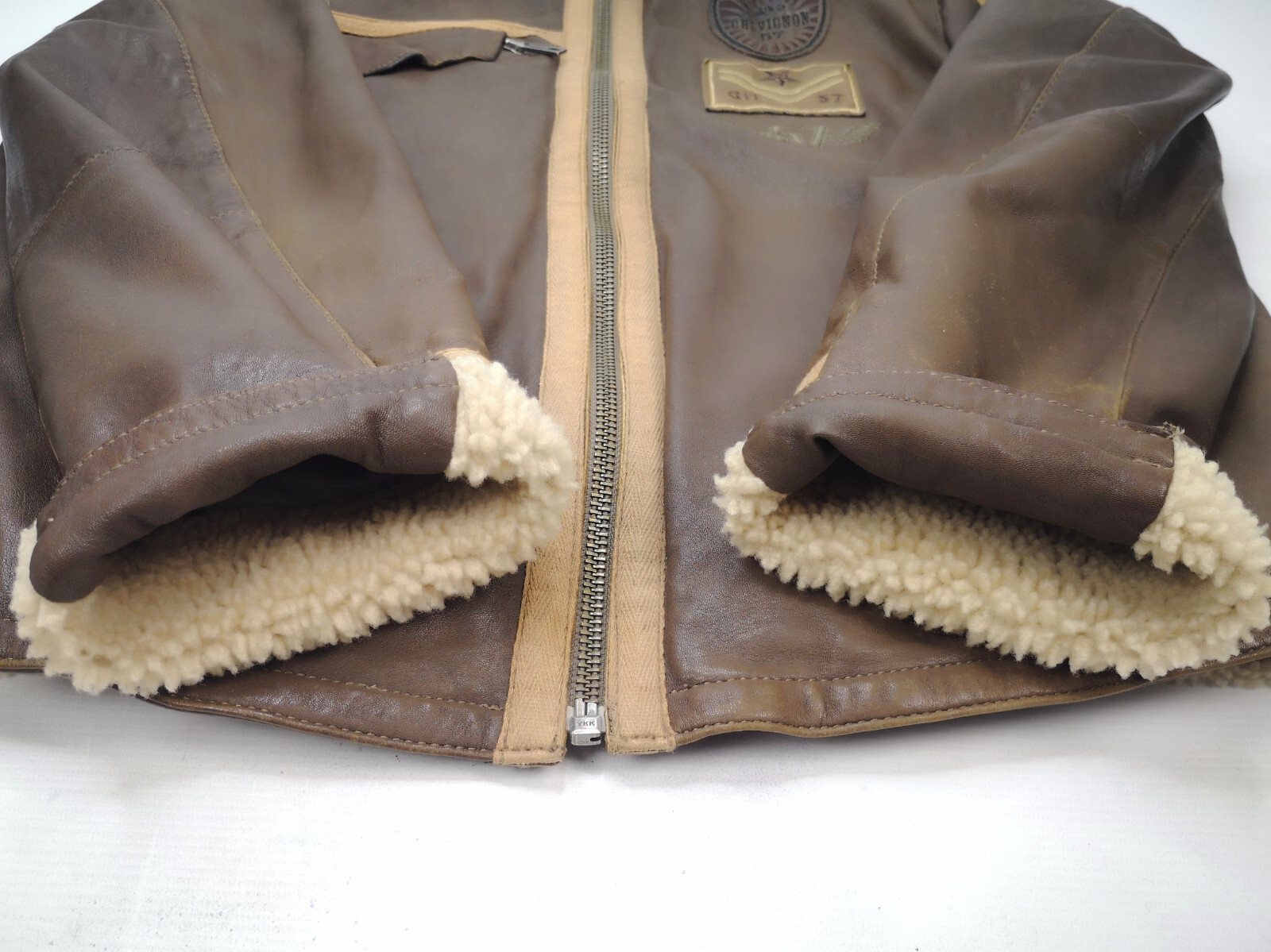 ________________________________________Marke: ChevignonModell: BoumeGröße: XXL (XL)Farbe: naturfaben Zustand: ausgezeichnet_______________________________________Beschreibung:Die Jacke befindet sich in einem ausgezeichneten Zustand. Es sind nur minimalste und nahezu nicht sichtbare Tragespuren zu erkennen.Außen sowie Innen !Reißverschlüsse und Druckknöpfe an den Taschen funktionieren tadellos.Lammfell Einsätze im Brustbereich, an den Ärmelenden und dem unteren Rücken.Braune Ledereinsätze im vorderen Bereich.Eine sehr schöne Materialkombination aus Lammfell, echtem Leder und Baumwolle.Tadelloser Zustand einer tollen Jacke !In der Jacke ist die Größe XXL angegeben. Im Vergleich mit anderen Chevignon Jacken von uns fällt sie etwas kleiner und tendiert ganz leicht zu einer Größe XL. Bitte die Maße beachten für eine perfekte Passform. _______________________________________Die ca. Maße sind wie folgt:Brustbreite von Achsel zu Achsel: 69cmÄrmellänge ab Höhe Schulter: 74cmRückenlänge inkl. Kragen und Bund: 78cm_______________________________________Material lt. Etikett:Oberstoff: 100% Leder (Lamm / Rind) / BaumwolleFutter+Füllung: 100% Polyester_______________________________________Pflegeanleitung:professionelle Textilreinigung