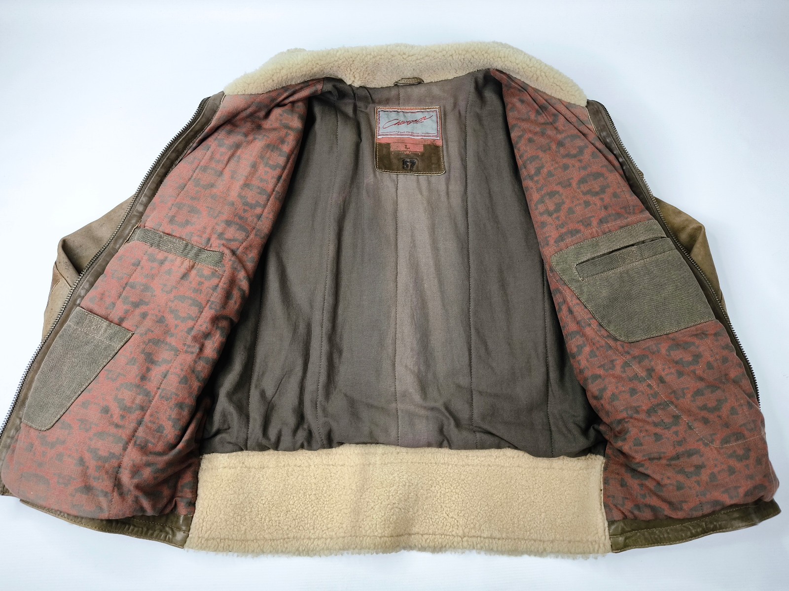 ________________________________________Marke: ChevignonGröße: LFarbe: braun Zustand: sehr gut_______________________________________Beschreibung:Die Jacke befindet sich in einem sehr guten Zustand.Leder außen mit minimaler und ganz leichter Patina und sehr gut erhalten.Sehr weiches, anschmiegsames und trotzdem sehr robustes Leder.Innenfutter und auch die Bündchen, ebenfalls sehr gut im Zustand !Reißverschlüsse und Druckknöpfe an den Innentaschen funktionieren tadellos.Ein Chevignon Flieger Blouson aus den späten 1980er Jahren.Die Jacke hat eine sehr gute Größe L und sitzt relaxed.Bitte die Maße prüfen für eine perfekte Passform._______________________________________Die ca. Maße sind wie folgt:Brustbreite von Achsel zu Achsel: 65cmÄrmellänge ab Höhe Schulter: 71cmRückenlänge inkl. Kragen und Bund: 71cm_______________________________________Material lt. Etikett:Außen / Innen:100% Leder / 100% Baumwolle-AcetatFüllung: 100% Polyester_______________________________________Pflegeanleitung: professionelle Textilreinigung
