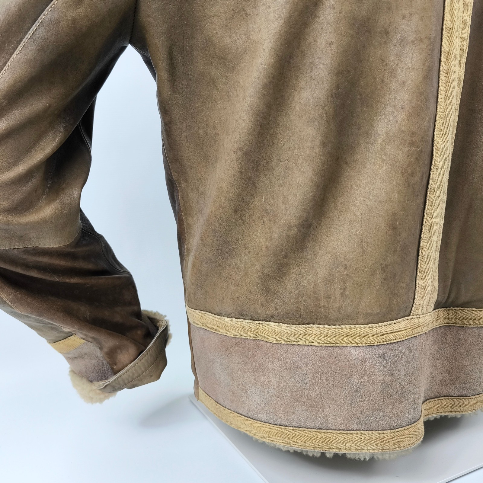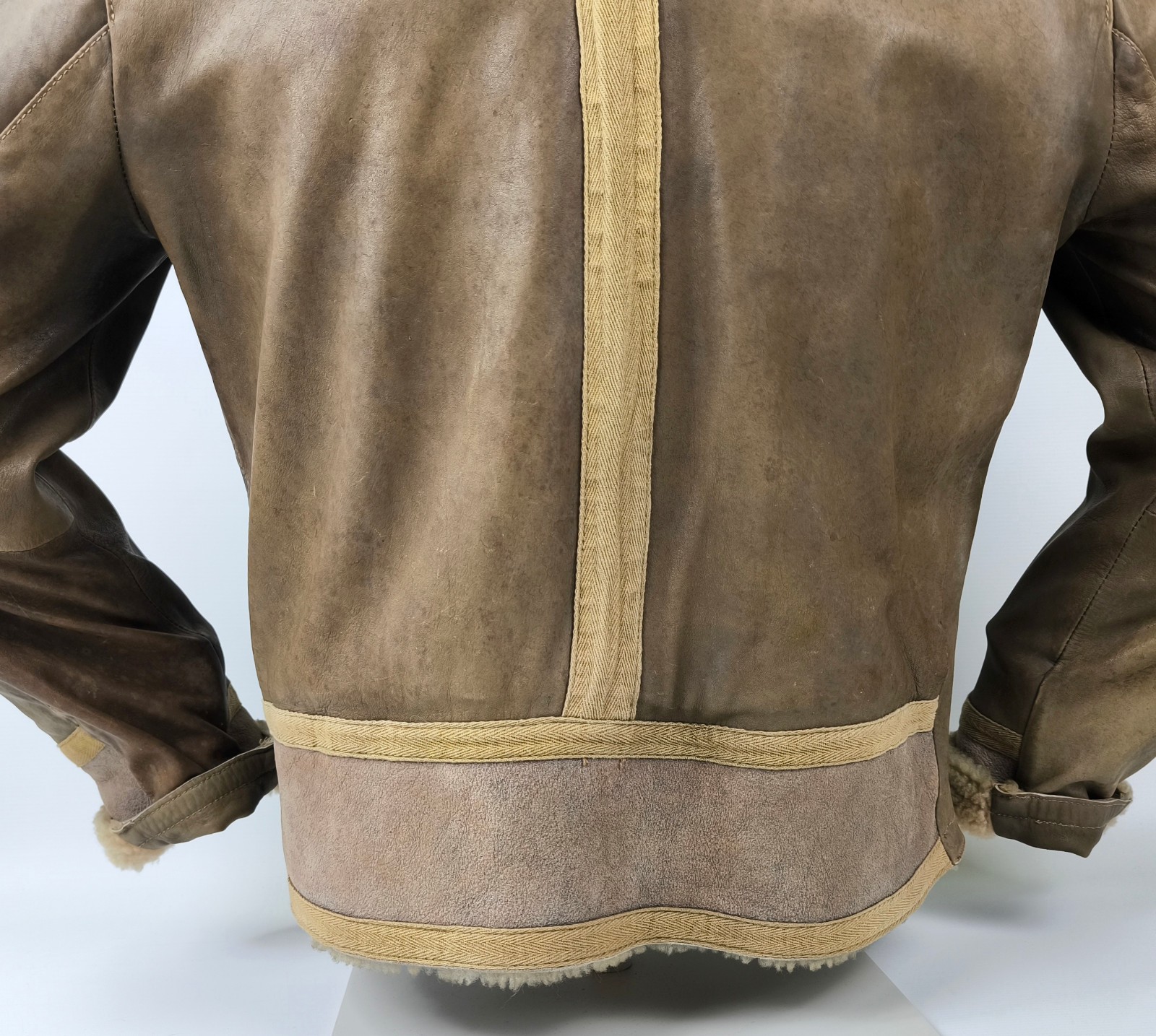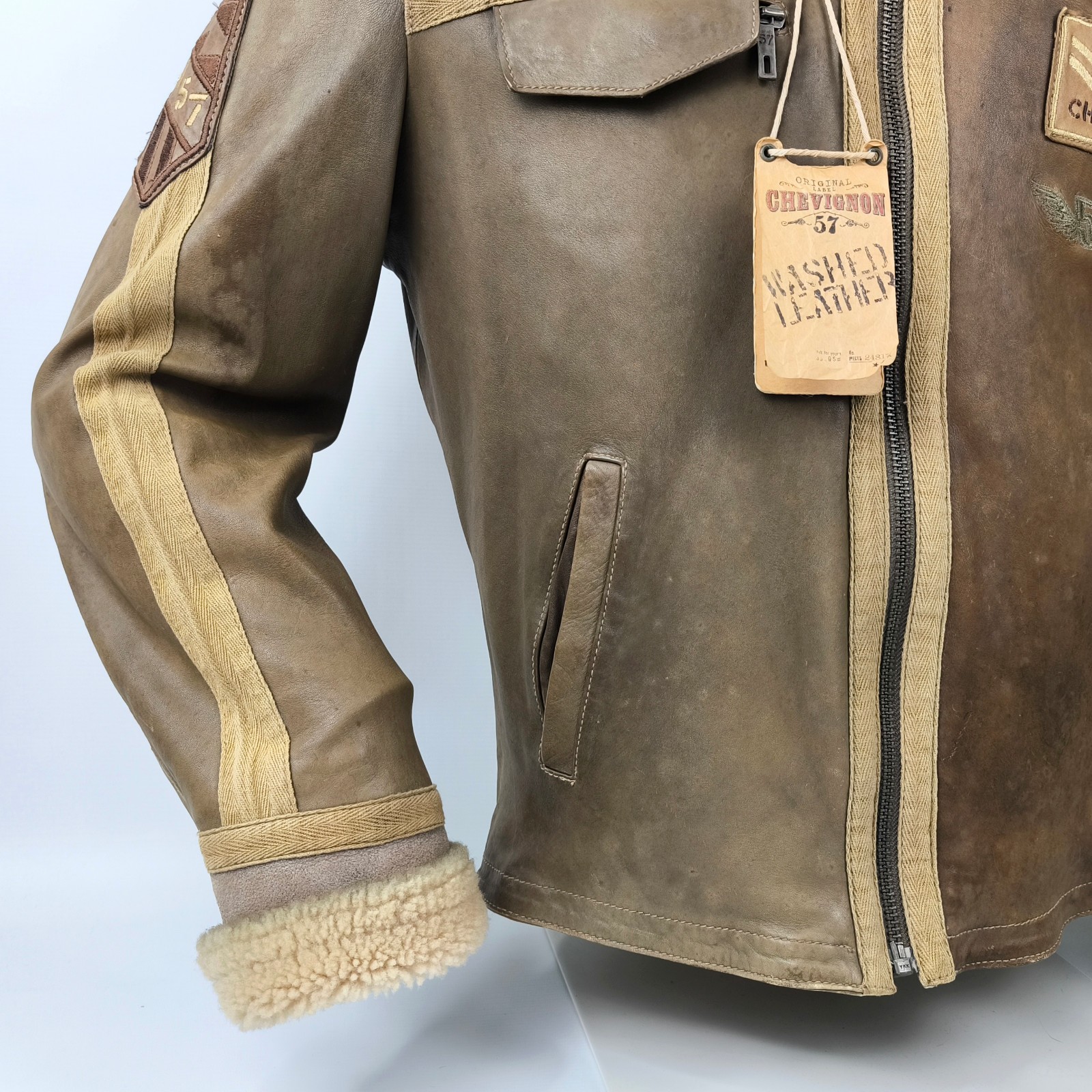 ________________________________________Marke: ChevignonModell: BoumeGröße: XXL (XL)Farbe: naturfaben Zustand: ausgezeichnet_______________________________________Beschreibung:Die Jacke befindet sich in einem ausgezeichneten Zustand. Es sind nur minimalste und nahezu nicht sichtbare Tragespuren zu erkennen.Außen sowie Innen !Reißverschlüsse und Druckknöpfe an den Taschen funktionieren tadellos.Lammfell Einsätze im Brustbereich, an den Ärmelenden und dem unteren Rücken.Braune Ledereinsätze im vorderen Bereich.Eine sehr schöne Materialkombination aus Lammfell, echtem Leder und Baumwolle.Tadelloser Zustand einer tollen Jacke !In der Jacke ist die Größe XXL angegeben. Im Vergleich mit anderen Chevignon Jacken von uns fällt sie etwas kleiner und tendiert ganz leicht zu einer Größe XL. Bitte die Maße beachten für eine perfekte Passform. _______________________________________Die ca. Maße sind wie folgt:Brustbreite von Achsel zu Achsel: 69cmÄrmellänge ab Höhe Schulter: 74cmRückenlänge inkl. Kragen und Bund: 78cm_______________________________________Material lt. Etikett:Oberstoff: 100% Leder (Lamm / Rind) / BaumwolleFutter+Füllung: 100% Polyester_______________________________________Pflegeanleitung:professionelle Textilreinigung