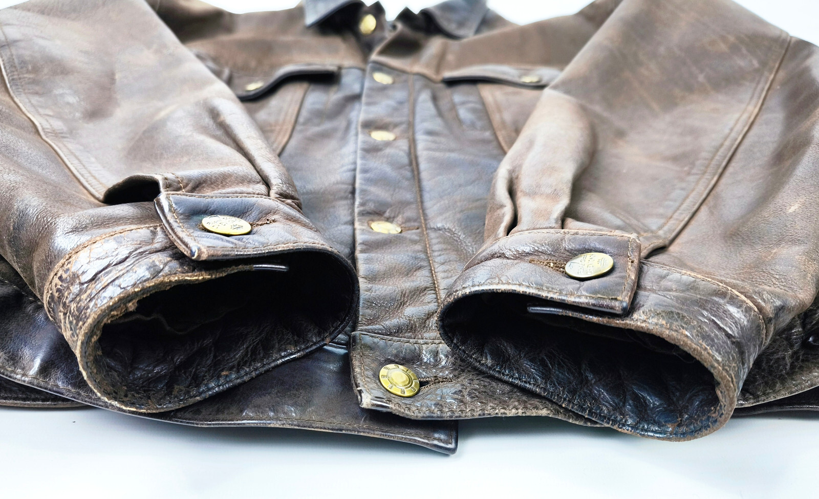 ________________________________________Marke: ChevignonGröße: XXL (L/XL)Farbe: braun Zustand: getragen_______________________________________Beschreibung:Die Jacke wurde getragen und befindet sich in einem guten Zustand.Leder außen mit wunderschöner leichter Patina und super schön erhalten.Sehr weiches, anschmiegsames und offenporiges Leder. Absolut atmungsaktiv.Innenfutter mit leichten Trage- und Gebrauchsspuren und ebenfalls absolut gut erhalten.Innenfutter an den Bündchen mit deutlicheren Trage- und Gebauchsspuren aber unsichtbar beim Tragen.Reißverschluß und Druckknöpfe an den Taschen funktionieren tadellos.Ein Chevignon Pilot´s Blouson aus den 1980er Jahren.In der Jacke ist die Größe XXL angegeben. Chevignon typisch dieser Jahrgänge, fällt auch diese Jacke kleiner aus. Im Vergleich mit ähnlichen Chevignon Lederjacken von uns, ist es hier ganz deutlich eher eine L bis kleine XL.Auch fällt sie ganz typisch der damaligen Zeit vom Rücken her recht kurz aus.Bitte die Maße prüfen für eine perfekte Passform._______________________________________Die ca. Maße sind wie folgt:Brustbreite von Achsel zu Achsel: 61cmÄrmellänge ab Höhe Schulter: 70cmRückenlänge inkl. Kragen und Bund: 66cm_______________________________________Material lt. Etikett:Außen / Innen:100% Leder / 100% Baumwolle-SatinFüllung: 100% Polyester_______________________________________Pflegeanleitung: professionelle Textilreinigung