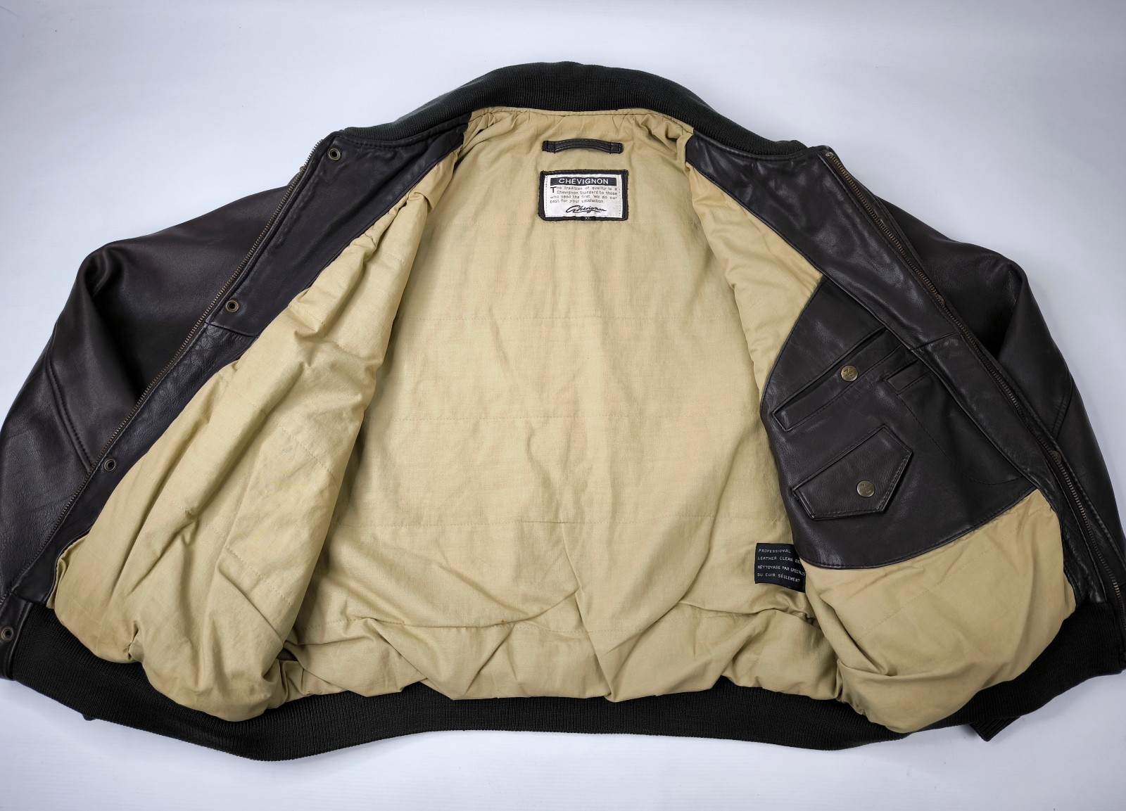 ________________________________________Marke: ChevignonGröße: LFarbe: braun Zustand: sehr gut_______________________________________Beschreibung:Die Jacke befindet sich in einem sehr guten Zustand.Leder außen mit minimaler und ganz leichter Patina und sehr gut erhalten.Sehr weiches, anschmiegsames und trotzdem sehr robustes Leder.Innenfutter und auch die Bündchen, ebenfalls sehr gut im Zustand !Reißverschlüsse und Druckknöpfe an den Innentaschen funktionieren tadellos.Ein Chevignon Flieger Blouson aus den späten 1980er Jahren.Die Jacke hat eine sehr gute Größe L und sitzt relaxed.Bitte die Maße prüfen für eine perfekte Passform._______________________________________Die ca. Maße sind wie folgt:Brustbreite von Achsel zu Achsel: 65cmÄrmellänge ab Höhe Schulter: 71cmRückenlänge inkl. Kragen und Bund: 71cm_______________________________________Material lt. Etikett:Außen / Innen:100% Leder / 100% Baumwolle-AcetatFüllung: 100% Polyester_______________________________________Pflegeanleitung: professionelle Textilreinigung