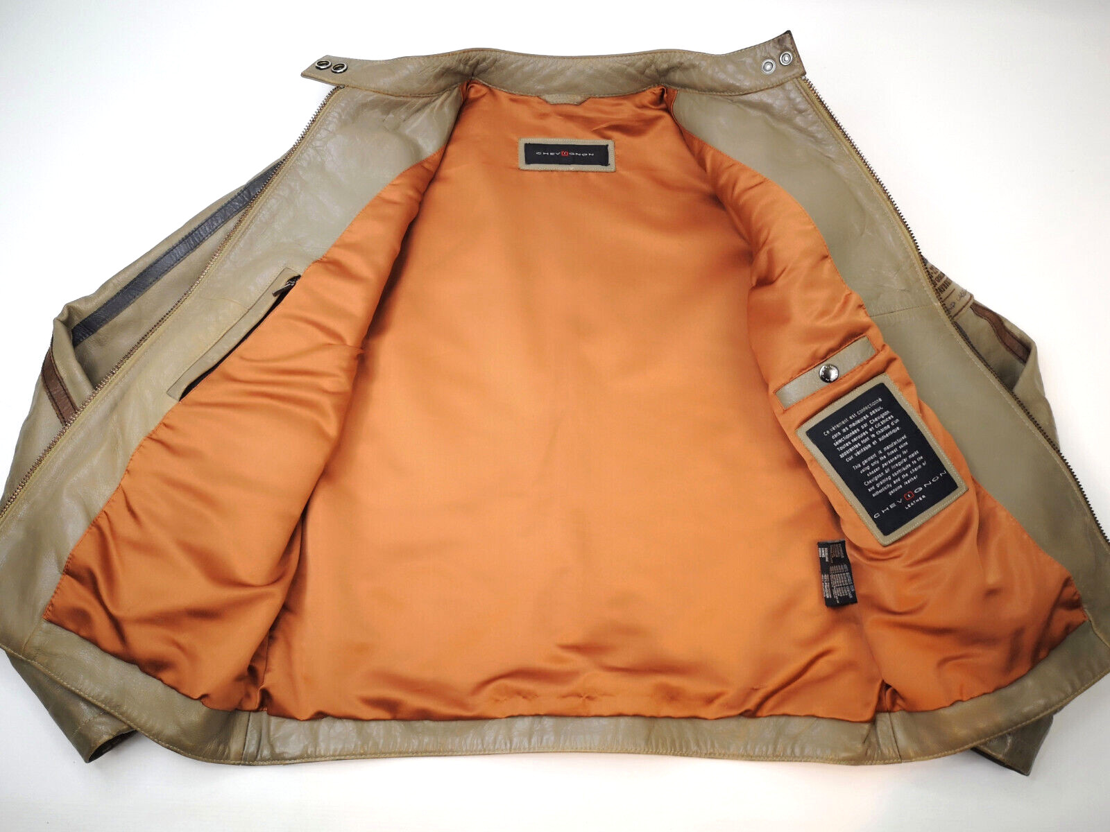 ________________________________________Marke: ChevignonGröße: LFarbe: braun Zustand: sehr gut_______________________________________Beschreibung:Die Jacke befindet sich in einem sehr guten Zustand.Leder außen mit minimaler und ganz leichter Patina und sehr gut erhalten.Sehr weiches, anschmiegsames und trotzdem sehr robustes Leder.Innenfutter und auch die Bündchen, ebenfalls sehr gut im Zustand !Reißverschlüsse und Druckknöpfe an den Innentaschen funktionieren tadellos.Ein Chevignon Flieger Blouson aus den späten 1980er Jahren.Die Jacke hat eine sehr gute Größe L und sitzt relaxed.Bitte die Maße prüfen für eine perfekte Passform._______________________________________Die ca. Maße sind wie folgt:Brustbreite von Achsel zu Achsel: 65cmÄrmellänge ab Höhe Schulter: 71cmRückenlänge inkl. Kragen und Bund: 71cm_______________________________________Material lt. Etikett:Außen / Innen:100% Leder / 100% Baumwolle-AcetatFüllung: 100% Polyester_______________________________________Pflegeanleitung: professionelle Textilreinigung