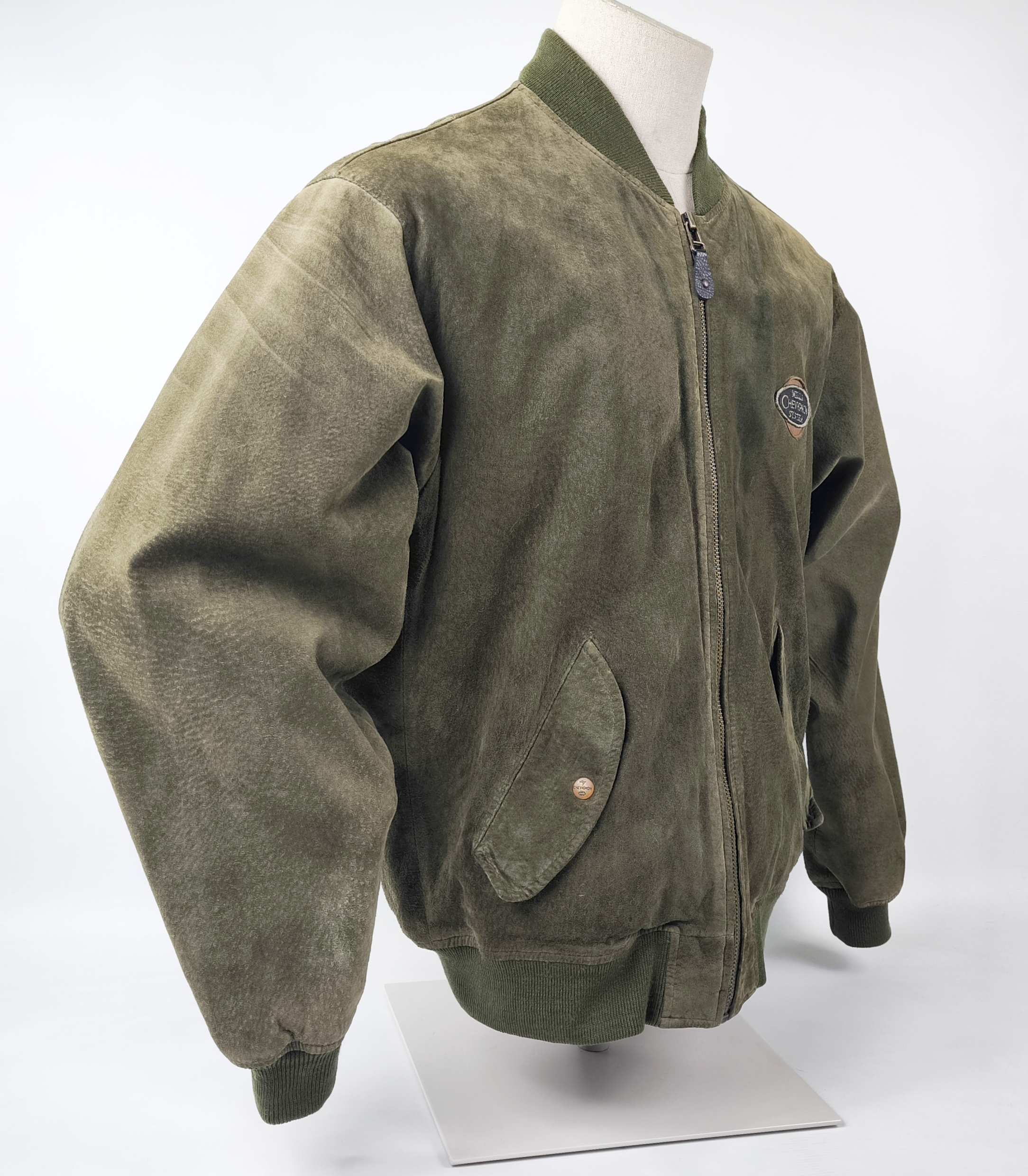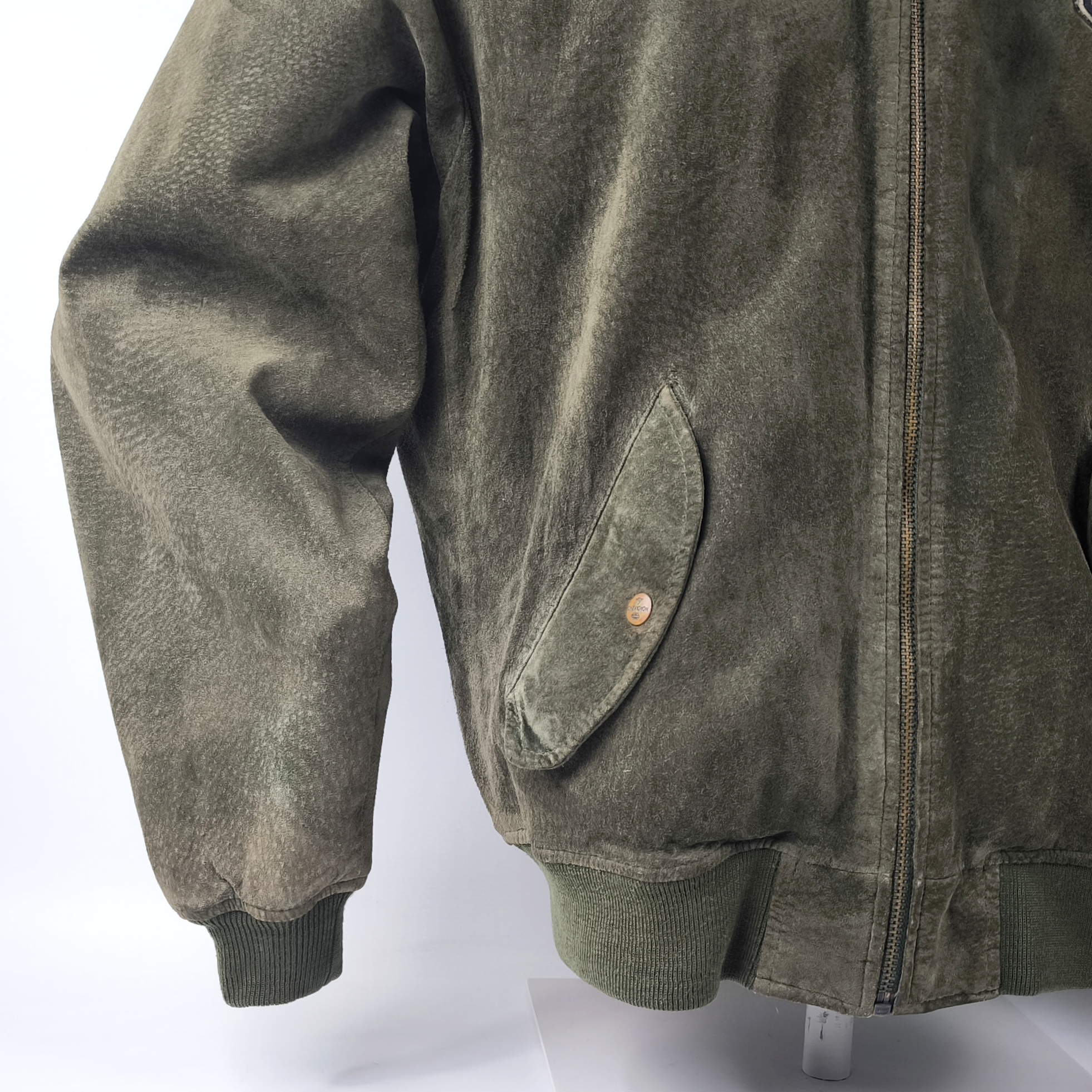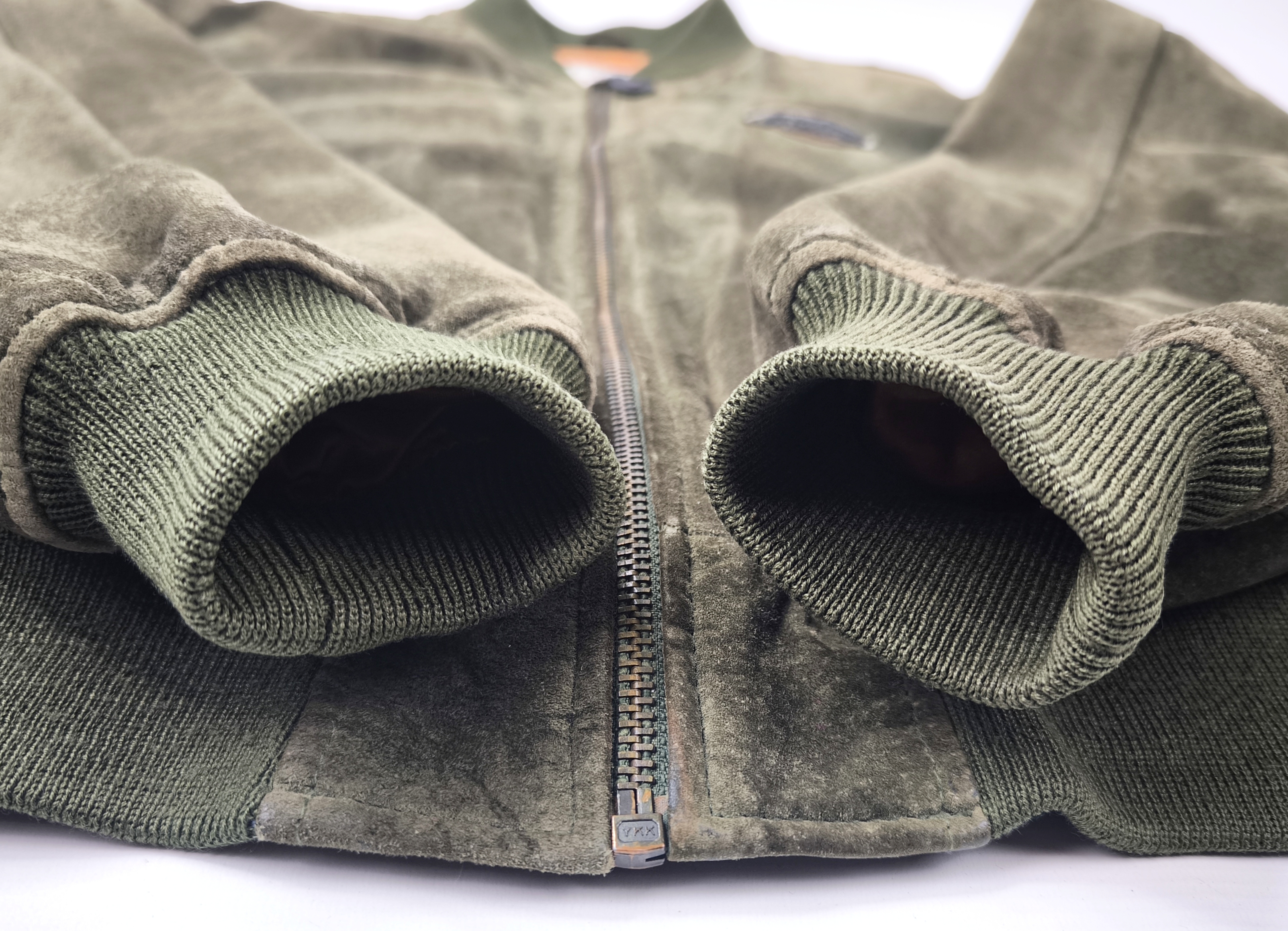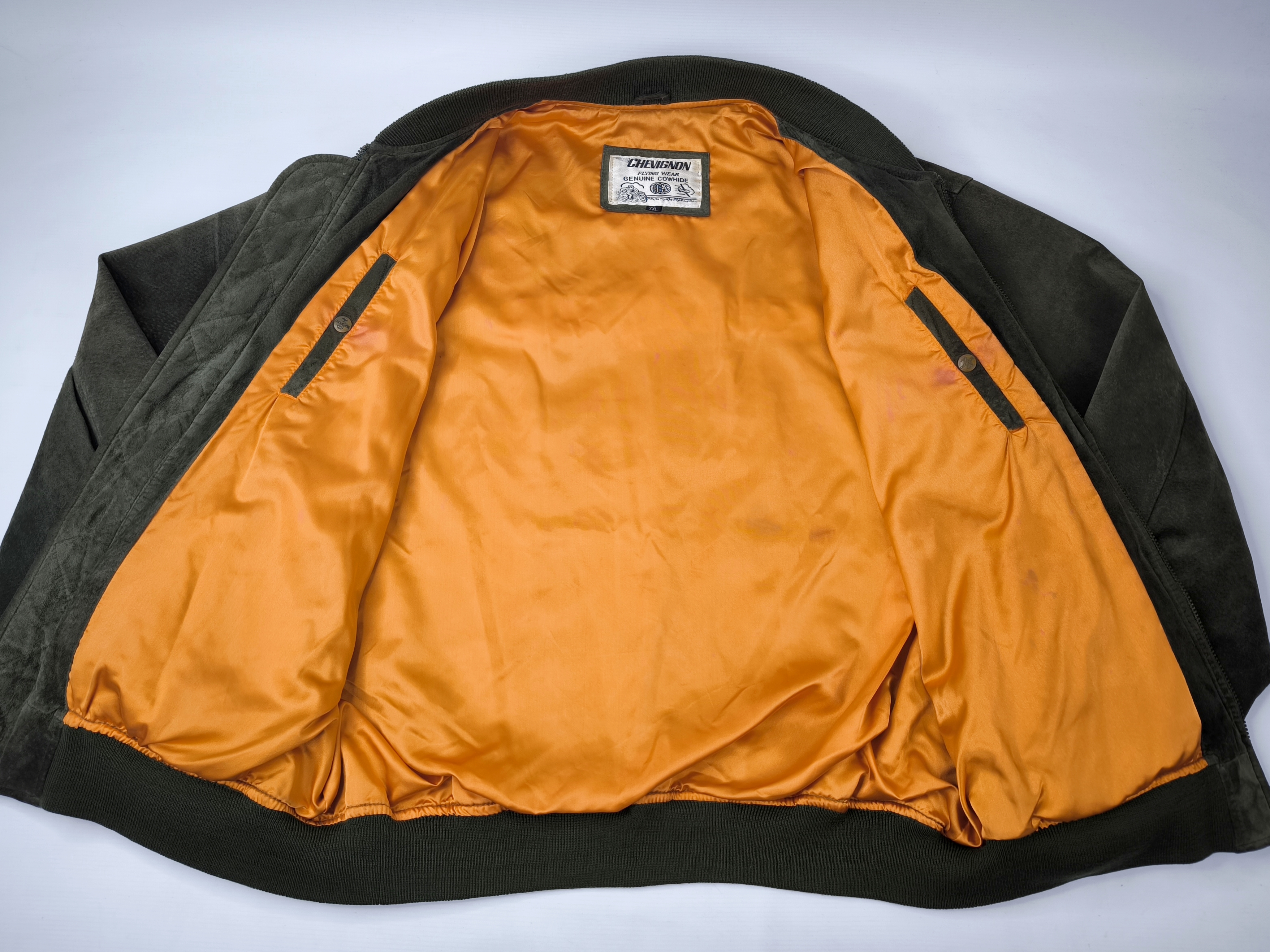 ________________________________________Marke: ChevignonGröße: LFarbe: schwarz / grün Zustand: hervorragend_______________________________________Beschreibung:Die Jacke befindet sich in einem hervorragenden Zustand.Es sind nur minimalste und sehr kleine Tragespuren zu erkennen.Leder außen mit ganz wenig Patina und sehr sehr gut erhalten.Innenfutter ebenfalls, sehr sehr gut im Zustand.Bündchen ohne wenn und aber, fantastisch erhalten.Druckknöpfe funktionieren tadellos.Eine wahnsinnig schöne Chevignon Wildleder Jacke der 1990er Jahre in einem wahnsinnig schönen Zustand !Bitte die Maße prüfen für eine perfekte Passform._______________________________________Die ca. Maße sind wie folgt:Brustbreite von Achsel zu Achsel: 64cmÄrmellänge ab Höhe Schulter: 73cmRückenlänge inkl. Kragen und Bund: 71cm_______________________________________Material lt. Etikett:Außen / Innen:100% Wildleder / 100% NylonFüllung: 100% Polyester_______________________________________Pflegeanleitung: professionelle Textilreinigung