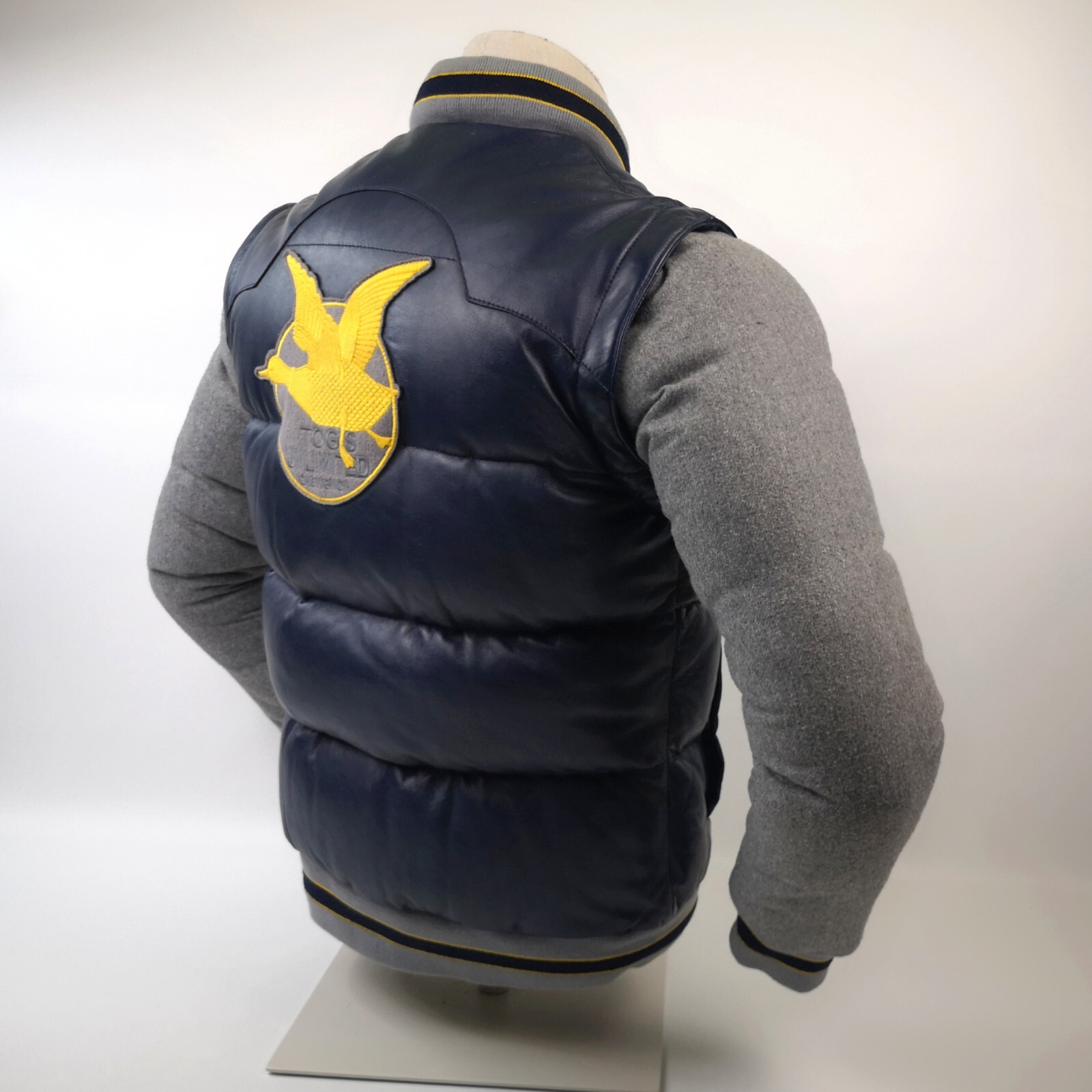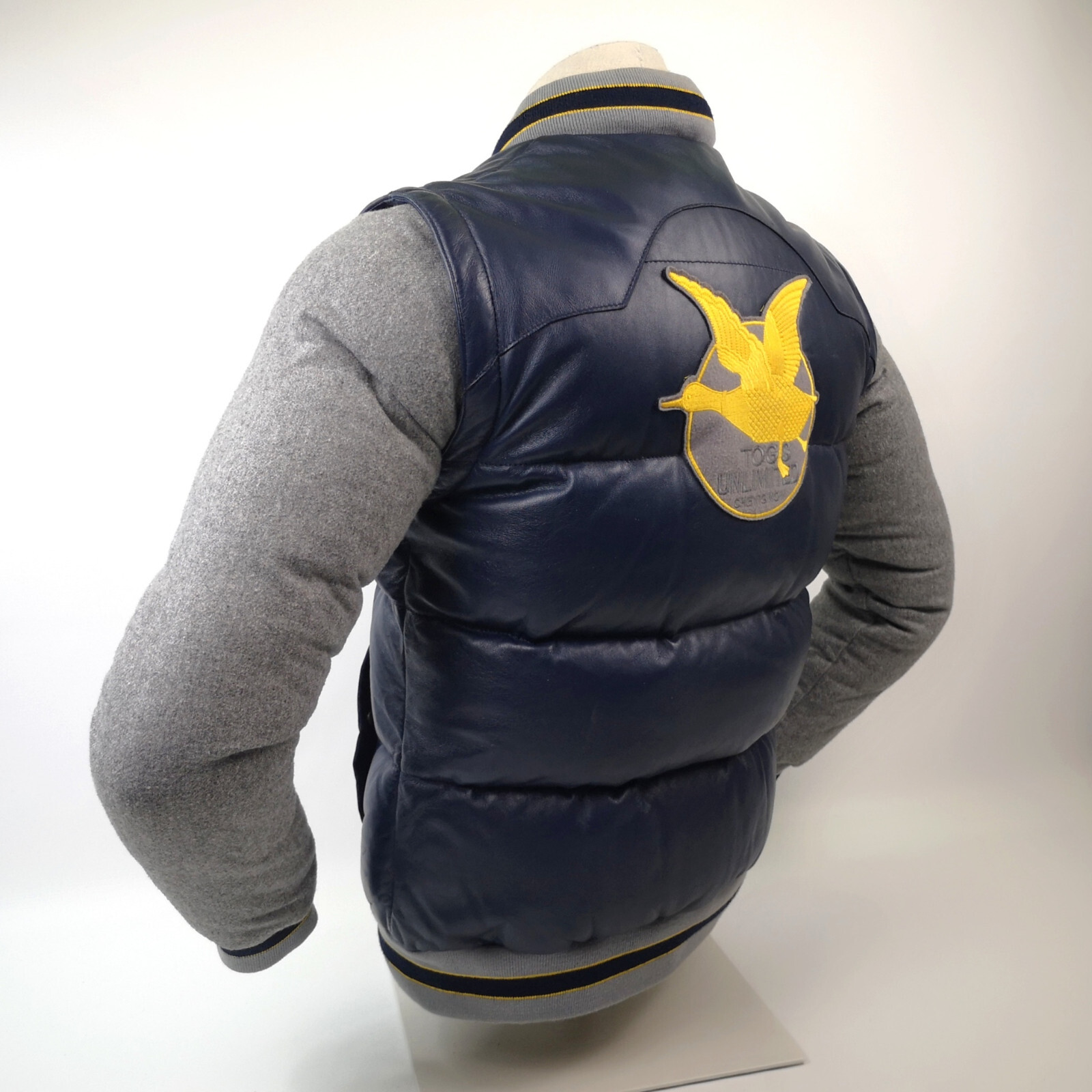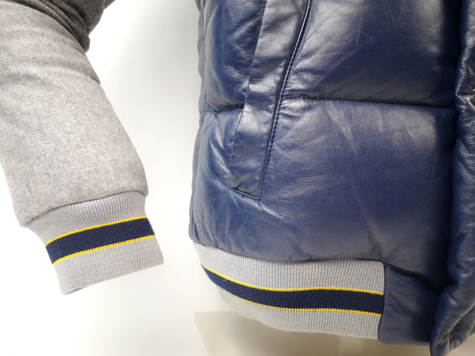 ________________________________________Marke: ChevignonFarbe: dunkelblauGröße: M Zustand: getragen_______________________________________Beschreibung:Die Jacke wurde getragen und befindet sich in einem sehr schönen Zustand. Es sind nur wenige und dann kleine Trage- und Gebrauchsspuren zu erkennen.Außen mit wenigen und kleinen Trage- und Gebrauchsspuren und super gut erhalten.Innenfutter im sehr guten Zustand.Ebenfalls die Bündchen, ganz leichte Trage- und Gebrauchsspuren und super gut erhalten.Reißverschluß funktioniert tadellos. Zwei Außen- und eine Innentasche.Lammfell / Lammleder im Kragenbereich.Lederabsetzung in schwarz an den Schultern und den Außentaschen mit wunderschöner leichter Patina.Typisch der Schnitte der damaligen Zeit, ist die Jacke im Brustbereich breit und vom Rücken her recht kurz geschnitten.Die Größe ist keine Größe zu finden. Im Vergleich mit anderen Chevignon Jacken von uns, fällt sie wie eine Größe M.Bitte die Maße prüfen für eine perfekte Passform._____________________________________Die ca. Maße sind wie folgt:Brustbreite von Achsel zu Achsel: 63cmÄrmellänge ab Höhe Schulter: 68cmRückenlänge inkl. Kragen und Bund: 67cm_______________________________________Material:Außen+Futter / Kragen / Schultern: 100% Nylon - 100% Baumwolle / 100% Lammleder / 100% Leder (Rind)_______________________________________Pflegeanleitung:professionelle Textilreinigung