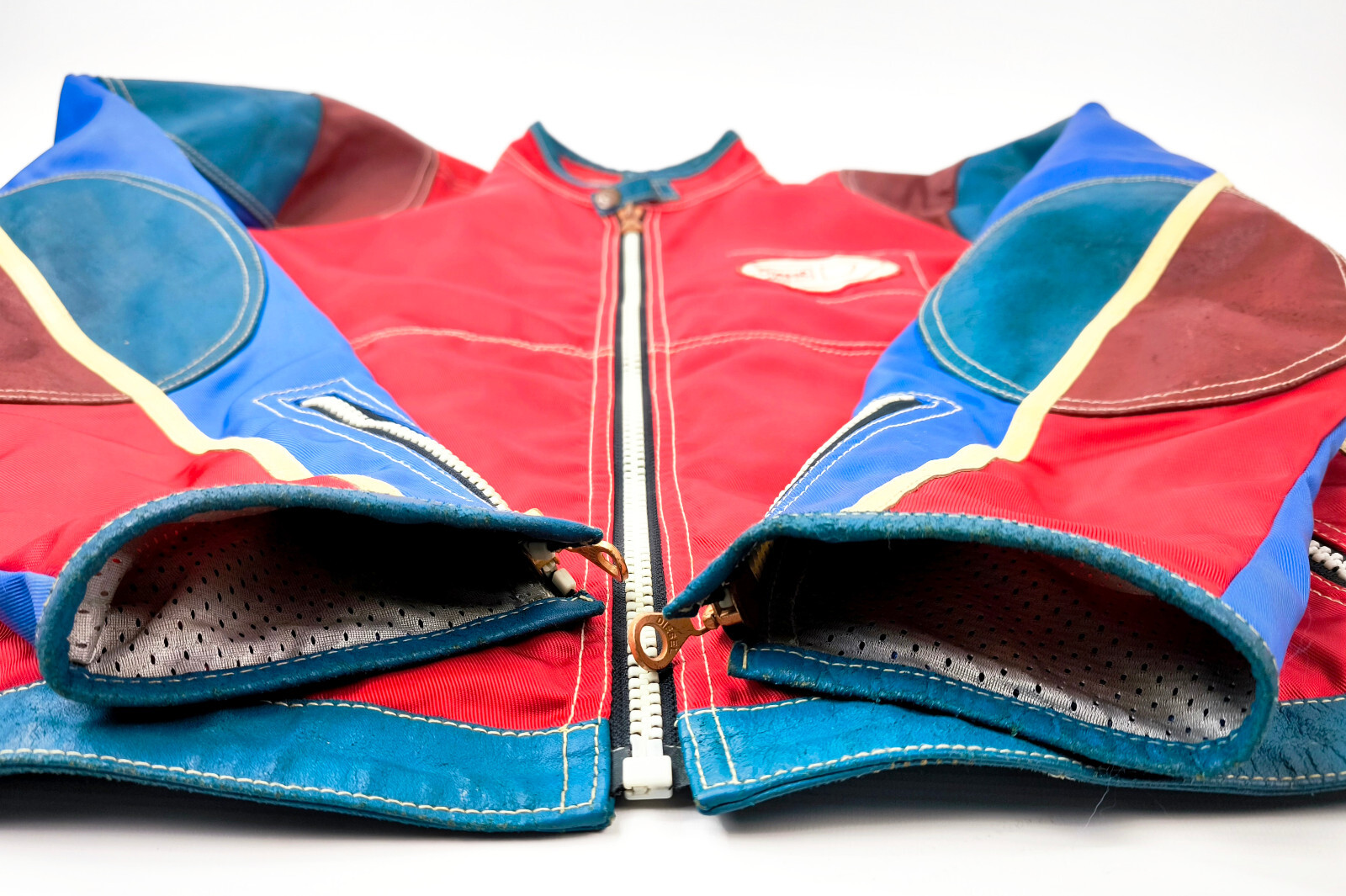 Preisvorschlag für Diesel Jacke Vrooom Leder Nylon Mix Gr. L rot / blau / creme 90er vintage Biker