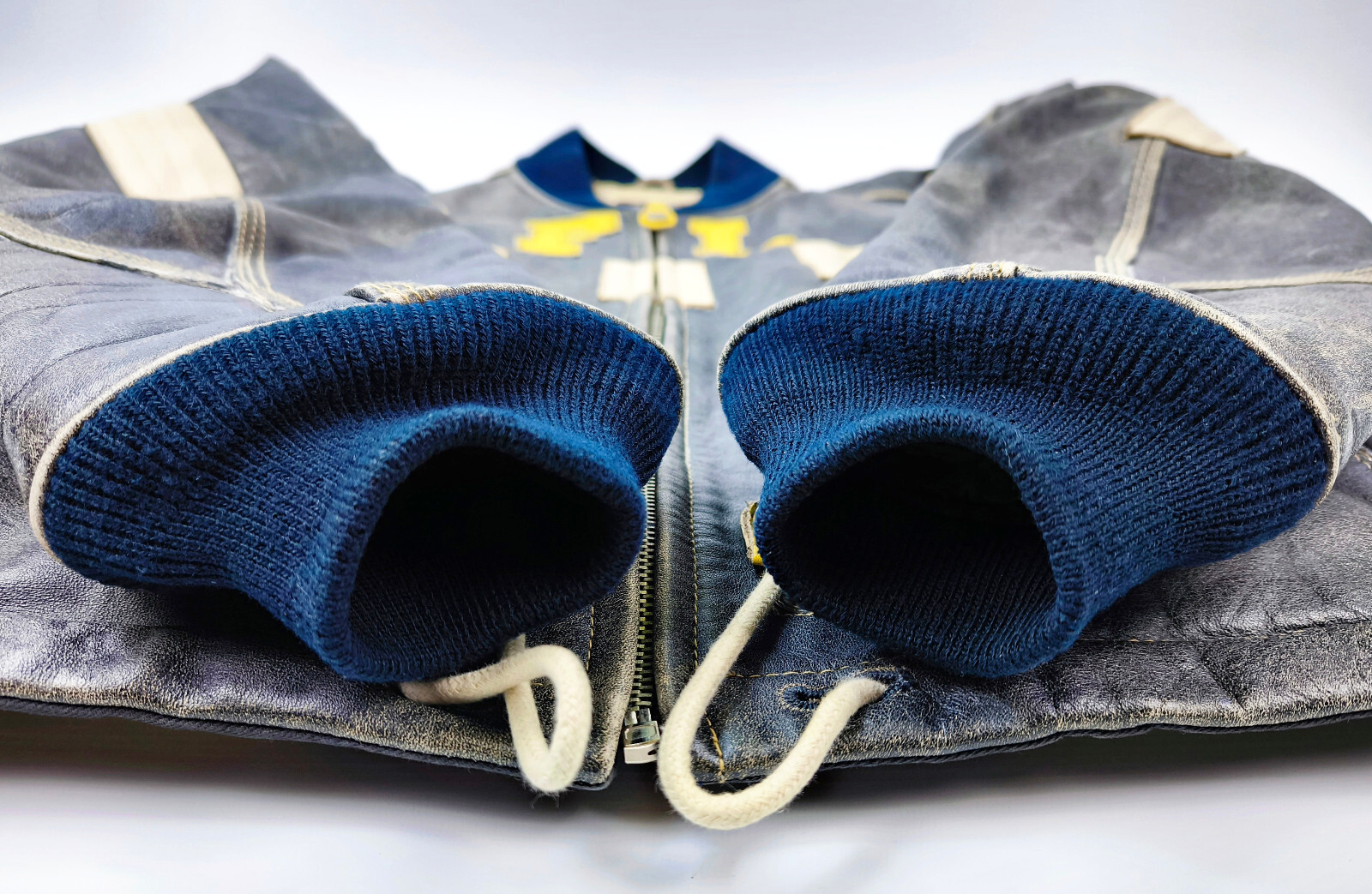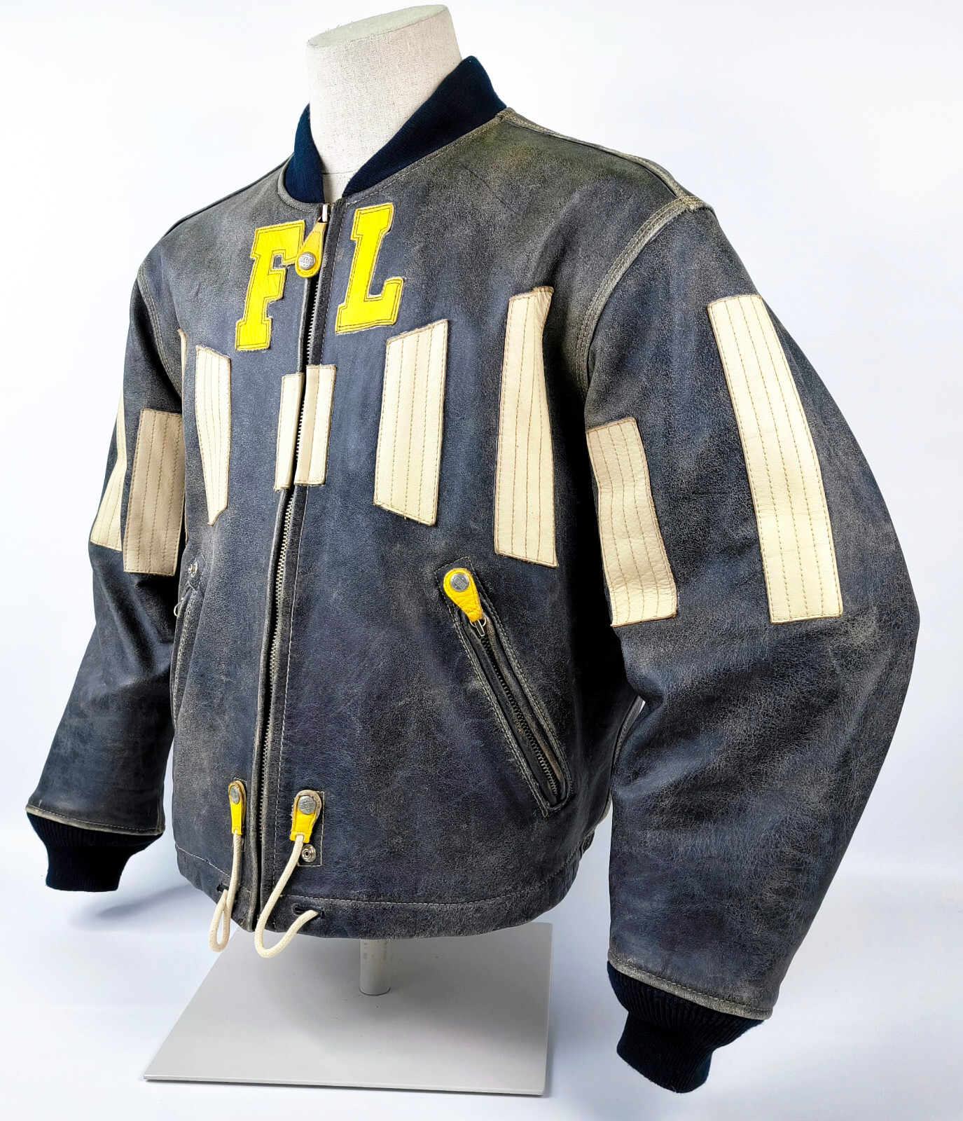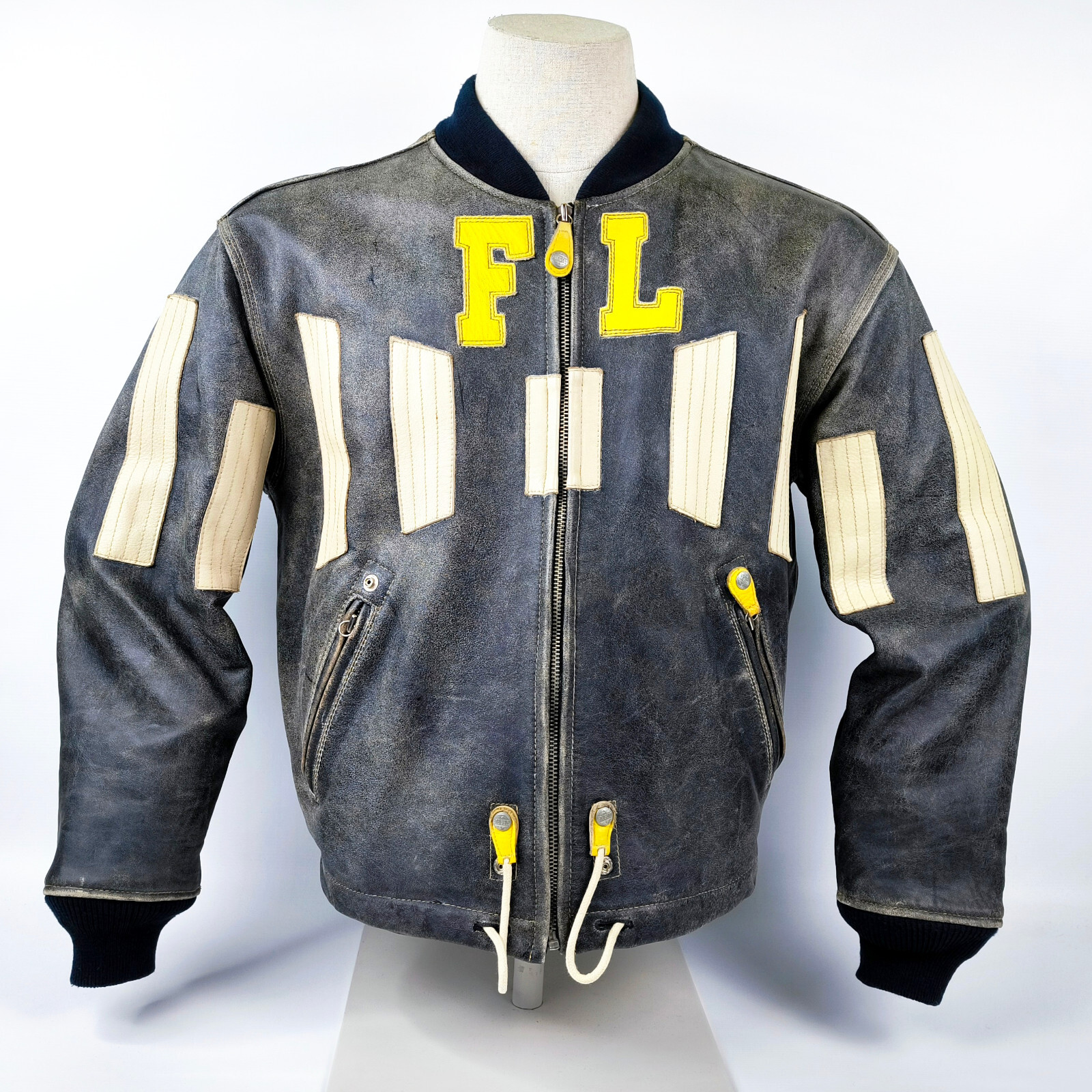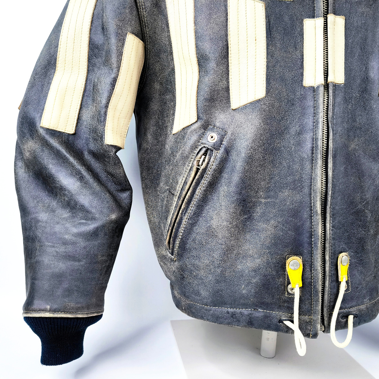 ________________________________________Marke: ChevignonFarbe: dunkelblauGröße: M Zustand: getragen_______________________________________Beschreibung:Die Jacke wurde getragen und befindet sich in einem sehr schönen Zustand. Es sind nur wenige und dann kleine Trage- und Gebrauchsspuren zu erkennen.Außen mit wenigen und kleinen Trage- und Gebrauchsspuren und super gut erhalten.Innenfutter im sehr guten Zustand.Ebenfalls die Bündchen, ganz leichte Trage- und Gebrauchsspuren und super gut erhalten.Reißverschluß funktioniert tadellos. Zwei Außen- und eine Innentasche.Lammfell / Lammleder im Kragenbereich.Lederabsetzung in schwarz an den Schultern und den Außentaschen mit wunderschöner leichter Patina.Typisch der Schnitte der damaligen Zeit, ist die Jacke im Brustbereich breit und vom Rücken her recht kurz geschnitten.Die Größe ist keine Größe zu finden. Im Vergleich mit anderen Chevignon Jacken von uns, fällt sie wie eine Größe M.Bitte die Maße prüfen für eine perfekte Passform._____________________________________Die ca. Maße sind wie folgt:Brustbreite von Achsel zu Achsel: 63cmÄrmellänge ab Höhe Schulter: 68cmRückenlänge inkl. Kragen und Bund: 67cm_______________________________________Material:Außen+Futter / Kragen / Schultern: 100% Nylon - 100% Baumwolle / 100% Lammleder / 100% Leder (Rind)_______________________________________Pflegeanleitung:professionelle Textilreinigung