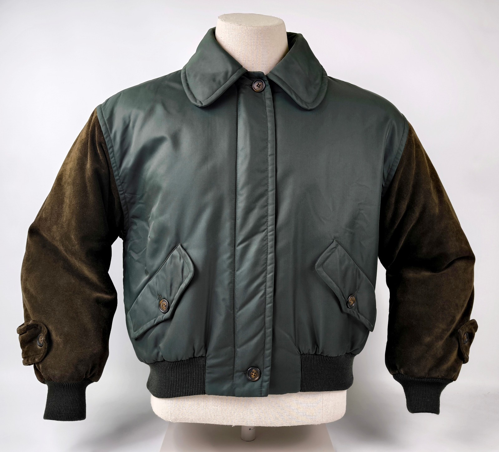 ________________________________________Marke: ChevignonGröße: LFarbe: schwarz / grün Zustand: hervorragend_______________________________________Beschreibung:Die Jacke befindet sich in einem hervorragenden Zustand.Es sind nur minimalste und sehr kleine Tragespuren zu erkennen.Leder außen mit ganz wenig Patina und sehr sehr gut erhalten.Innenfutter ebenfalls, sehr sehr gut im Zustand.Bündchen ohne wenn und aber, fantastisch erhalten.Druckknöpfe funktionieren tadellos.Eine wahnsinnig schöne Chevignon Wildleder Jacke der 1990er Jahre in einem wahnsinnig schönen Zustand !Bitte die Maße prüfen für eine perfekte Passform._______________________________________Die ca. Maße sind wie folgt:Brustbreite von Achsel zu Achsel: 64cmÄrmellänge ab Höhe Schulter: 73cmRückenlänge inkl. Kragen und Bund: 71cm_______________________________________Material lt. Etikett:Außen / Innen:100% Wildleder / 100% NylonFüllung: 100% Polyester_______________________________________Pflegeanleitung: professionelle Textilreinigung