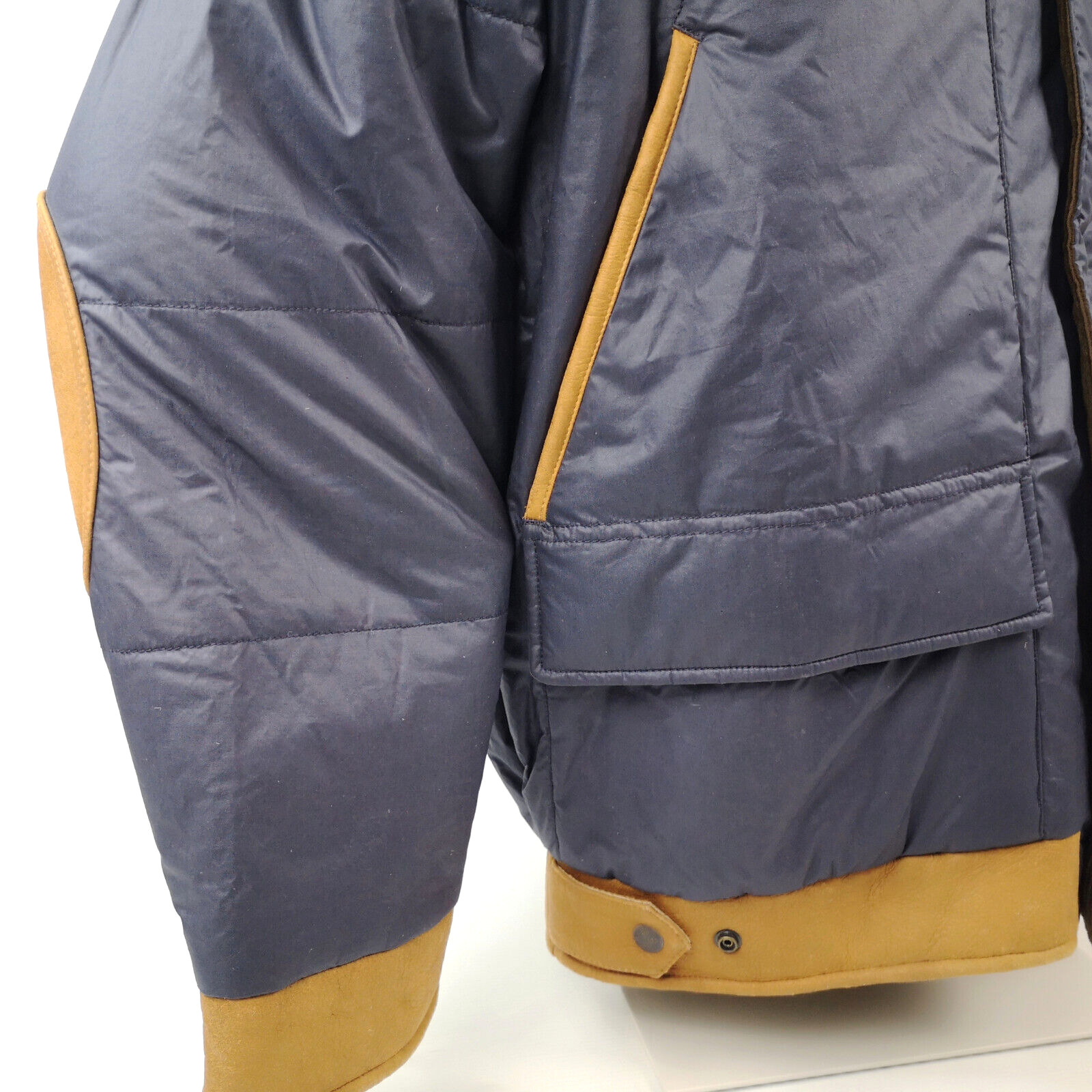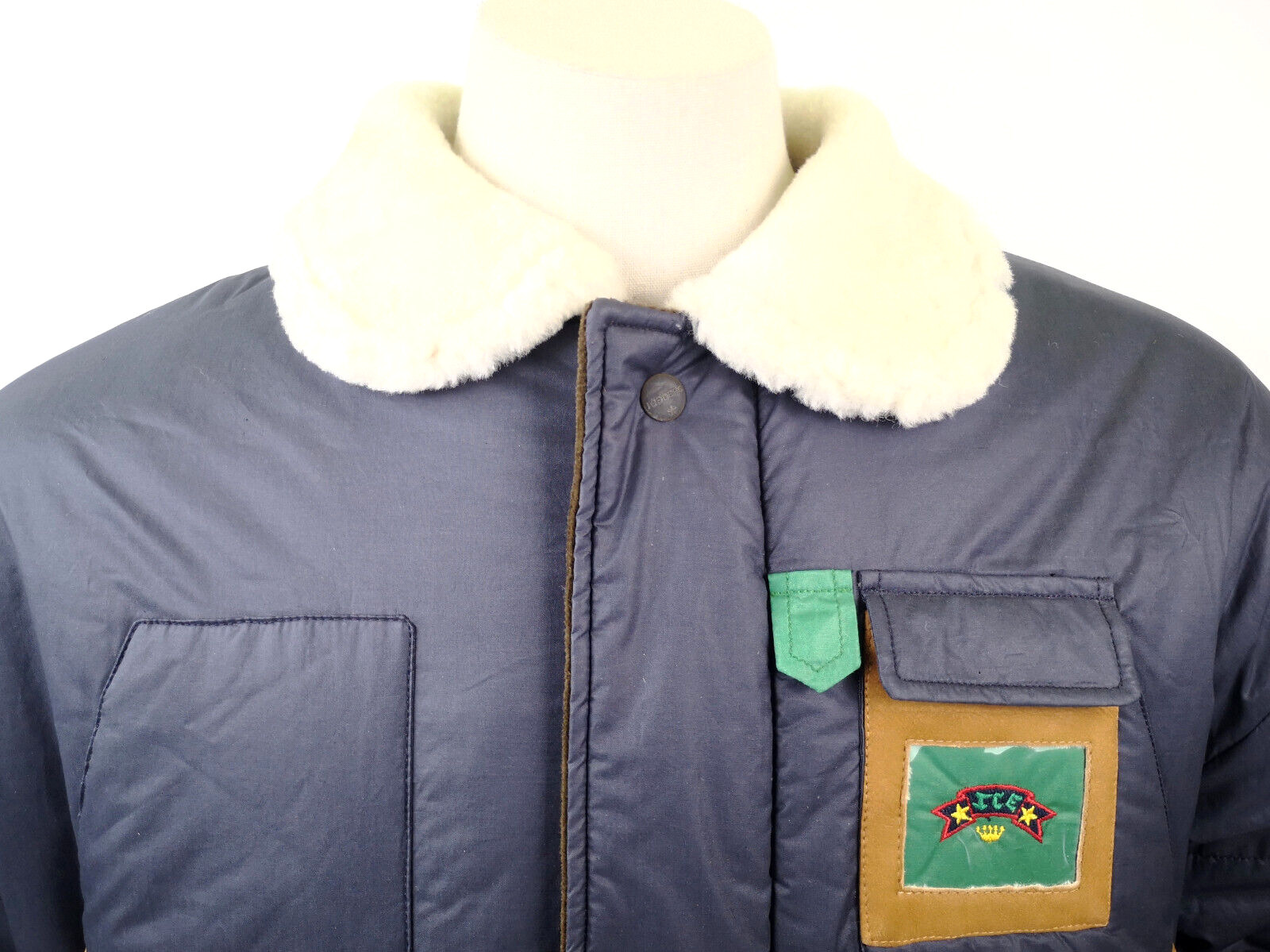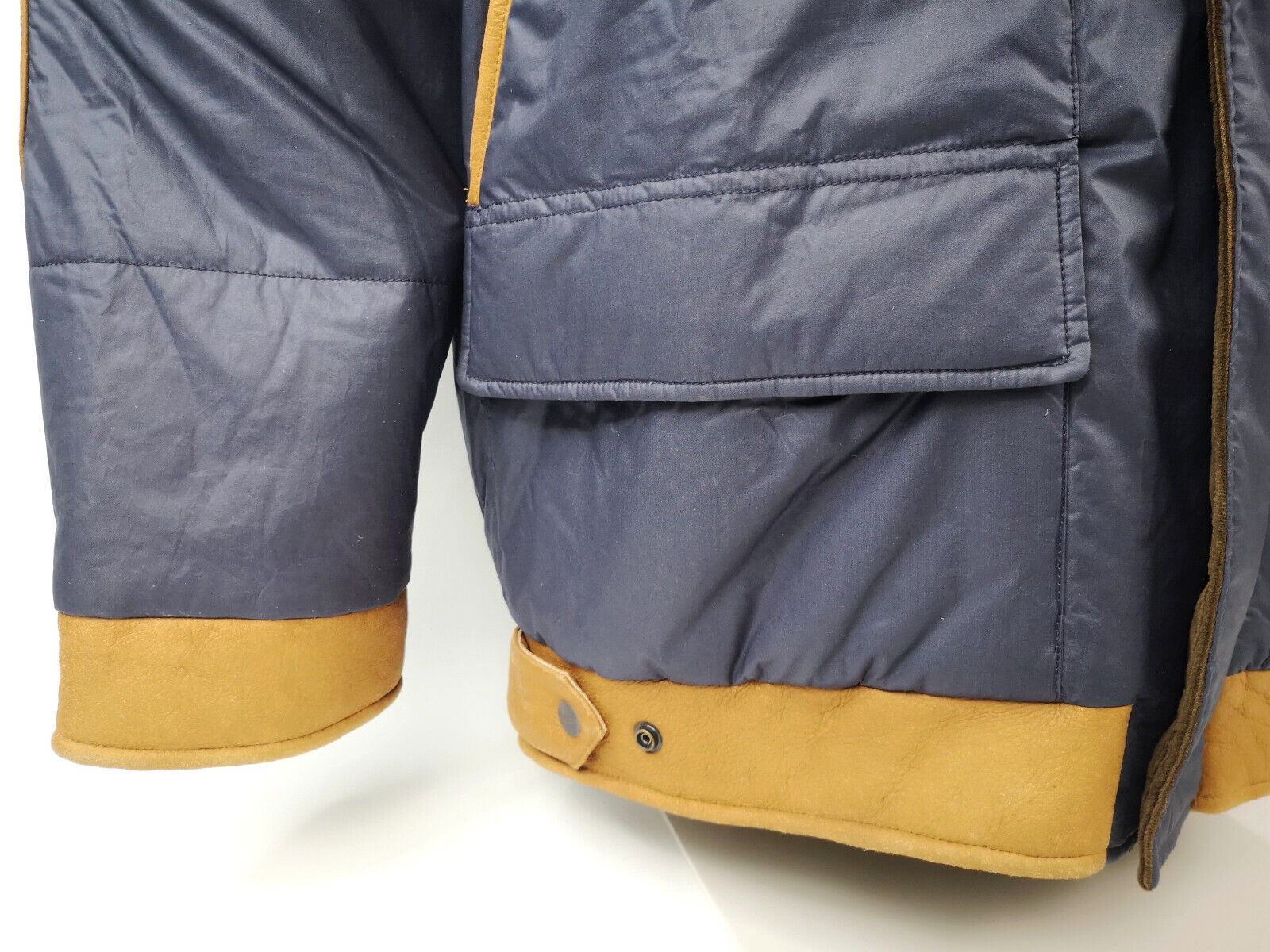 ________________________________________Marke: ChevignonFarbe: dunkelblauGröße: M Zustand: getragen_______________________________________Beschreibung:Die Jacke wurde getragen und befindet sich in einem sehr schönen Zustand. Es sind nur wenige und dann kleine Trage- und Gebrauchsspuren zu erkennen.Außen mit wenigen und kleinen Trage- und Gebrauchsspuren und super gut erhalten.Innenfutter im sehr guten Zustand.Ebenfalls die Bündchen, ganz leichte Trage- und Gebrauchsspuren und super gut erhalten.Reißverschluß funktioniert tadellos. Zwei Außen- und eine Innentasche.Lammfell / Lammleder im Kragenbereich.Lederabsetzung in schwarz an den Schultern und den Außentaschen mit wunderschöner leichter Patina.Typisch der Schnitte der damaligen Zeit, ist die Jacke im Brustbereich breit und vom Rücken her recht kurz geschnitten.Die Größe ist keine Größe zu finden. Im Vergleich mit anderen Chevignon Jacken von uns, fällt sie wie eine Größe M.Bitte die Maße prüfen für eine perfekte Passform._____________________________________Die ca. Maße sind wie folgt:Brustbreite von Achsel zu Achsel: 63cmÄrmellänge ab Höhe Schulter: 68cmRückenlänge inkl. Kragen und Bund: 67cm_______________________________________Material:Außen+Futter / Kragen / Schultern: 100% Nylon - 100% Baumwolle / 100% Lammleder / 100% Leder (Rind)_______________________________________Pflegeanleitung:professionelle Textilreinigung