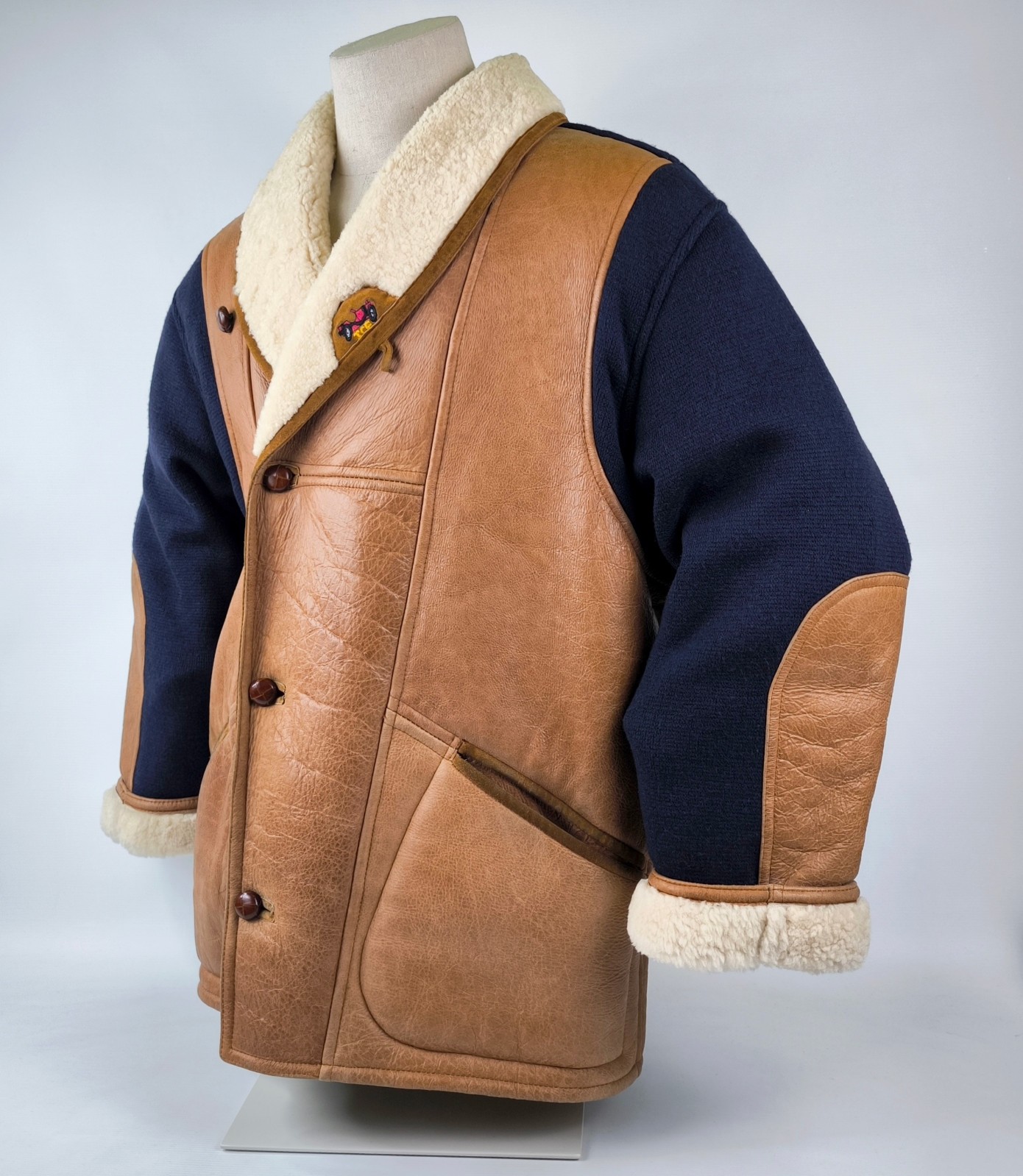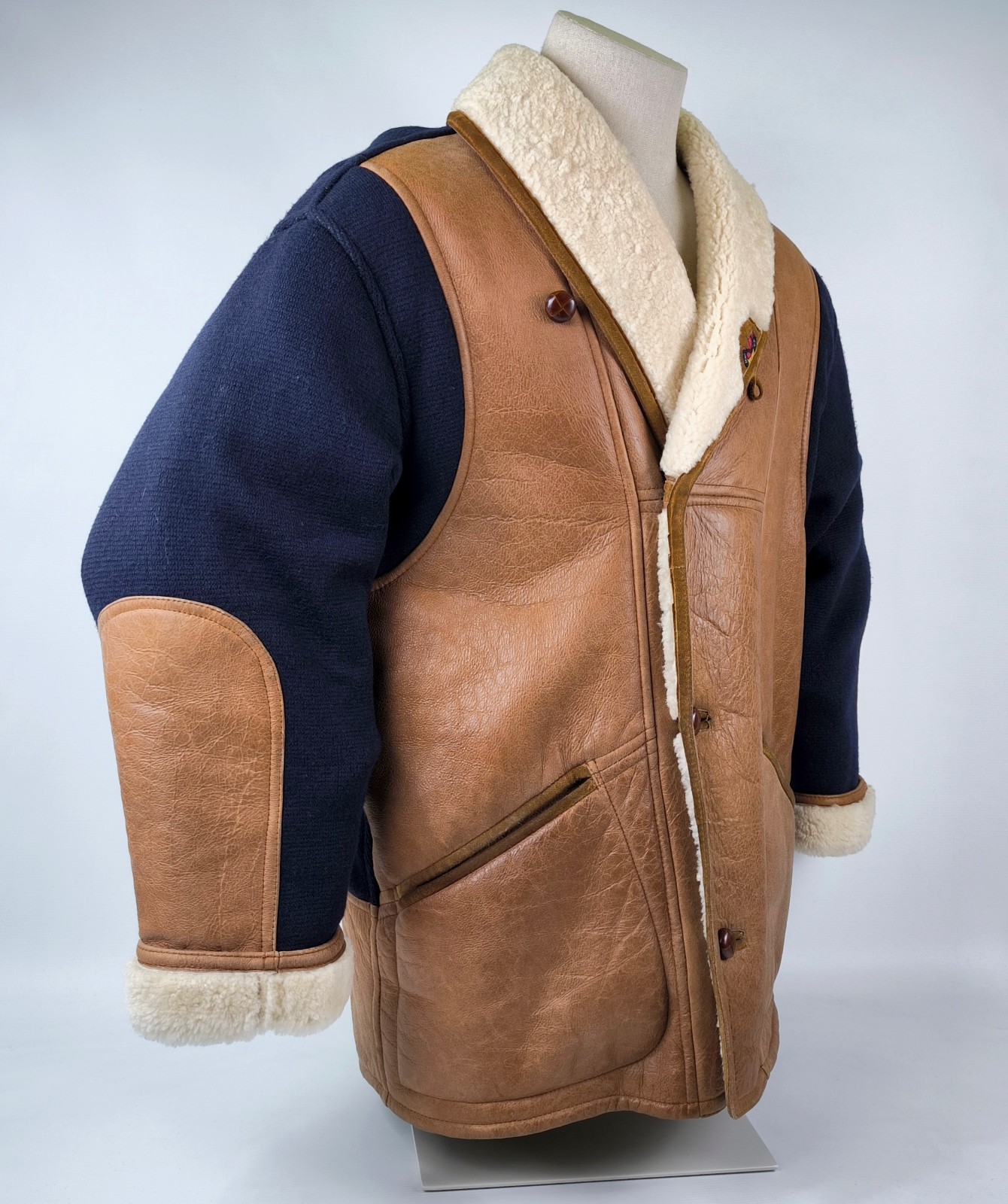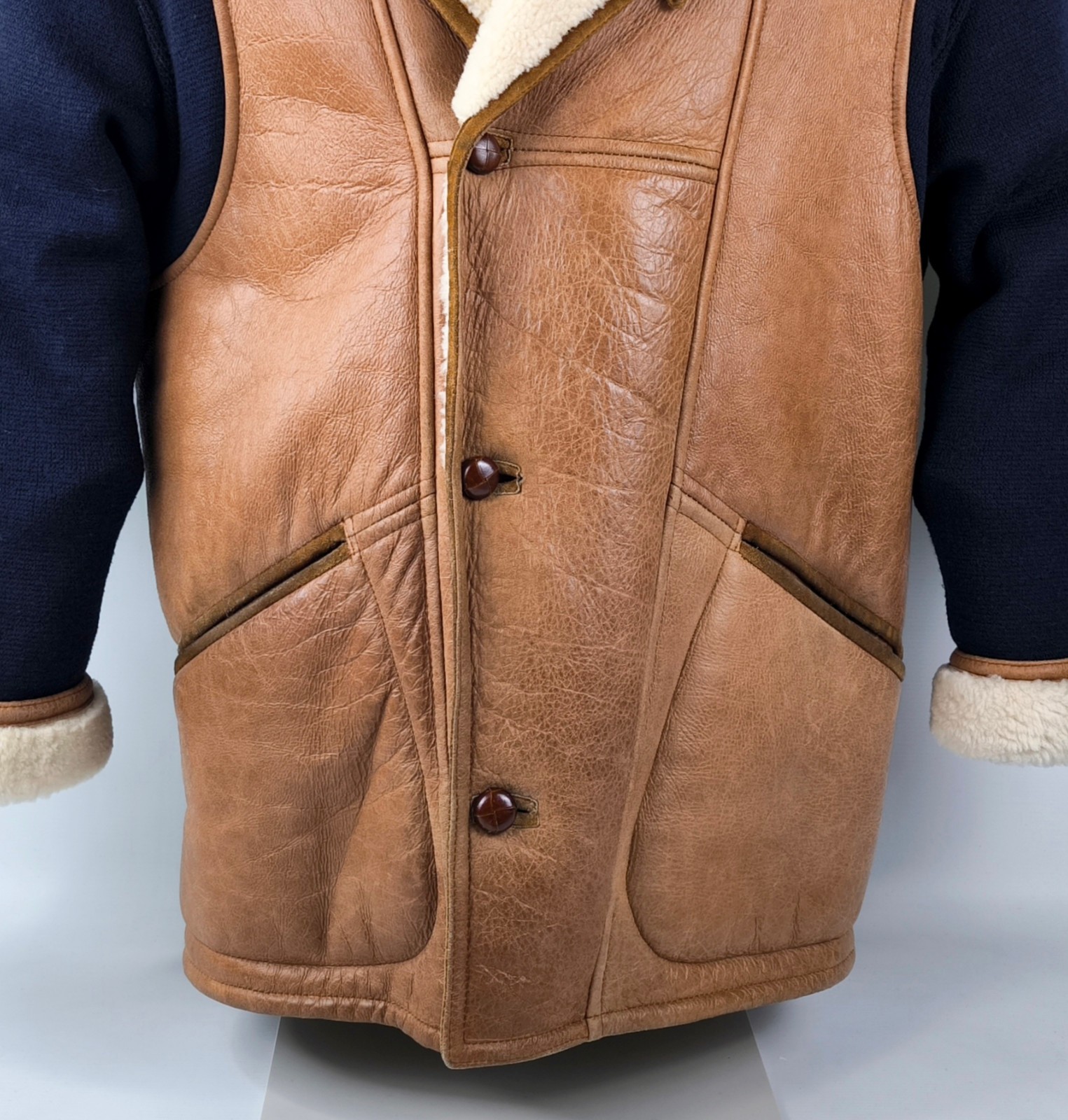 ________________________________________Marke: ChevignonModell: BoumeGröße: XXL (XL)Farbe: naturfaben Zustand: ausgezeichnet_______________________________________Beschreibung:Die Jacke befindet sich in einem ausgezeichneten Zustand. Es sind nur minimalste und nahezu nicht sichtbare Tragespuren zu erkennen.Außen sowie Innen !Reißverschlüsse und Druckknöpfe an den Taschen funktionieren tadellos.Lammfell Einsätze im Brustbereich, an den Ärmelenden und dem unteren Rücken.Braune Ledereinsätze im vorderen Bereich.Eine sehr schöne Materialkombination aus Lammfell, echtem Leder und Baumwolle.Tadelloser Zustand einer tollen Jacke !In der Jacke ist die Größe XXL angegeben. Im Vergleich mit anderen Chevignon Jacken von uns fällt sie etwas kleiner und tendiert ganz leicht zu einer Größe XL. Bitte die Maße beachten für eine perfekte Passform. _______________________________________Die ca. Maße sind wie folgt:Brustbreite von Achsel zu Achsel: 69cmÄrmellänge ab Höhe Schulter: 74cmRückenlänge inkl. Kragen und Bund: 78cm_______________________________________Material lt. Etikett:Oberstoff: 100% Leder (Lamm / Rind) / BaumwolleFutter+Füllung: 100% Polyester_______________________________________Pflegeanleitung:professionelle Textilreinigung