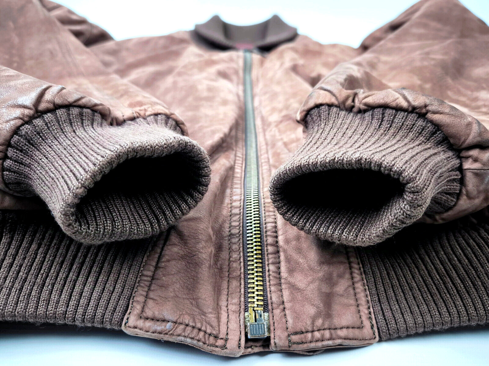 ________________________________________Marke: ChevignonGröße: LFarbe: braun Zustand: sehr gut_______________________________________Beschreibung:Die Jacke befindet sich in einem sehr guten Zustand.Leder außen mit minimaler und ganz leichter Patina und sehr gut erhalten.Sehr weiches, anschmiegsames und trotzdem sehr robustes Leder.Innenfutter und auch die Bündchen, ebenfalls sehr gut im Zustand !Reißverschlüsse und Druckknöpfe an den Innentaschen funktionieren tadellos.Ein Chevignon Flieger Blouson aus den späten 1980er Jahren.Die Jacke hat eine sehr gute Größe L und sitzt relaxed.Bitte die Maße prüfen für eine perfekte Passform._______________________________________Die ca. Maße sind wie folgt:Brustbreite von Achsel zu Achsel: 65cmÄrmellänge ab Höhe Schulter: 71cmRückenlänge inkl. Kragen und Bund: 71cm_______________________________________Material lt. Etikett:Außen / Innen:100% Leder / 100% Baumwolle-AcetatFüllung: 100% Polyester_______________________________________Pflegeanleitung: professionelle Textilreinigung