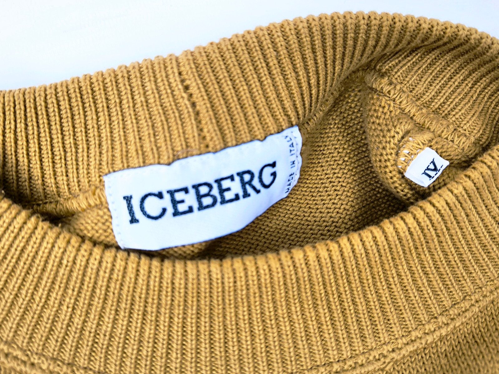 ________________________________________Marke: Iceberg (Sport Ice)Größe: V (L/XL)Farbe: ockerfarben Zustand: neu mit Etikett________________________________________Beschreibung:Der Pullover ist neu und ungetragen mit Etikett und im Polybag.Original Sport Ice by Iceberg Pullover der 1990er Jahre.Die Lederapplikationen der Boxhandschuhe und Boxschuhe lösen sich und blättern leicht ab, was dem Alter zu schulden ist.Made in Italy.Neu und ungetragen !Im Pullover ist die Größe V angegeben.Im Vergleich mit anderen Iceberg Pullovern von uns fällt er wie eine sehr gute Größe XL.Bitte die Maße prüfen für eine perfekte Passform.________________________________________Die ca. Maße sind wie folgt:Brustbreite von Achsel zu Achsel: 61cmÄrmellänge ab Höhe Schulter: 73cmRückenlänge inkl. Kragen: 71cm________________________________________Material lt. Innenetikett:Oberstoff:100% Schurwolle ________________________________________ Pflegeanleitung:Handwäsche kalt / professionelle Textilreinigung
