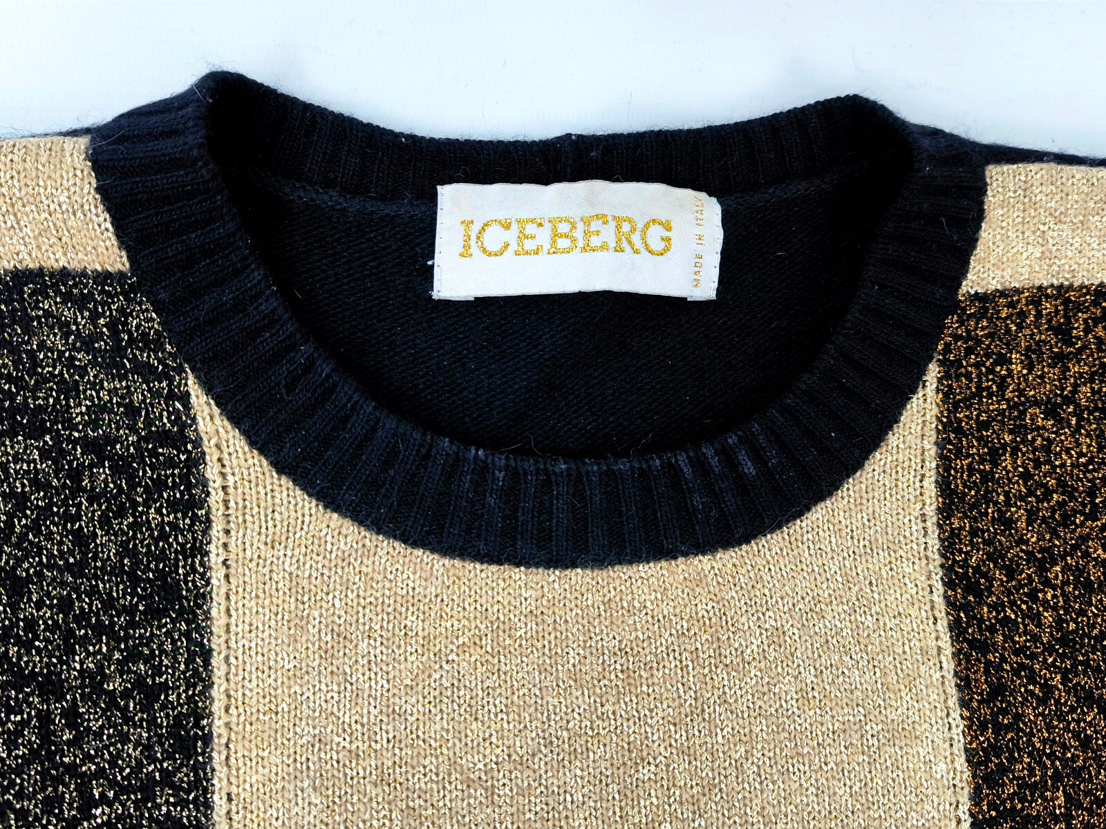 ________________________________________Marke: Iceberg Größe: M / LFarbe: dunkelblau / gelb Zustand: getragen________________________________________Beschreibung:Der Pullover wurde getragen und befindet sich in einem super schönen Zustand.Es sind nur wenige und dann kleine Trage- und Gebrauchsspuren zu erkennen.Am linken Ärmel zusätzlich mit kleinem Iceberg Logo.Made in Italy.Im Pullover ist die Größe L angegeben. Im Vergleich mit anderen Iceberg Pullovern von uns, fällt er etwas kleiner und hat eine ganz leichte Tendenz zur Größe M.Bitte die Maße prüfen für eine perfekte Passform.________________________________________Die ca. Maße sind wie folgt:Brustbreite von Achsel zu Achsel: 61cmÄrmellänge ab Höhe Schulter: 67cmRückenlänge inkl. Kragen: 68cm________________________________________Material lt. Innenlabel:Oberstoff: 85% Baumwolle / 15% ViscosePflegeanleitung:Maschinenwäsche 30 Grad