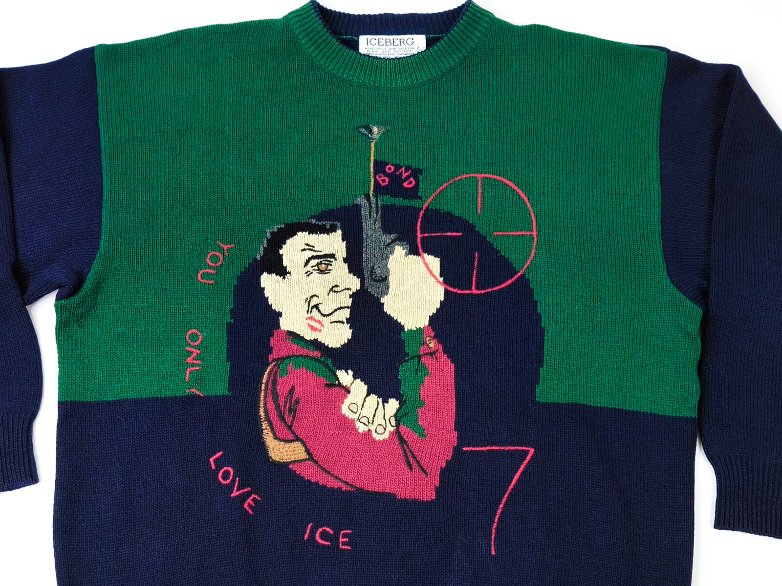 "Iceberg Strick Pullover James Bond dunkelblau / grün Gr. III (M/L) vintage"