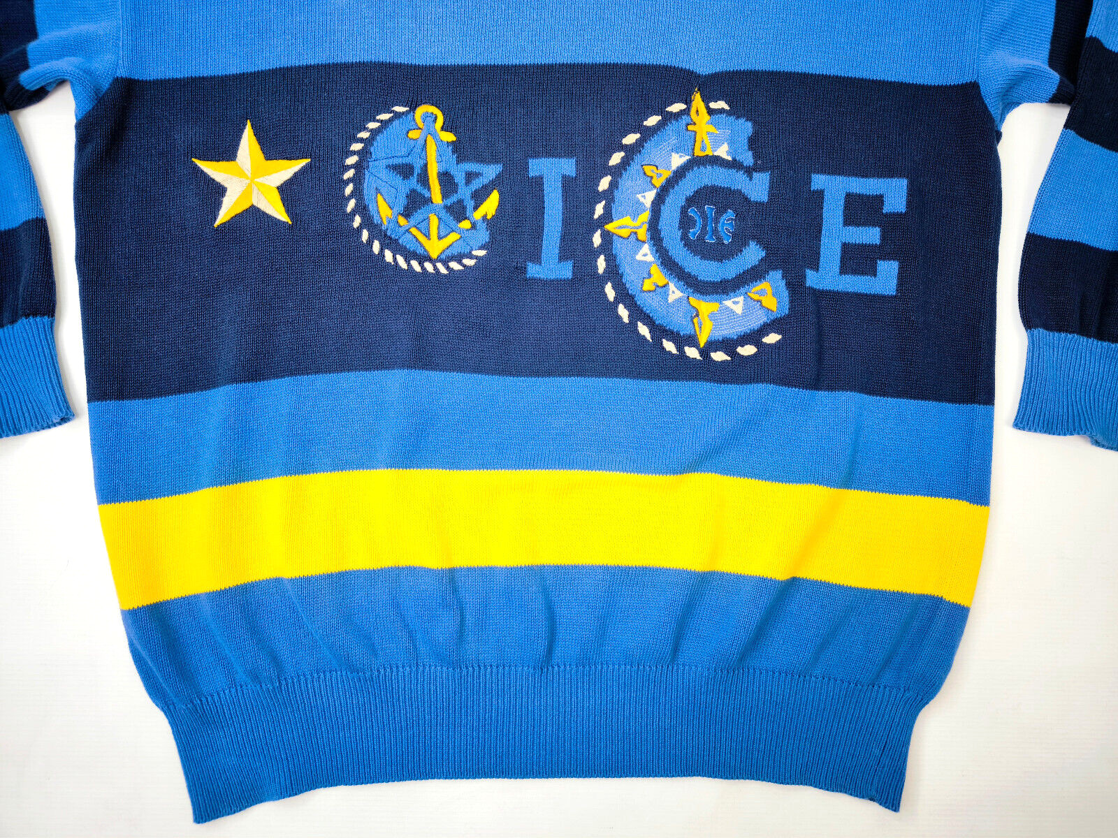 Iceberg Strick Pullover blau gelb Gr. XL (6) vintage