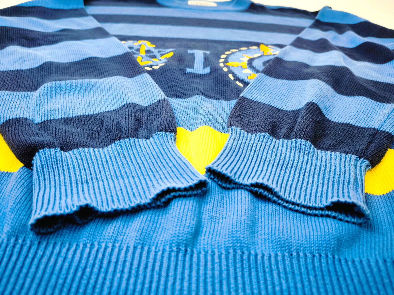 ________________________________________Marke: Iceberg Größe: M / LFarbe: dunkelblau / gelb Zustand: getragen________________________________________Beschreibung:Der Pullover wurde getragen und befindet sich in einem super schönen Zustand.Es sind nur wenige und dann kleine Trage- und Gebrauchsspuren zu erkennen.Am linken Ärmel zusätzlich mit kleinem Iceberg Logo.Made in Italy.Im Pullover ist die Größe L angegeben. Im Vergleich mit anderen Iceberg Pullovern von uns, fällt er etwas kleiner und hat eine ganz leichte Tendenz zur Größe M.Bitte die Maße prüfen für eine perfekte Passform.________________________________________Die ca. Maße sind wie folgt:Brustbreite von Achsel zu Achsel: 61cmÄrmellänge ab Höhe Schulter: 67cmRückenlänge inkl. Kragen: 68cm________________________________________Material lt. Innenlabel:Oberstoff: 85% Baumwolle / 15% ViscosePflegeanleitung:Maschinenwäsche 30 Grad