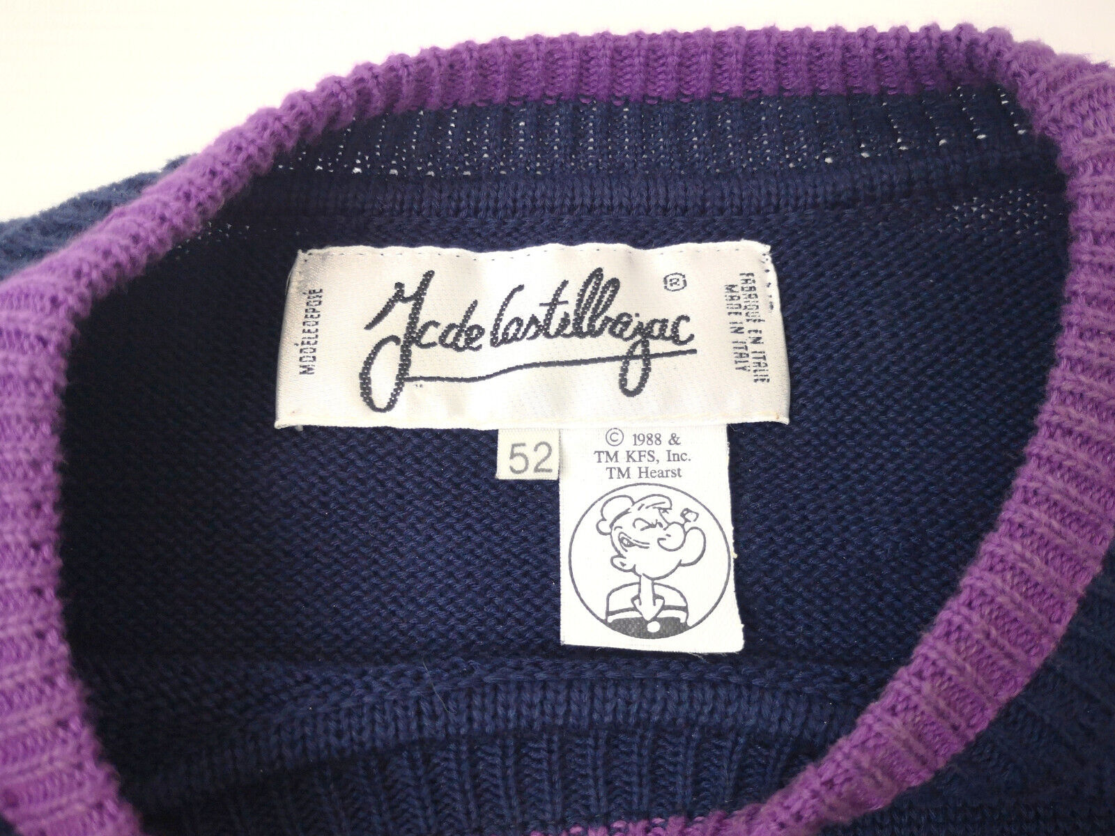 ________________________________________Marke: Ic de CastelbajacGröße: 52 (L/XL)Farbe: dunkelblau Zustand: neu________________________________________Beschreibung:Castelbajac Strick Pullover original aus den 1990er Jahren.Absolut ungetragen = neu mit Etikett.Sehr schöner und hochwertiger Pullover mit tollem bekannten Motiv.Im Pullover ist die Größe 52 angegeben. Im Vergleich mit anderen Iceberg Pullovern von uns, fällt er wie eine Größe L/XL.Bitte die Maße prüfen für eine perfekte Passform.________________________________________Die ca. Maße sind wie folgt:Brustbreite von Achsel zu Achsel: 60cmÄrmellänge ab Höhe Schulter: 67cmRückenlänge inkl. Kragen: 70cm________________________________________Material lt. Innenetikett:Oberstoff: 100% Baumwolle________________________________________Pflegeanleitung:Maschinenwäsche kalt