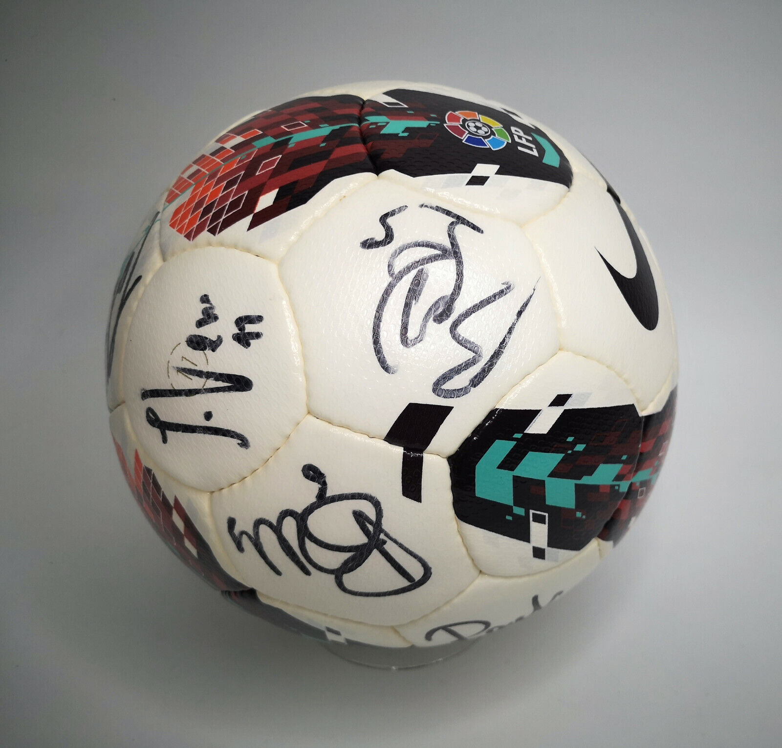 ______________________________________ Marke: NikeModell: NK 800 GEOGröße: 5Zustand: bespielt ______________________________________ Beschreibung:Nike Fußball Spanien La Liga / LFP Saison 1998 / 1999.Der Ball wurde bespielt und befindet sich in einem absolut guten Zustand.Es sind leichte Gebrauchsspuren zu erkennen und einige Paneele sind leicht rissig im Material durch das hohe Alter.Der Ball hält für einige Tage vollständig die Luft und muß dann wieder etwas mit Luft befüllt werden.Die weißen Ringe auf dem Ball sind nur vom Ring der Fotobeleuchtung und befinden sich nicht auf dem Ball !)