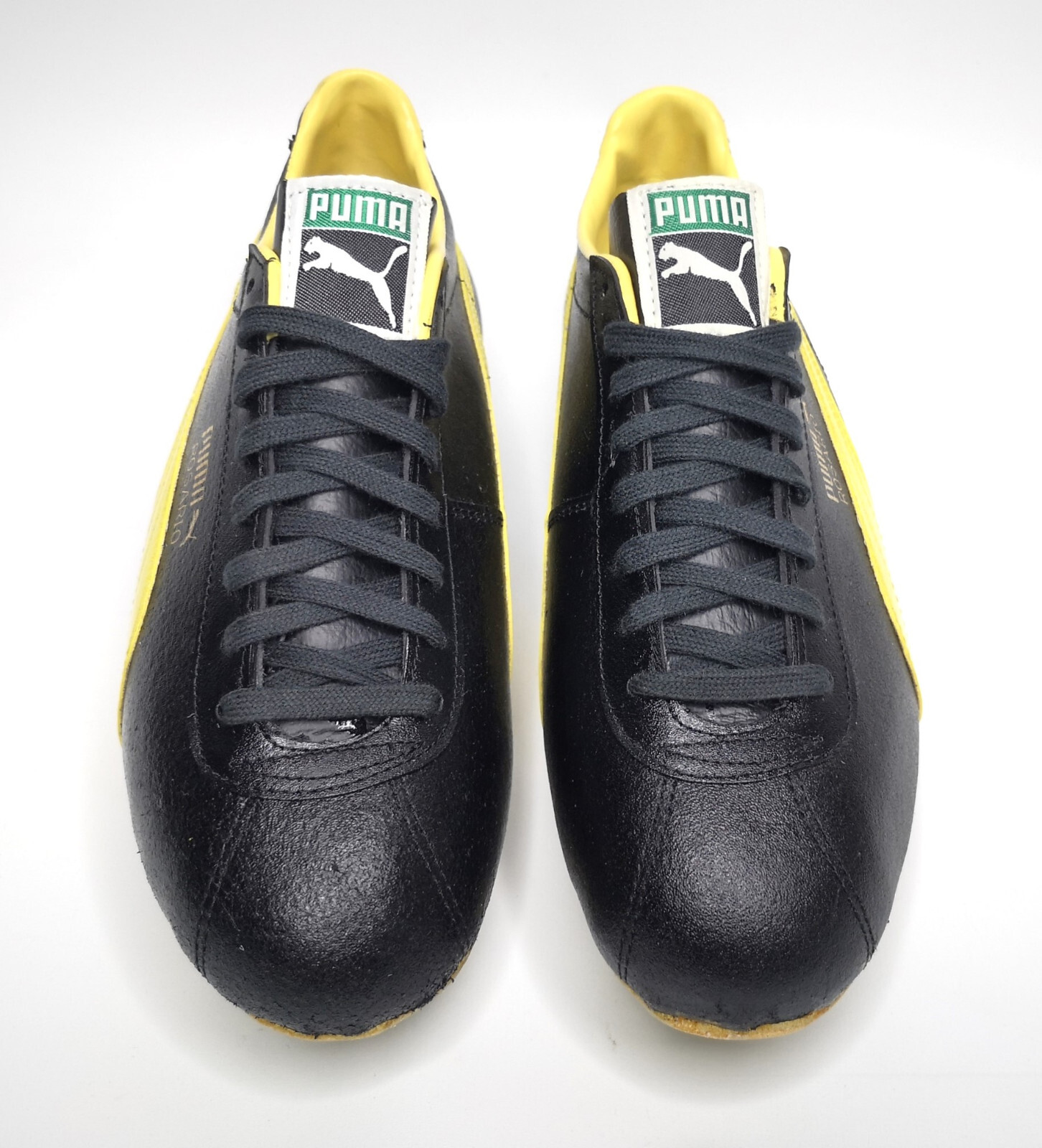________________________________________Marke: PonyModell: Pelé 10Modell: ca. UK 10 / US 10.5 / EUR 45Farbe: schwarz Zustand: sehr gut______________________________________Beschreibung:Die Schuhe befinden sich in einem sehr guten Zustand.Es sind nur leichte Tragespuren am Obermaterial, im Innenbereich und etwas stärker an den unteren Laufsohlen zu erkennen.Pelé selbst trug Pony Fussballschuhe ausschließlich in seiner Zeit bei den New York Cosmos in den USA, wo er Ende der 1970er Jahre spielte und auch dort seine Karriere beendete.Die Schuhe stammen auch aus den späten 1970er Jahren.Das vorletzte Foto zeigt eine Werbung der Firma Pony mit diesem Schuh.Diese Werbung war die letzte Seite eines französischen Fussball Magazin vom Februar 1978.Innen beider Schuhe ist ein Stempel mit "Made in RDA".RDA war seinerzeit die Abkürzung für Ost-Deutschland.Es ist keine Größe im Schuh zu finden.Die Länge der Außensohlen beträgt ca. 29cm.Im Vergleich mit anderen Fussballschuhen von uns aus den 1970er Jahren, ist die Größe etwa eine UK 10 - UK 10.5.Ein toller und seltener, alter Fussballschuh der Firma Pony und eine Homage an King Pelé.______________________________________Obermaterial:100% Leder