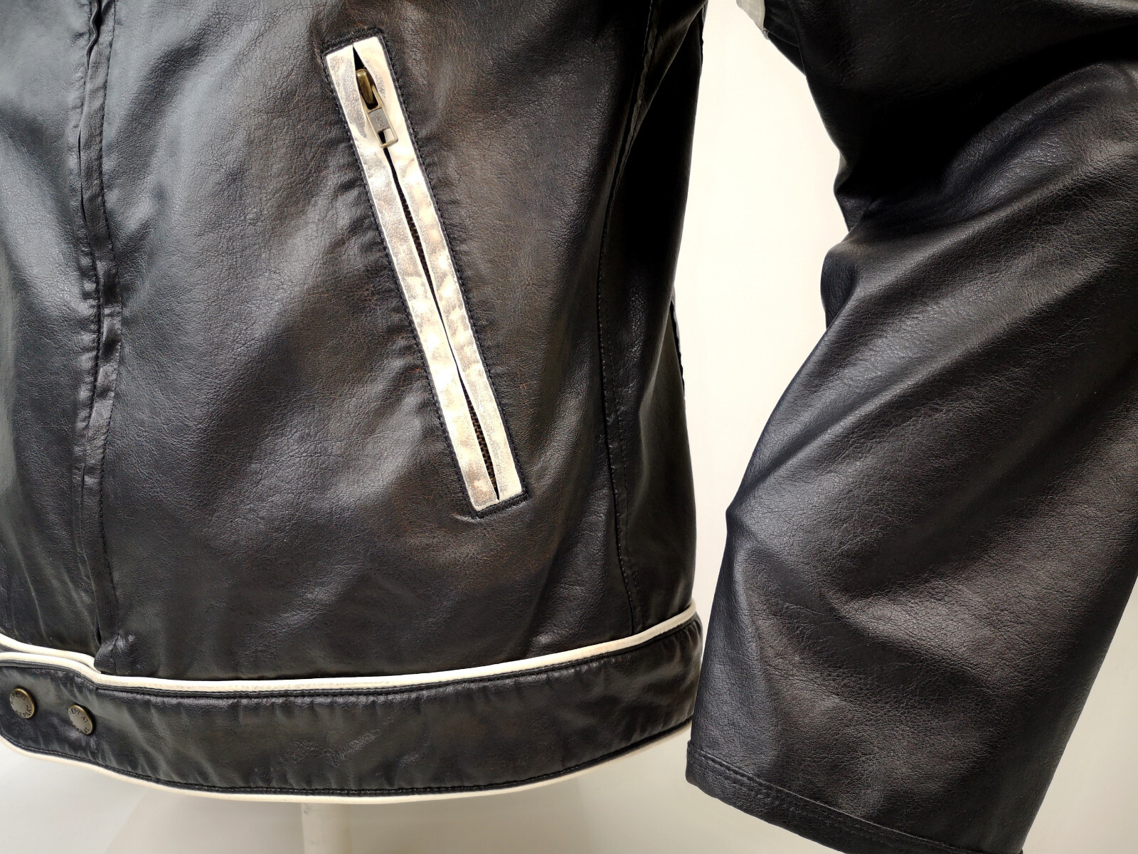 Jede dieser Jacken ein Unikat durch die gewollten used Effekte am schwarz, am hellen Leder sowie den großen Buchstaben auf dem Rücken.