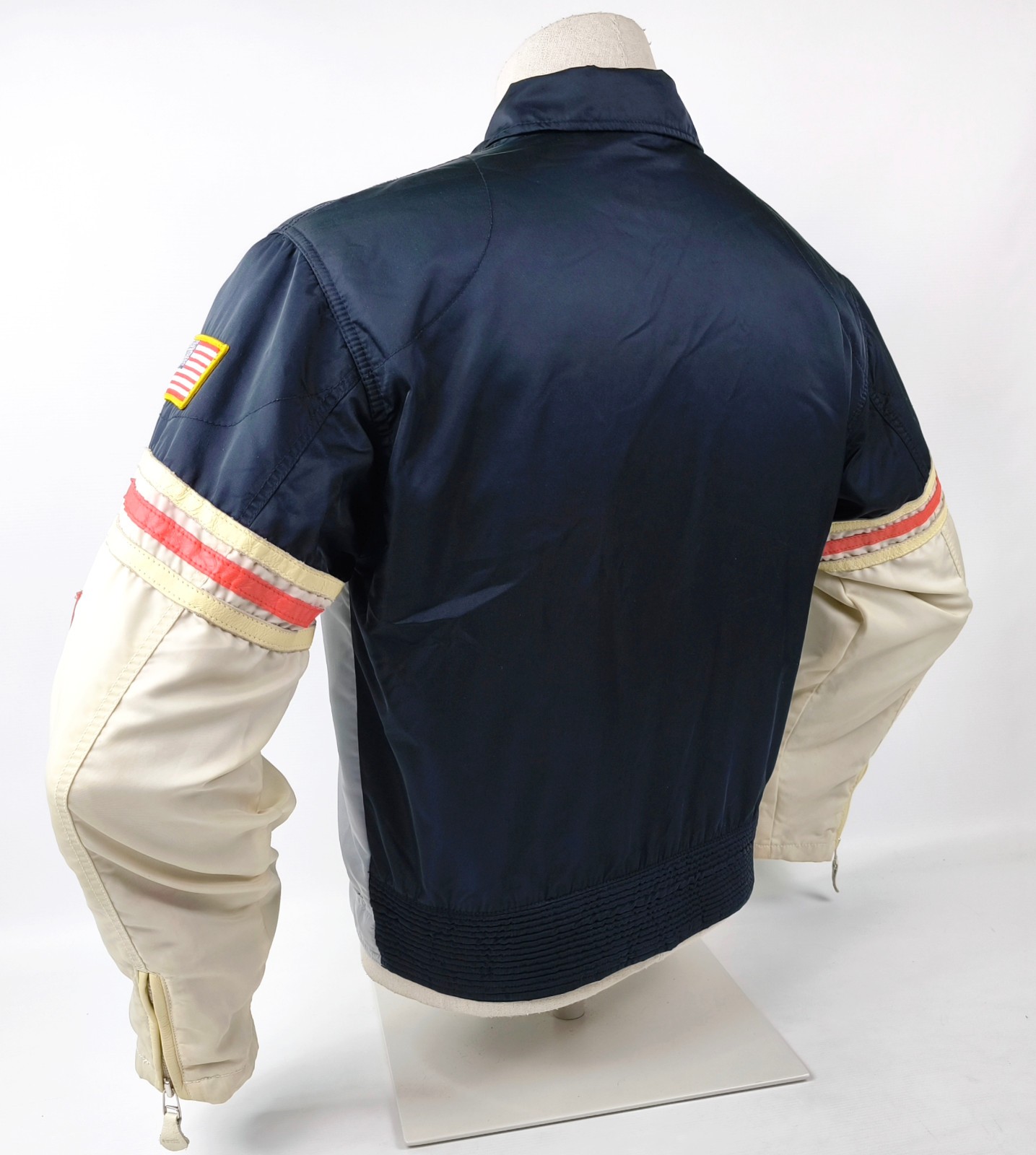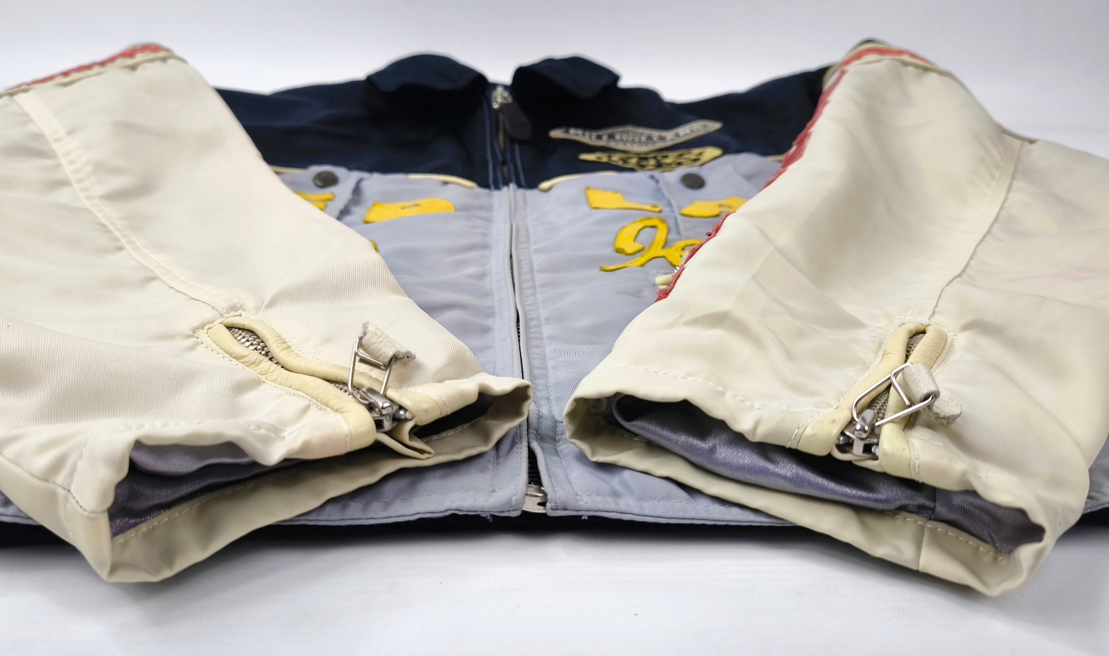 Leder und Nylon im Außenbereich mit wenigen Gebrauchsspuren im unteren Ärmelbereich und super gut im Zustand.