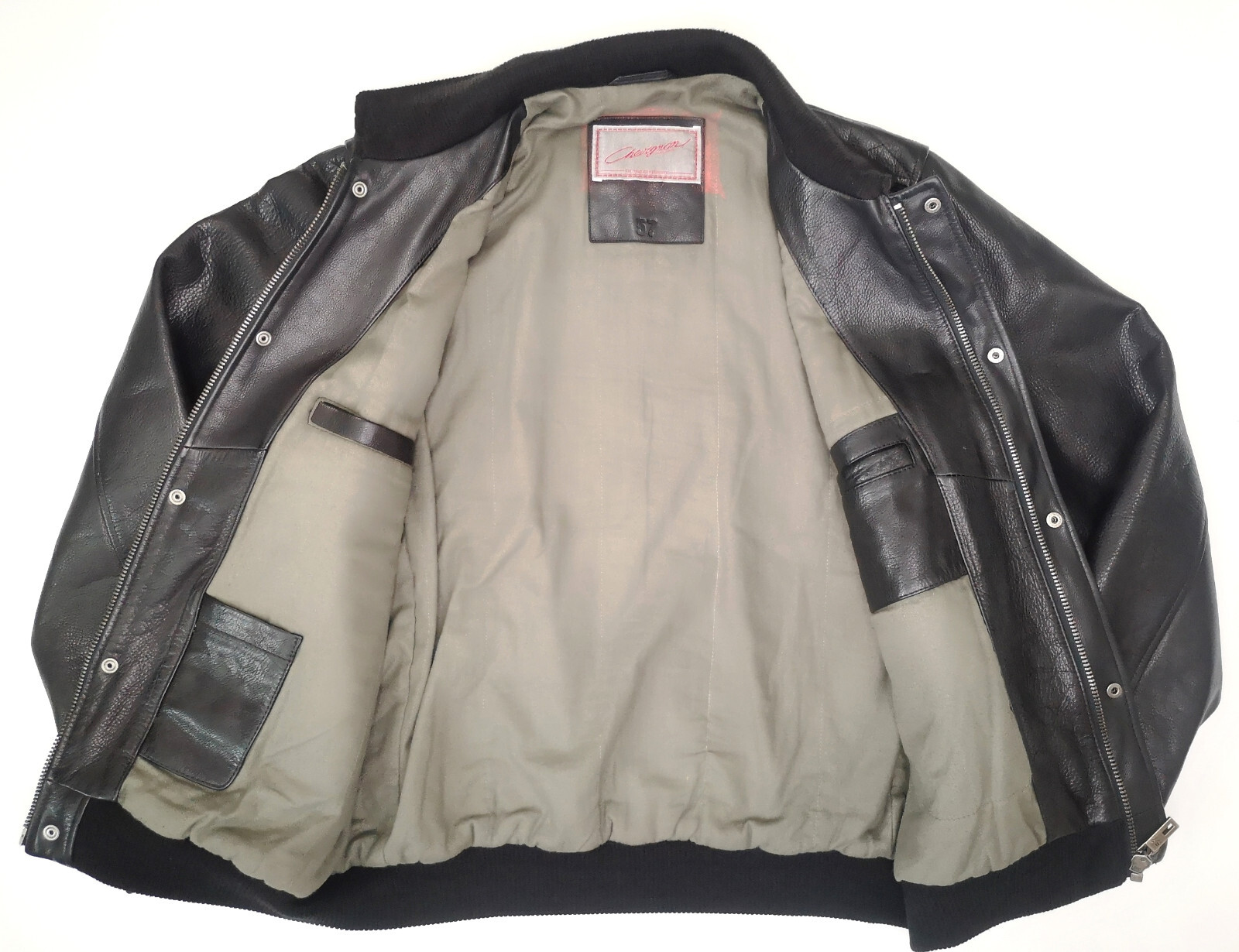 _______________________________________ Marke: ChevignonFarbe: Innen beige / Lederärmel lachsfarbenGröße: L Zustand: getragen _______________________________________ Beschreibung:Chevignon Herren Jacke mit russischer Label Schrift auf dem Rücken.Die Jacke befindet sich in einem sehr schönen Zustand.Leichte Gebrauchsspuren im beigen Baumwollbereich.Lederärmel sehr gut erhalten !Innenfutter ganz leichte Scheuerung über dem Bund und unter dem Kragen.Sonst sehr schön erhalten.Bündchen...sehr schön !Druckknöpfe schließen tadellos.Sehr alte und seltene Chevignon Jacke im immer noch tollen Zustand ! _______________________________________ Die ca.Maße sind wie folgt:Brustbreite von Achsel zu Achsel: 63cmÄrmellänge ab Schulter: 67cmRückenlänge inkl. Kragen und Bund: 66cm _______________________________________ Material lt Innenetikett:Außen:Ärmel 100% Leder und innen 100% BaumwolleFutter: 100% Acetate _______________________________________ Pflegeanleitung:professionelle Textilreinigung