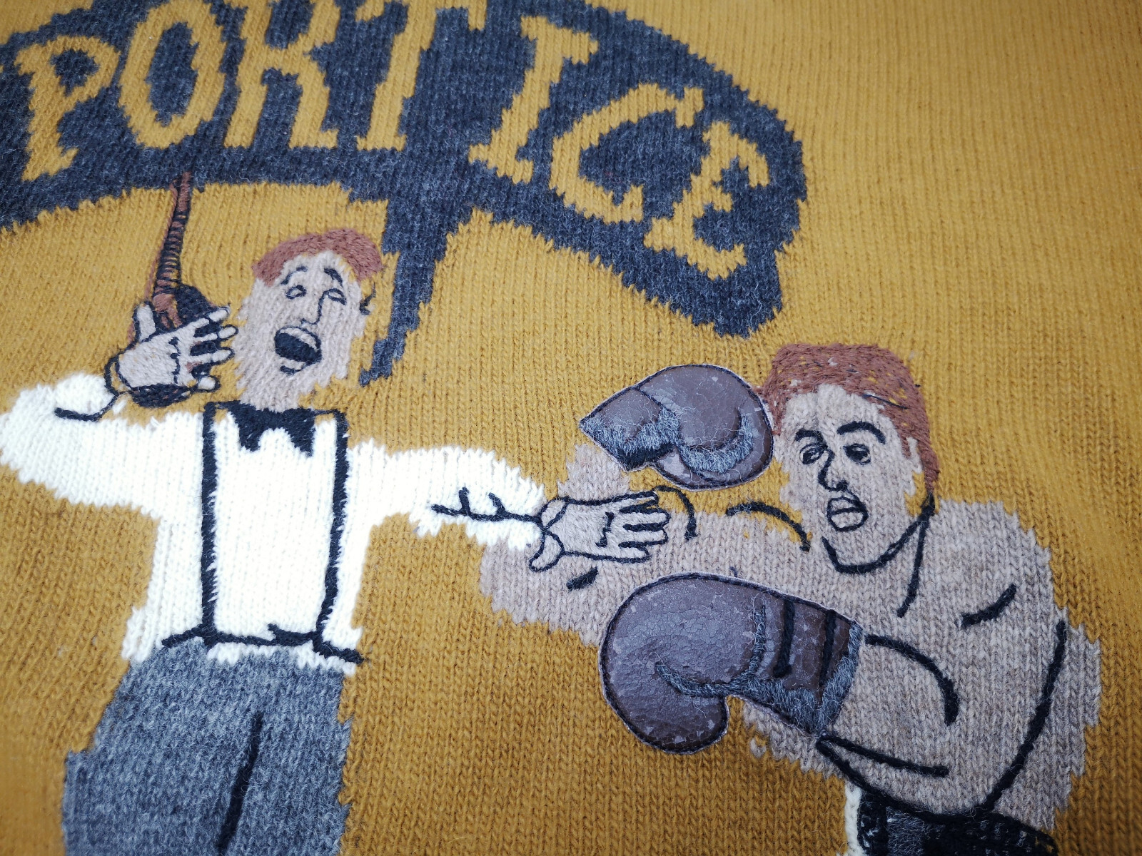 Die Lederapplikationen der Boxhandschuhe und Boxschuhe lösen sich und blättern leicht ab, was dem Alter zu schulden ist.
