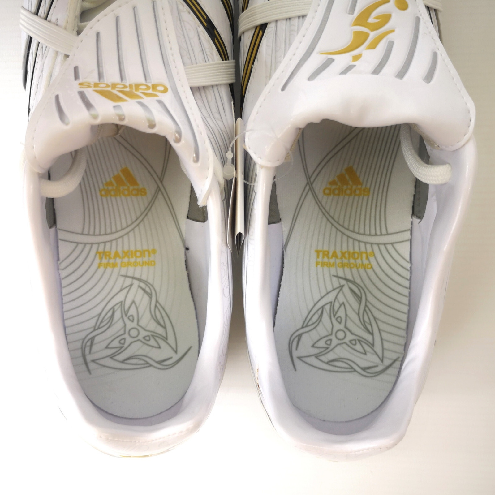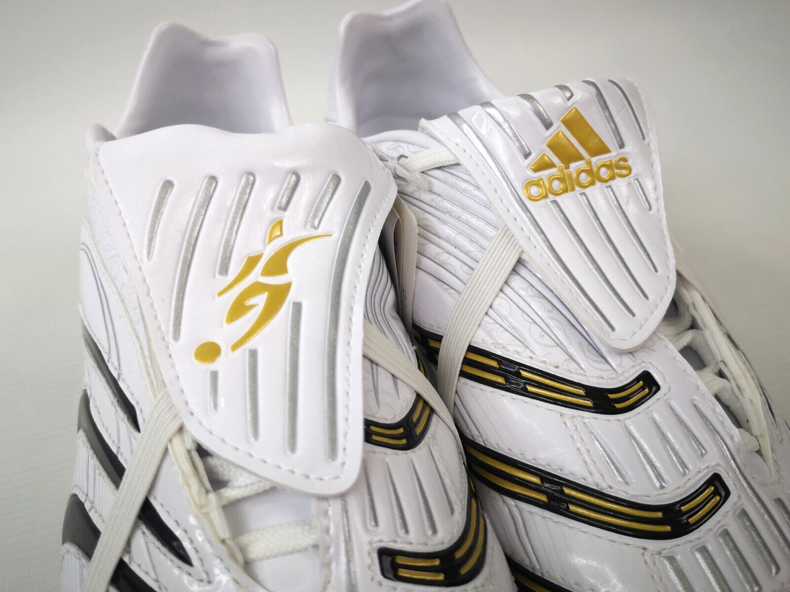 ________________________________________Marke: adidasModell: Predator Absolute (2006)Modell: MTM (made to measure)Spieler: Mark van BommelVerein: Bayern MünchenGröße: Eur 41 1/3 / UK 7 1/4 / US 8Farbe: gold / schwarzZustand: match issued / für den Spieler vorbereitet________________________________________Beschreibung:Match Issued / vorbereitet für den ehemaligen holländischen Nationalspieler Mark van Bommel der Saison 2006/07.Die erste Saison die er für Bayern München gespielt hat.Die Schuhe wurden eigens für Mark van Bommel angefertigt.Made in Germany / MTM made to measure.Die Größe ist eine UK 7 3/4, so auch nie im freien Handel erhältlich gewesen.Auf beiden Laschen befinden sich eingestickt die Namen seiner Kinder Thomas, Renee und Ruben.Metallöse für die Schnürung an beiden Schuhen eigens für ihn hergestellt (siehe Foto mit rotem Pfeil)In beiden Schuhen ist das Größenetikett vorhanden.Schuhe sind ungetragen und wurden nicht benutzt.Ein fantastisches Paar Fußballschuhe eines tollen und einzigartigen holländischen Fußball-Spielers.