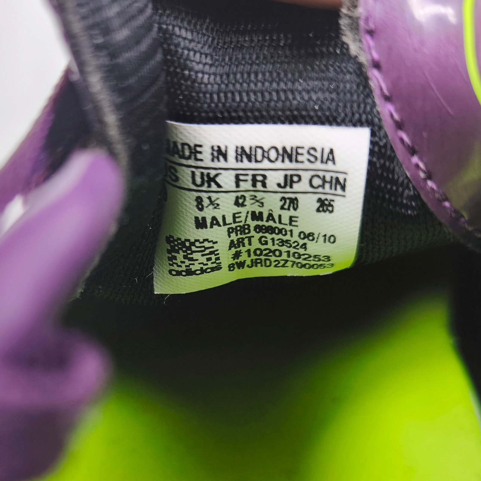 ________________________________________Marke: adidasModell: F30 TRX FG / G40287Größe: UK 13 / US 13.5 / Eur 48 2/3Farbe: neongelb / purple / orange Zustand: neu_______________________________________Beschreibung:Der Schuh ist neu und ungetragen im Karton (ohne Etikett).Ein Super Light Modell aus dem Jahr 2011.Absolut ungetragen._______________________________________Material:100% Synthetic