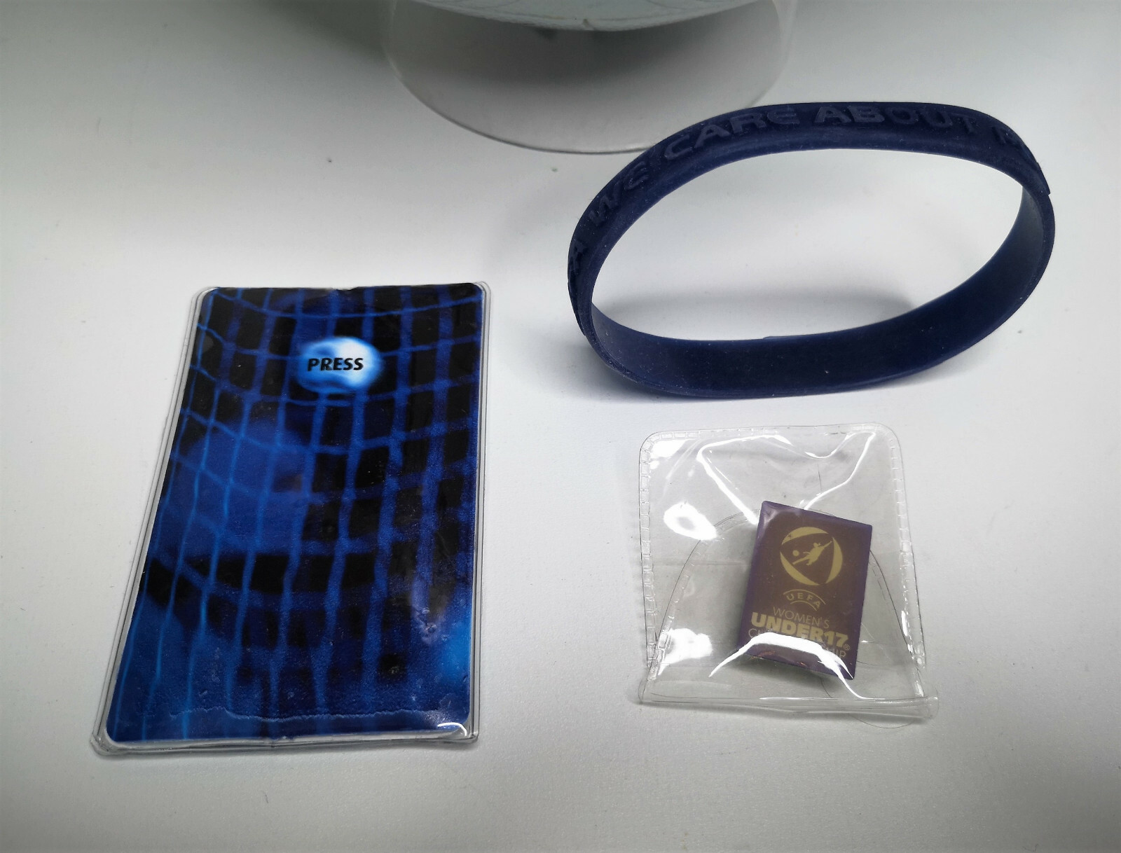Ebenfalls dazu gehören drei Merchandise Artikel: Pin, Taschenlampe und Armreif aus Gummi (siehe Foto).