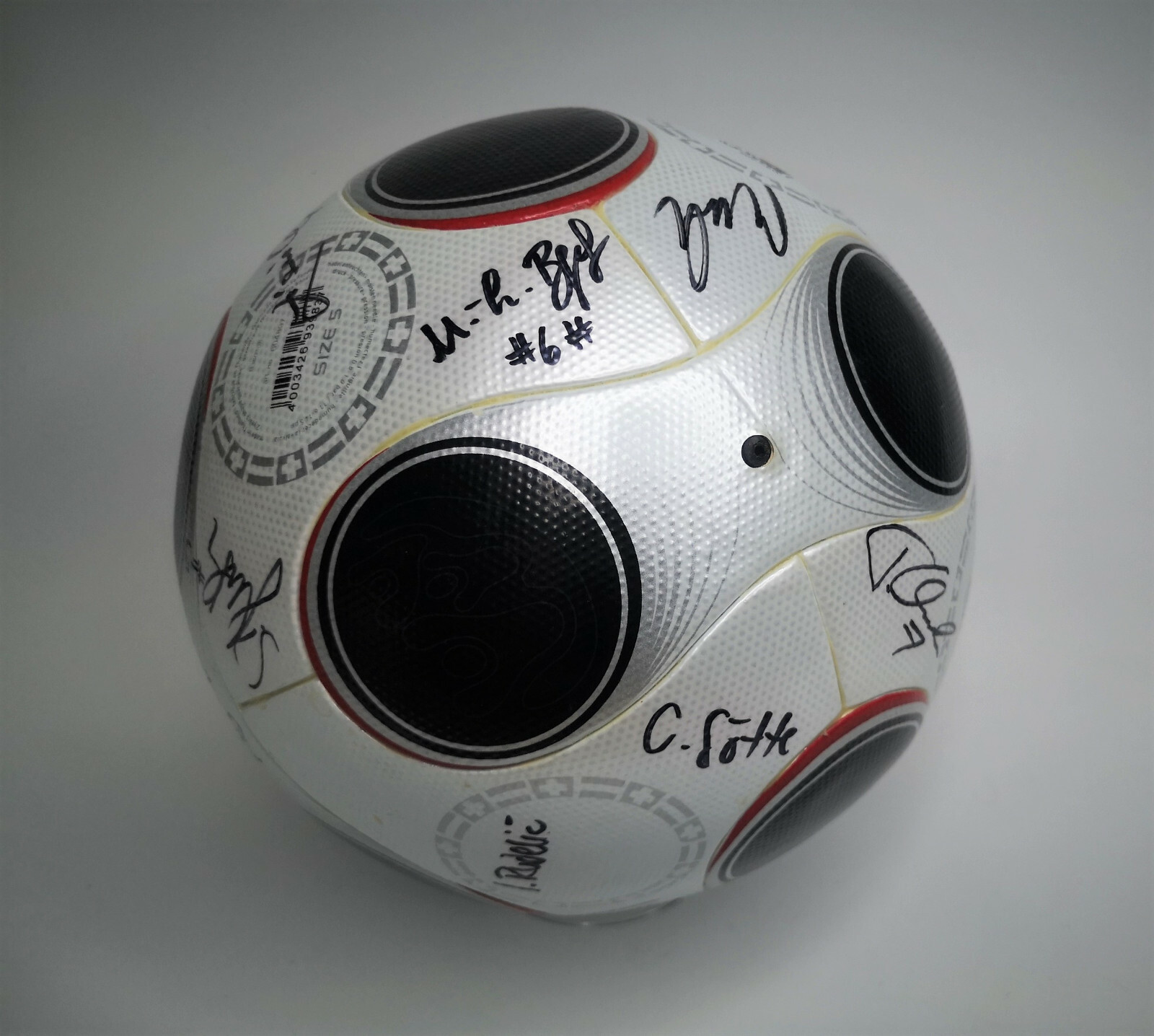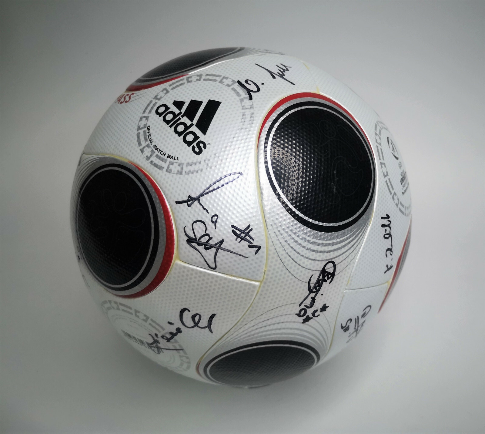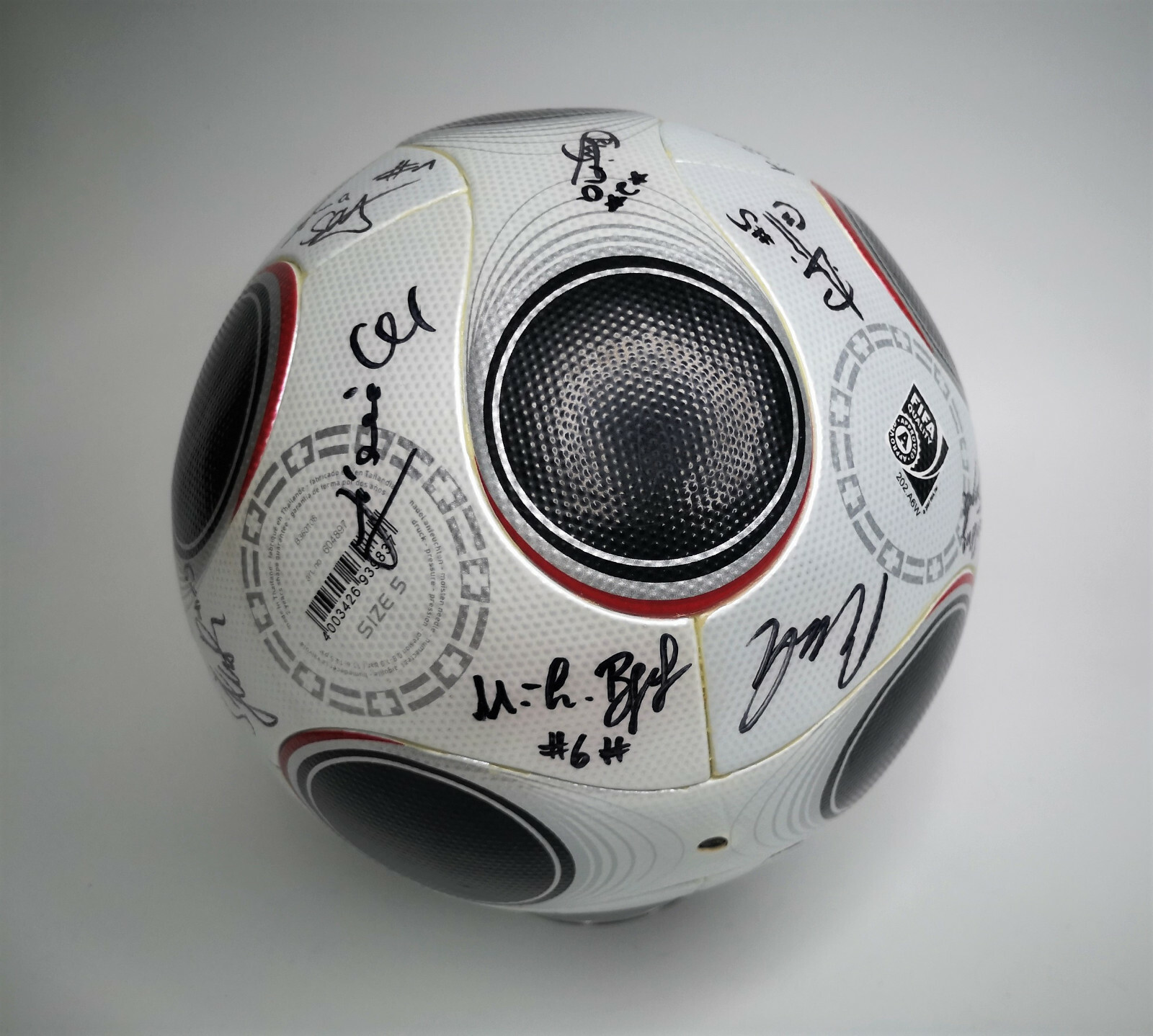 ________________________________________Marke: adidasModell: PeliasTurnier: Confederations Cup 2005Größe: 5Zustand: unbespielt ________________________________________Beschreibung:adidas Fussball Pelias.Official Match Ball / Offizieller Spielball des Confederations Cup 2005.Der Ball wurde beim Halbfinale des Confederations Cup 2005 in Nürnberg zwischen Deutschland und Brasilien am 25.06.2005 original unterschrieben von:Frank Beckenbauer, Jürgen Klopp, dem ehemaligen FIFA Schiedsrichter Urs Meier und dem deutschen Fernsehmoderator Johannes B. Kerner.Der Ball hat durch die lange Lagerung leichte Faltenbildung an den Paneelen.Ist neu und unbespielt !Hält die Luft perfekt !Toller Fussball des Confed Cup 2005, signiert von mindestens einer Legende des deutschen Fußballs !
