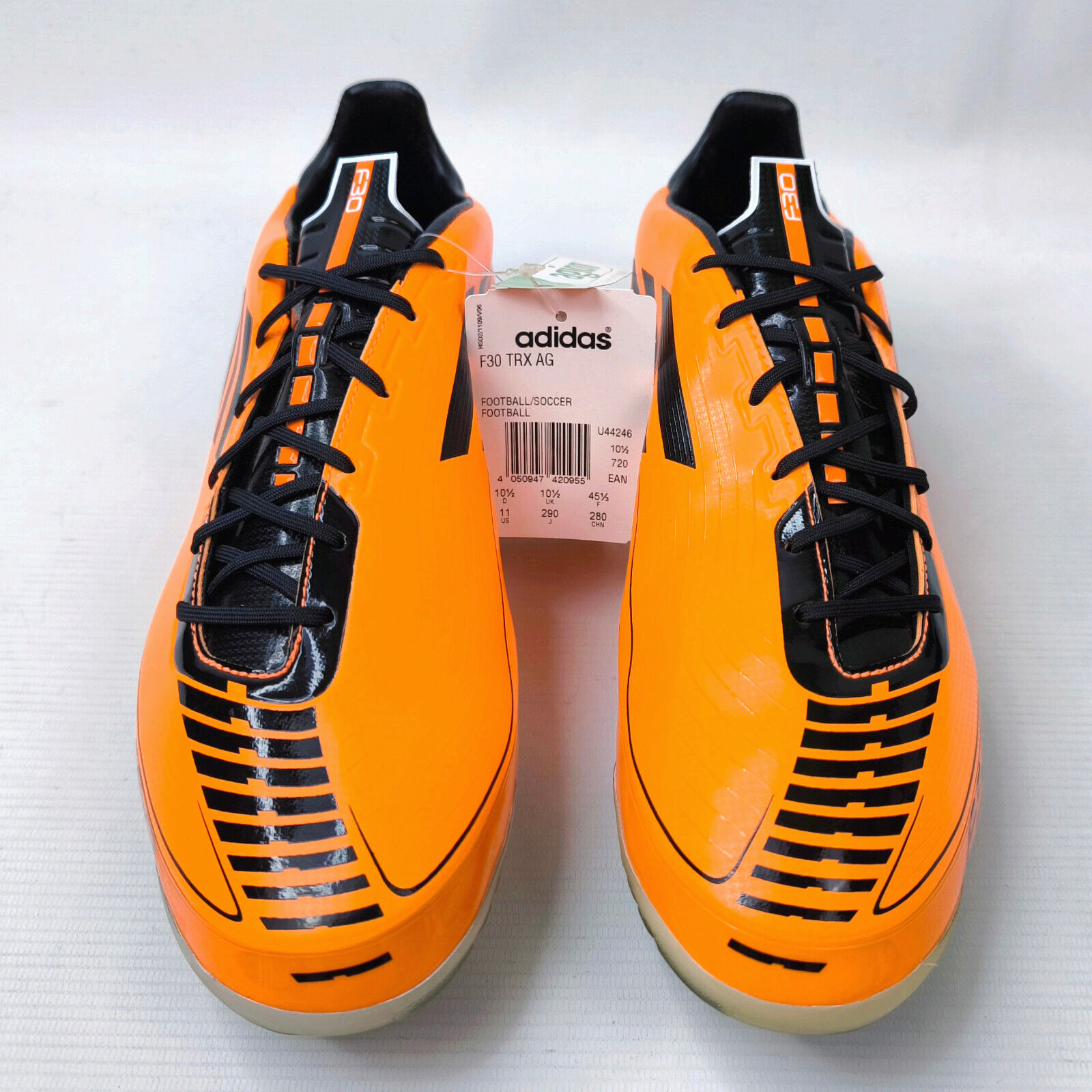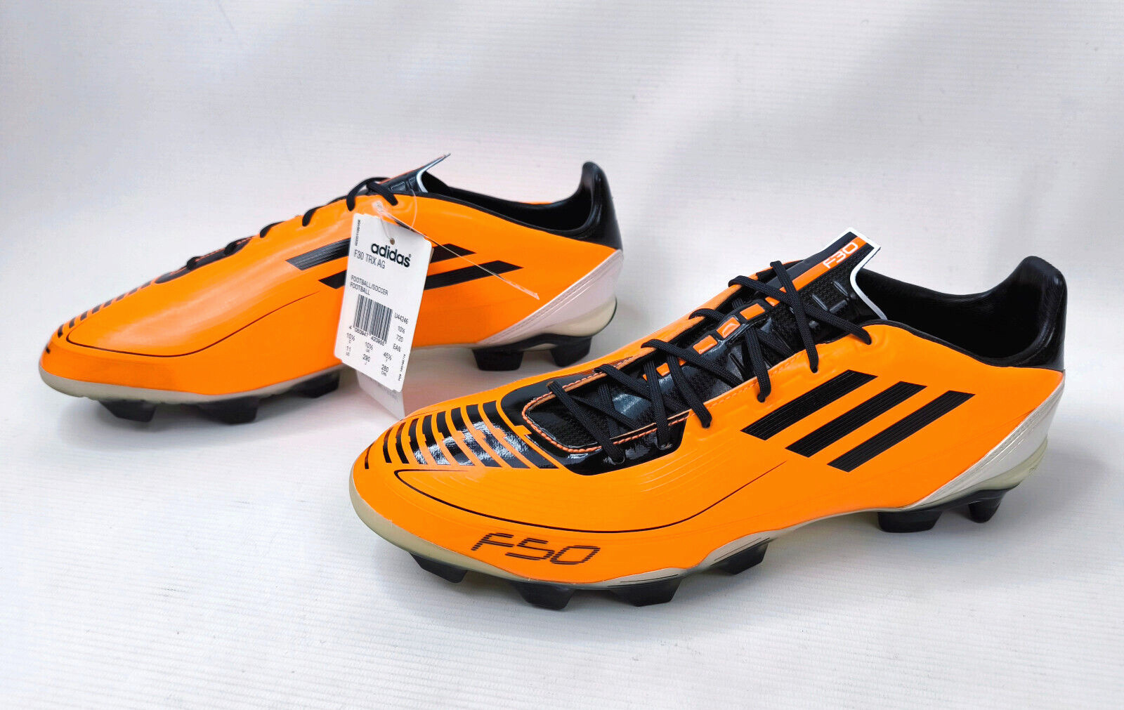 ________________________________________Marke: adidasModell: F10 TRX FG / U41869Größe: Eur 41 1/3 / UK 7.5 / US 8Farbe: orange / schwarz Zustand: neu_______________________________________Beschreibung:Die Schuhe sind neu und ungetragen mit Etikett (ohne Karton).Ein adidas super lightweight Modell aus dem Jahr 2010.Neu und ungetragen.