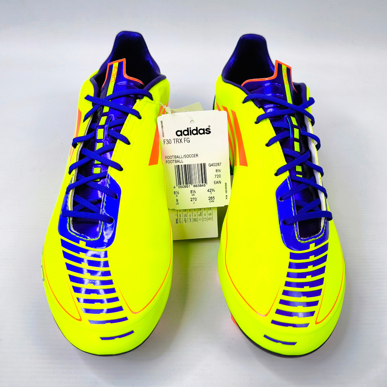 ________________________________________Marke: adidasModell: F30 TRX FG SYN / V24845Größe: Eur 42 2/3 / UK 8.5 / US 9Farbe: gelb / orangeZustand: neu_______________________________________Beschreibung:Die Fussballschuhe sind neu und ungetragen im Karton.Ein Ultra Light Modell aus dem Jahr 2011.