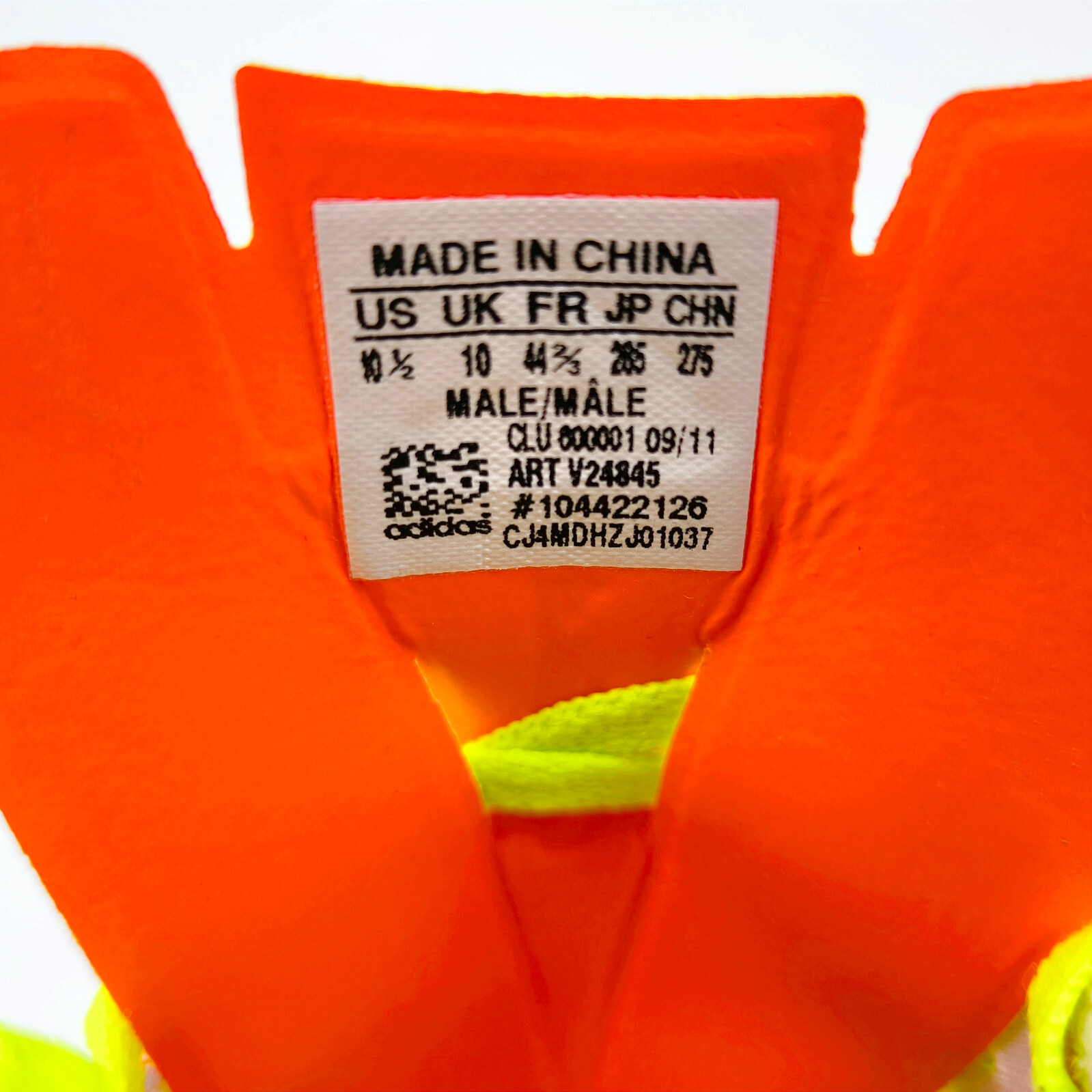 ________________________________________Marke: adidasModell: F10 MG / G40250Größe: UK 9 / US 9.5 / Eur 43 1/3Farbe: neongelb / purple / orange Zustand: neu________________________________________Beschreibung:Der Schuh ist neu und ungetragen im Karton.Ein lightweight adidas Fussballschuh aus dem Jahr 2011.Multiground.________________________________________Material: 100% Synthetic