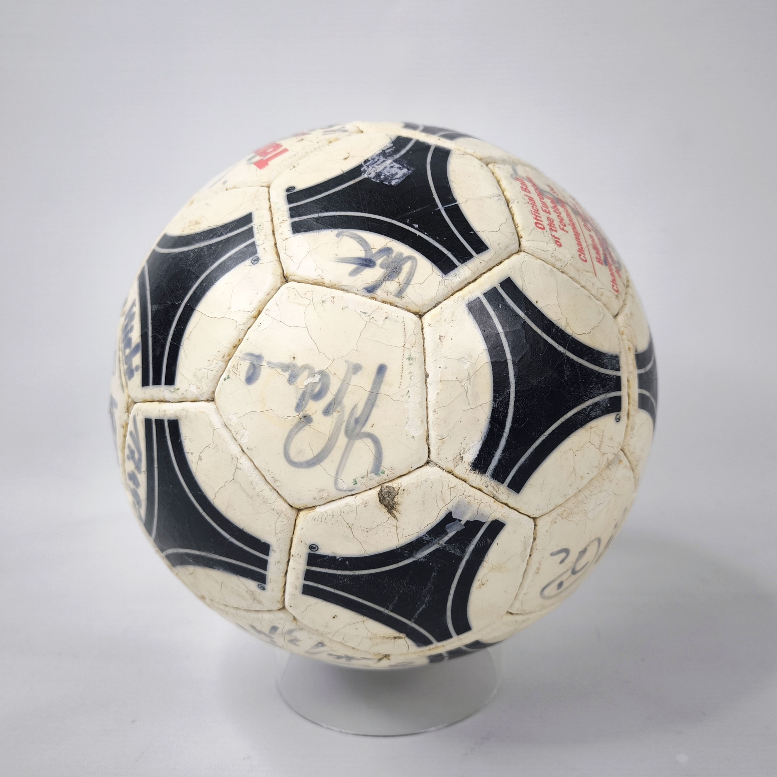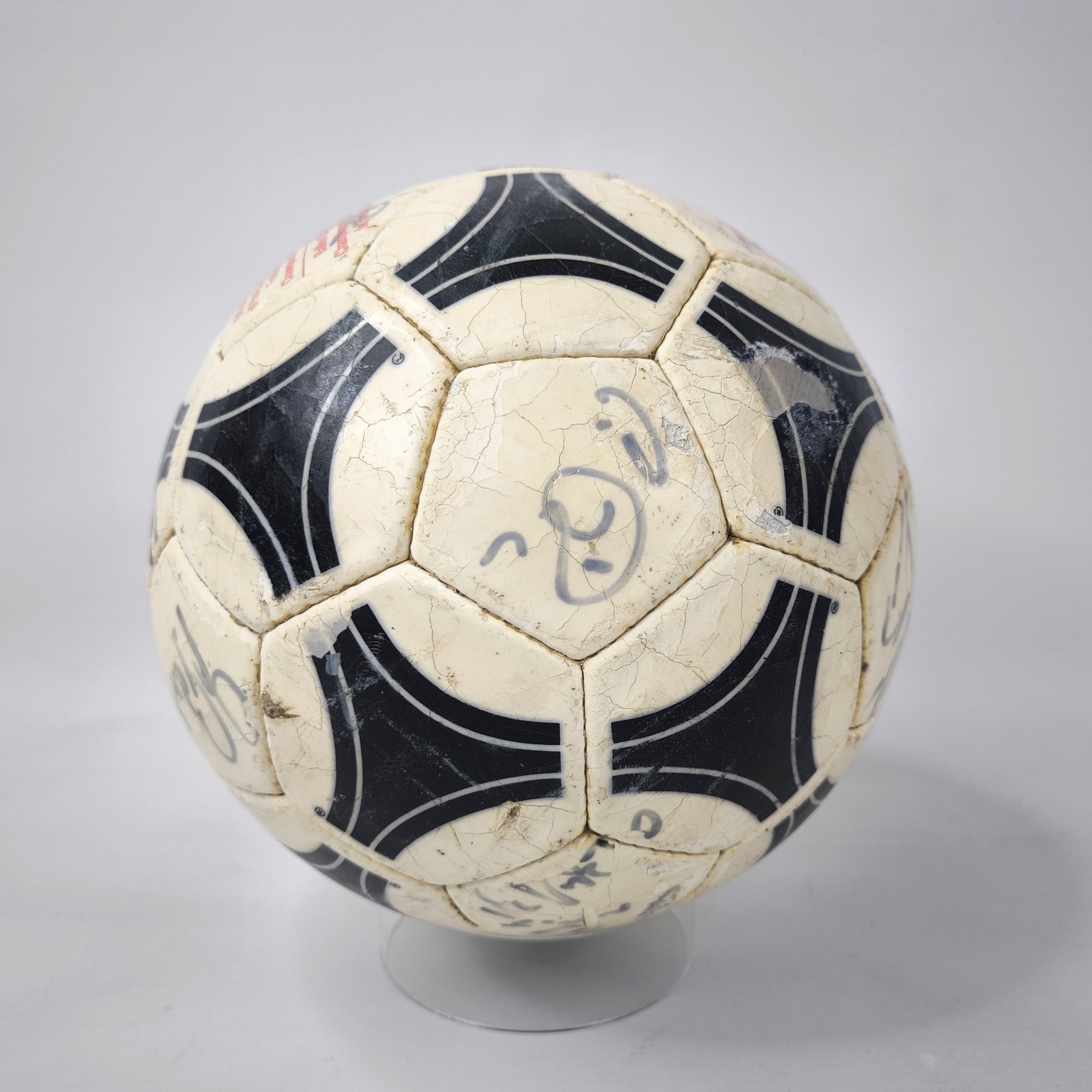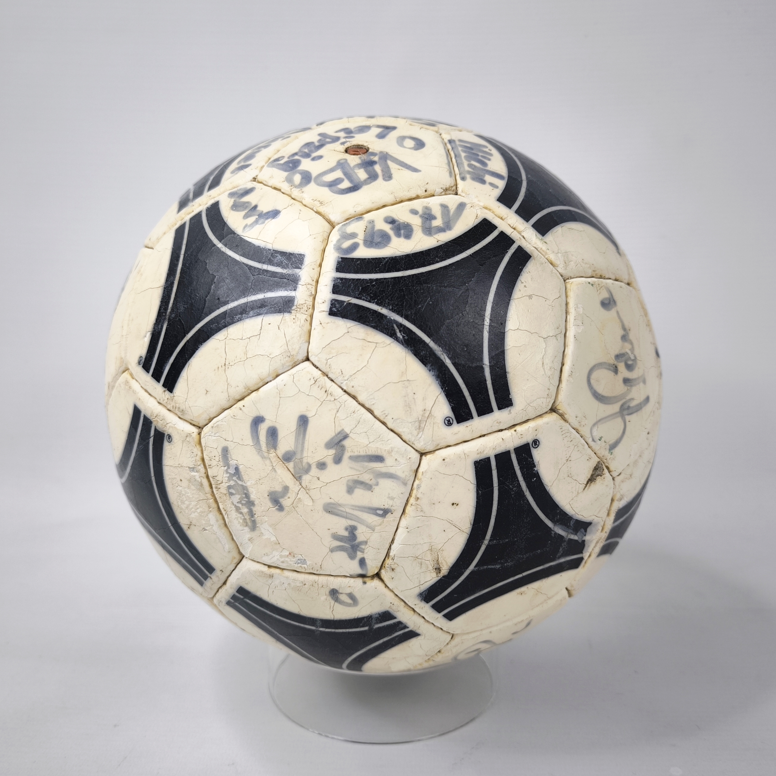 ________________________________________Marke: adidasModell: WM 82Größe: 5Zustand: unbespielt________________________________________Beschreibung:adidas Fussball WM 82.Unbespielter und neuer Ball.Signiert ist er von der deutschen Fussball Nationalmannschaft 1982.Der Fußball ist optisch das Modell Chile Durlast, wie er original zur WM 1974 und zur EM 1976 benutzt wurden.Unterschrieben haben unter anderem:Trainer Jupp Derwall, Lothar Matthäus, Karl-Heinz Rummenigge, Bernd Franke, Toni Schumacher, Felix Magath, Horst Hrubesch und Pierre Littbarski.Auf Grund des Alters läßt er sich nicht mehr aufpumpen und die Blase ist leicht hörbar im Ball.Der Ball hat seine runde Form aber absolut beibehalten.Toller und seltener Fussball aus dem Jahr 1982 und original signiert.
